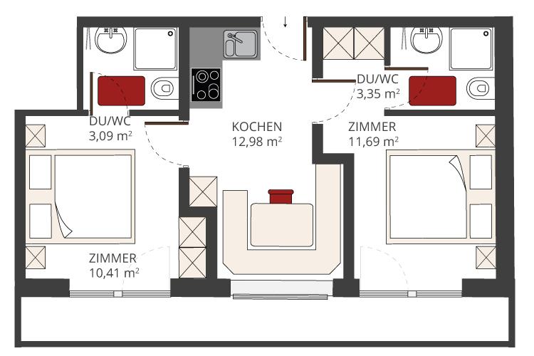 Modernes und hell eingerichtetes Appartement mit 2 Schlafzimmer mit Flat-TV und Balkon mit herrlicher Aussicht. 2 Badezimmer jeweils mit Dusche/WC und Haarföhn. Die Wohn-Essecke ist komplett ausgestattet mit gemütlichem Essbereich. Größe ca. 42 m².