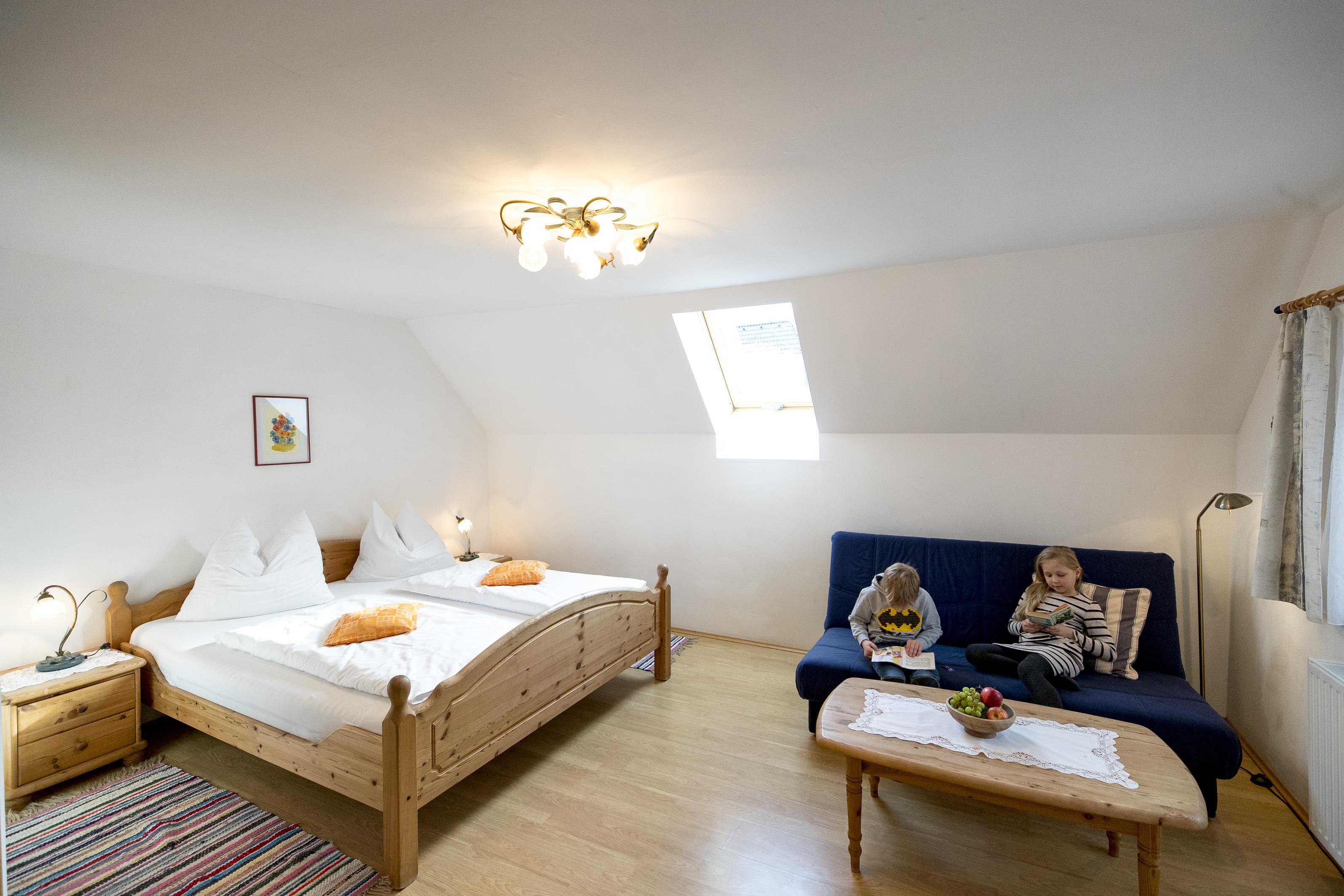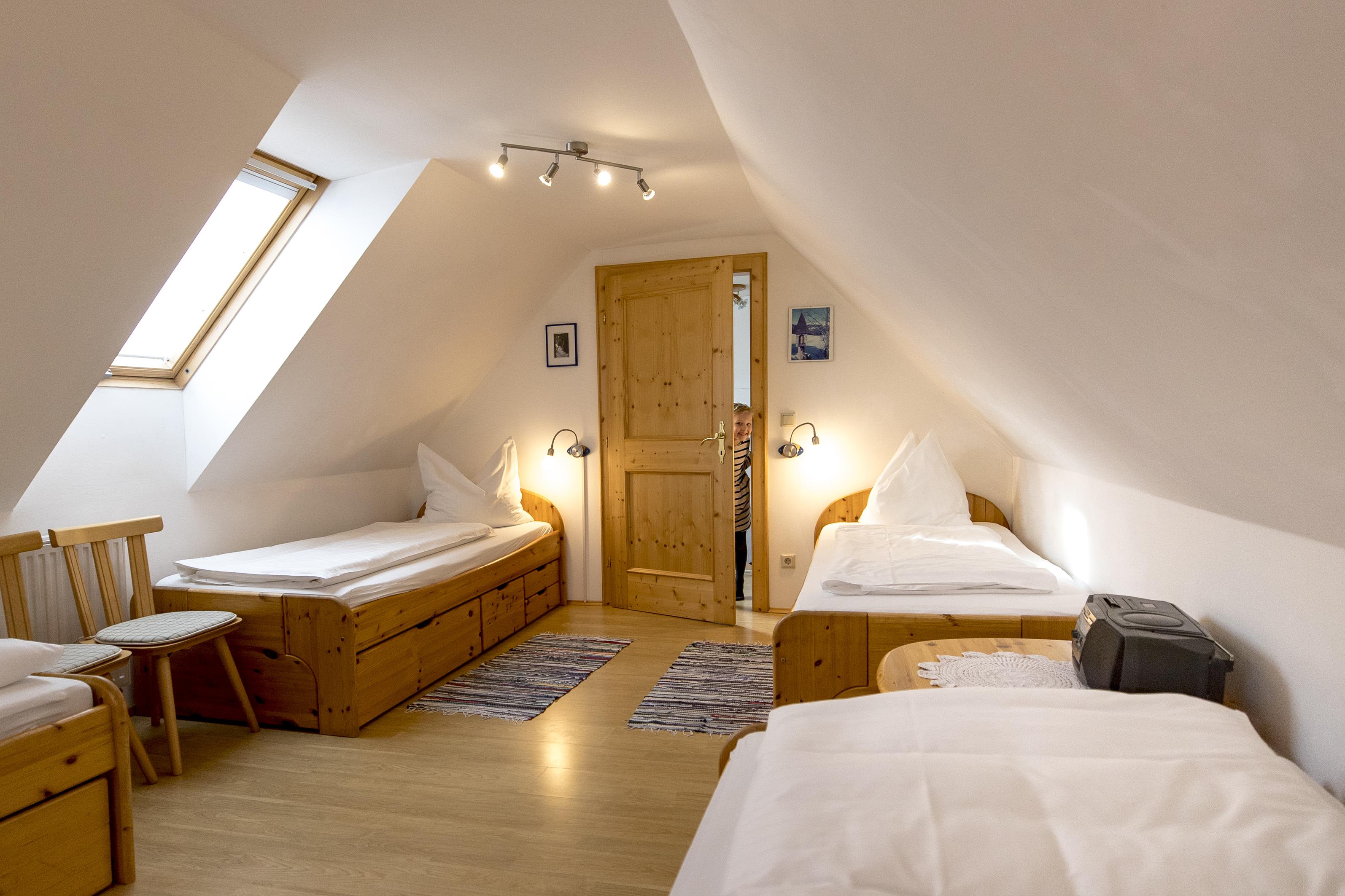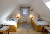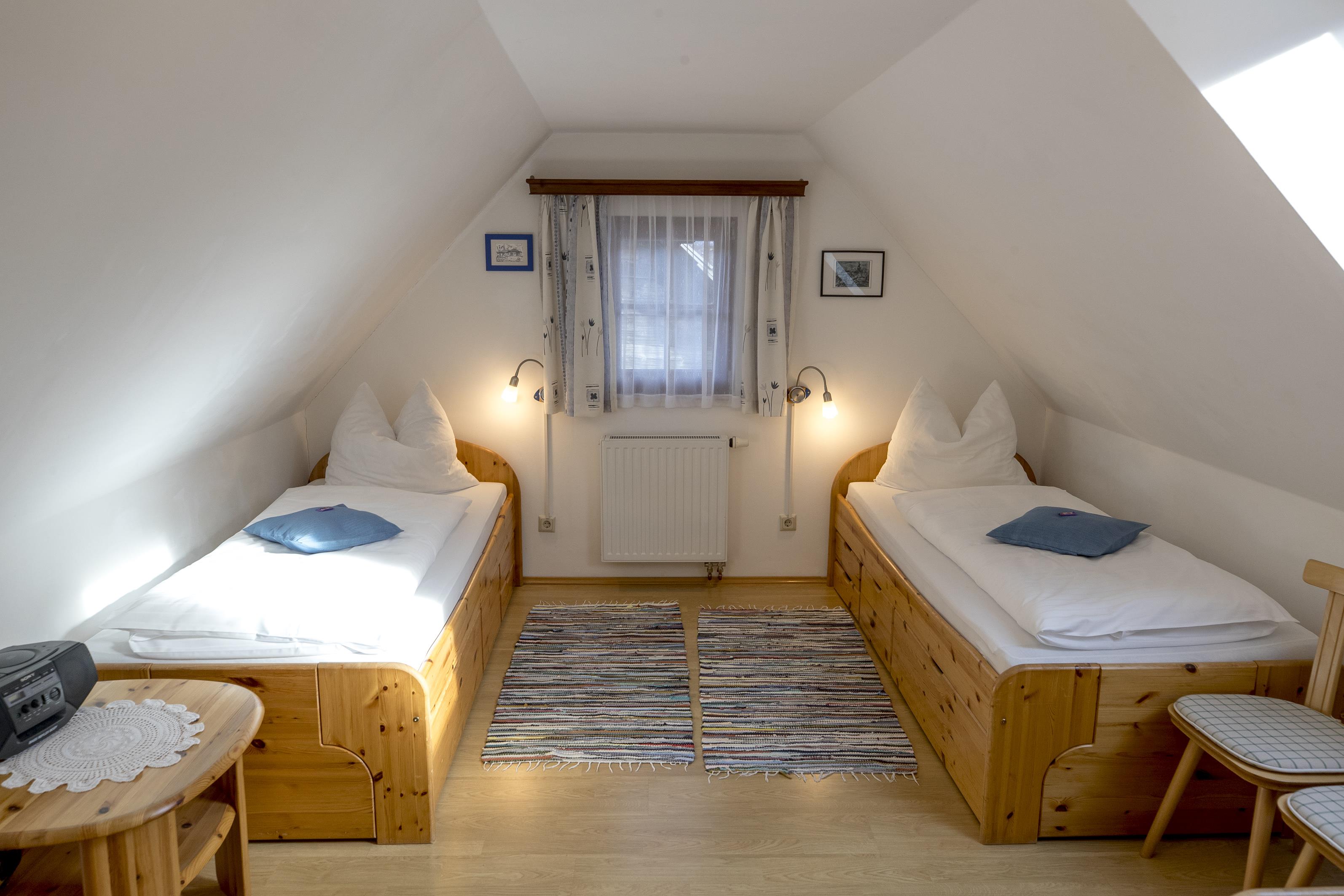 Ferienwohnung I: wo Sie über eine Wendeltreppe ins Mansardenzimmer mit vier Einzelbetten gelangen. Im unteren Stock befindet sich eine geräumige Wohnküche mit Boxspringbett für 2 weitere Personen. Badezimmer und WC sind getrennt.