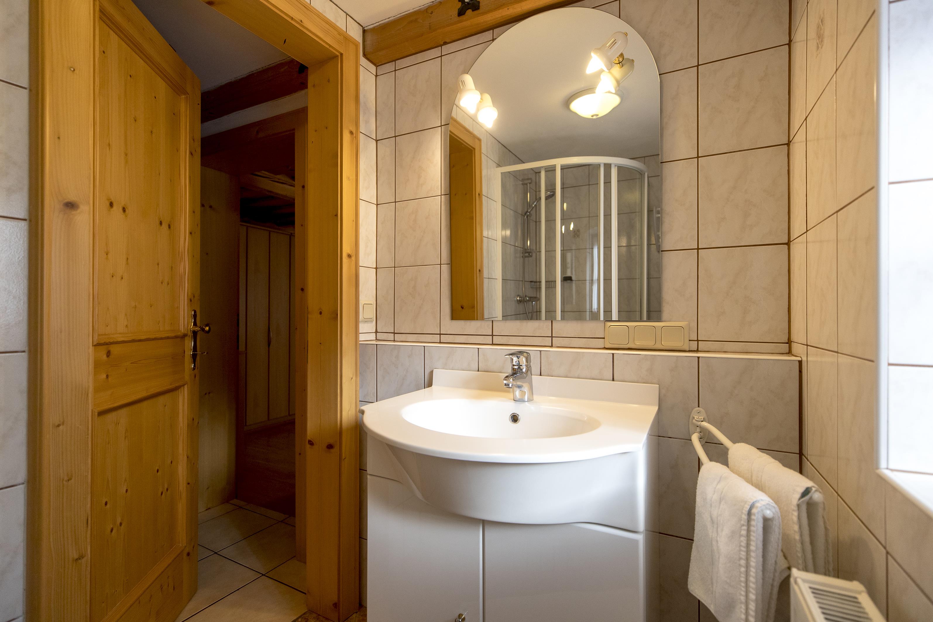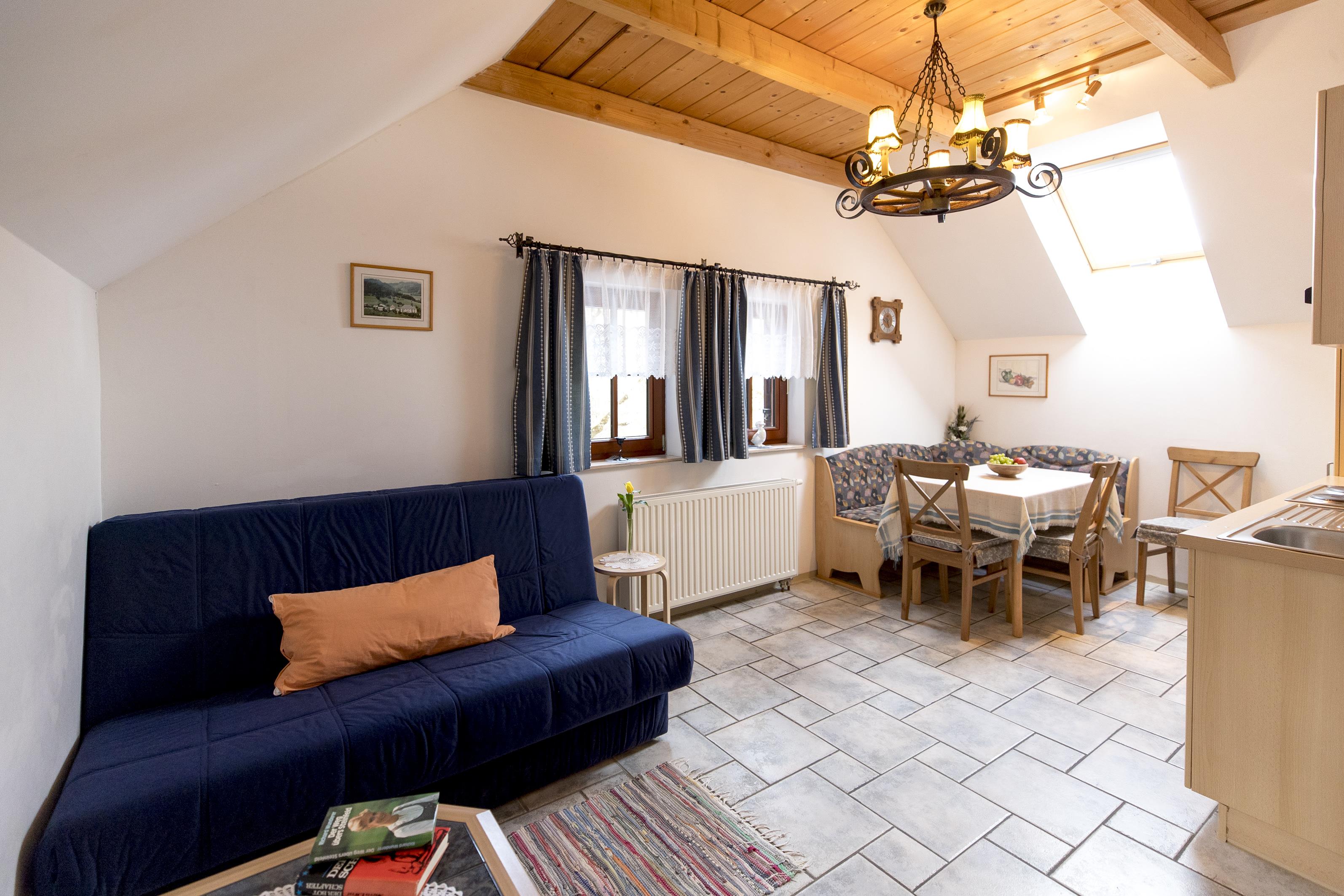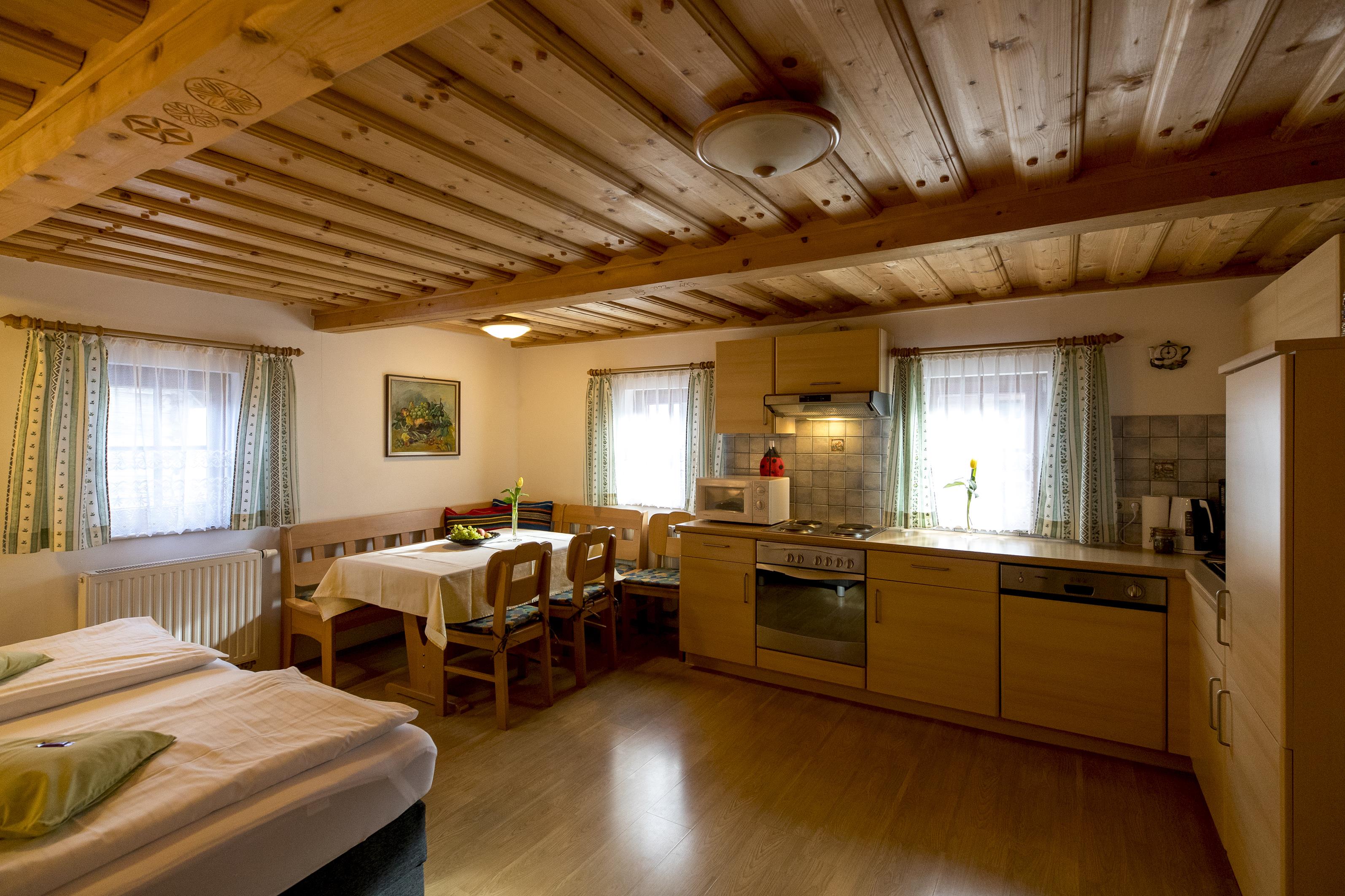 Ferienwohnung I: wo Sie über eine Wendeltreppe ins Mansardenzimmer mit vier Einzelbetten gelangen. Im unteren Stock befindet sich eine geräumige Wohnküche mit Boxspringbett für 2 weitere Personen. Badezimmer und WC sind getrennt.