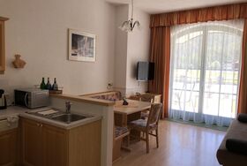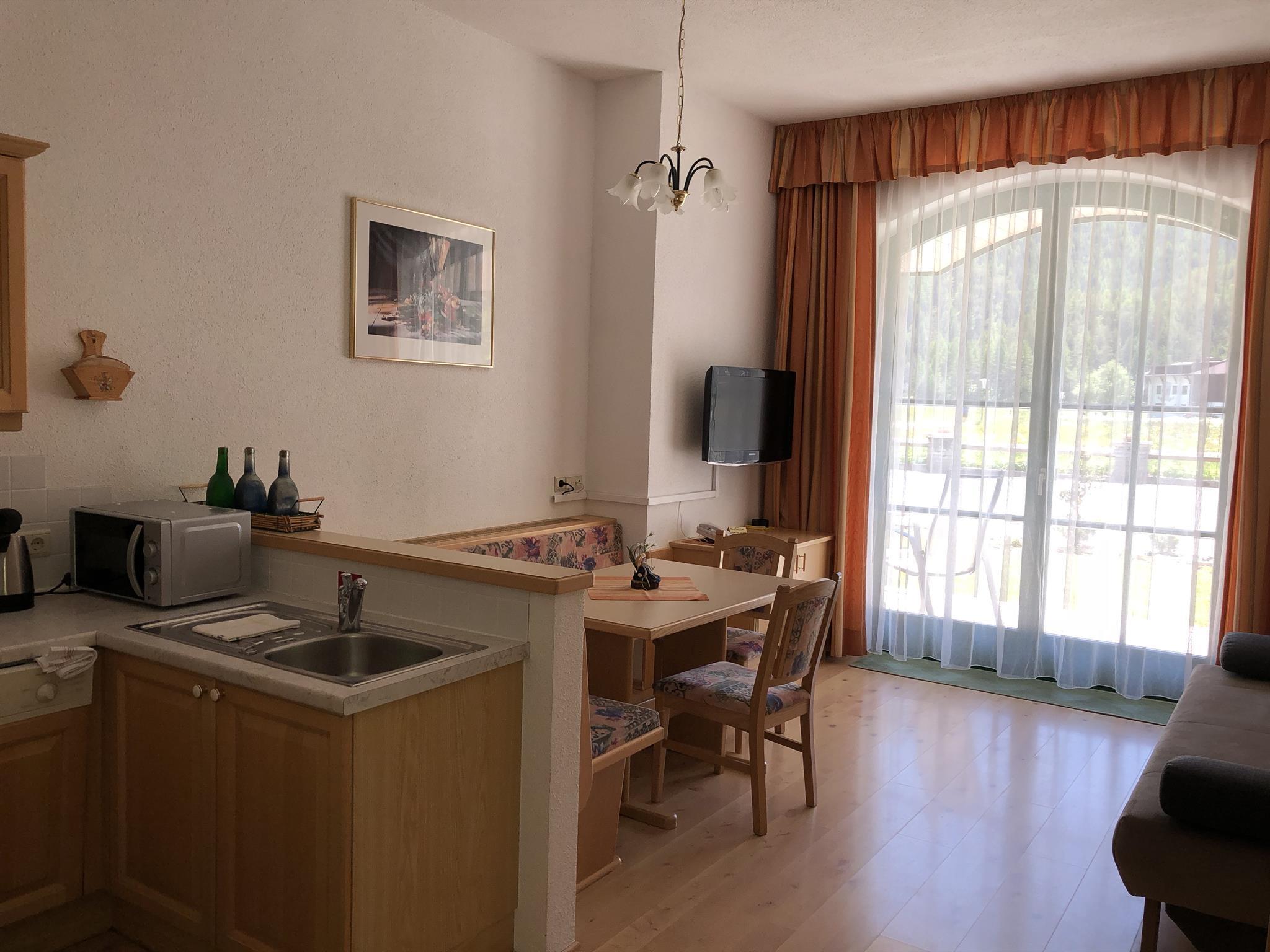 Unser liebevoll eingerichtetes Appartement Enzian im Erdgeschoss, mit ca. 46 m² besteht aus: 2 Doppelzimmer, 1 Badezimmer mit Regenwalddusche, WC und Föhn, vollausgestattete Wohnküche (Geschirrspüler, Cerankochfeld, Kühlschrank mit Gefrierfach, Kaffeemaschine, Wasserkocher usw.), Couch, Sat-TV, Telefon, Sitzecke, Safe und Essecke. Die Terrasse verfügt über Sitzmöbel und Liegestühle.