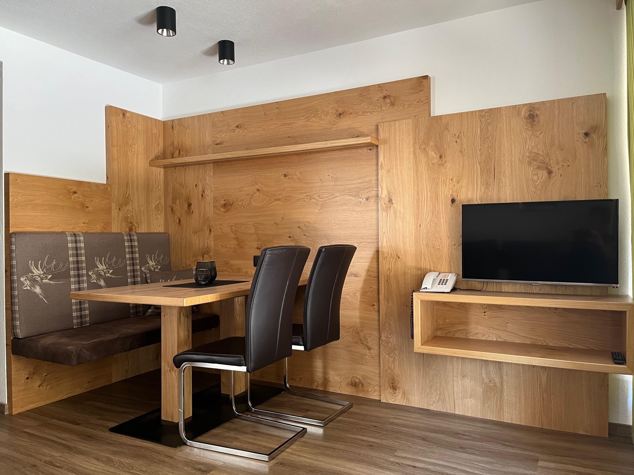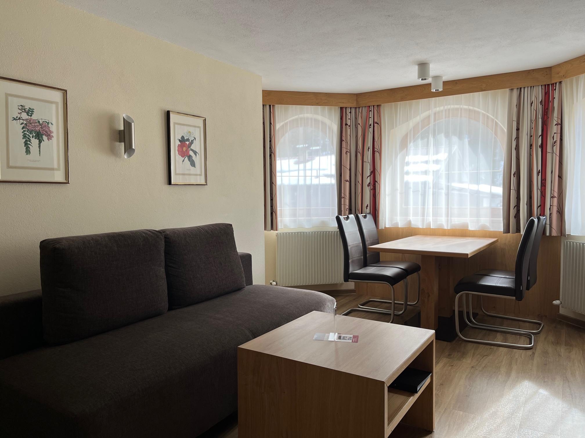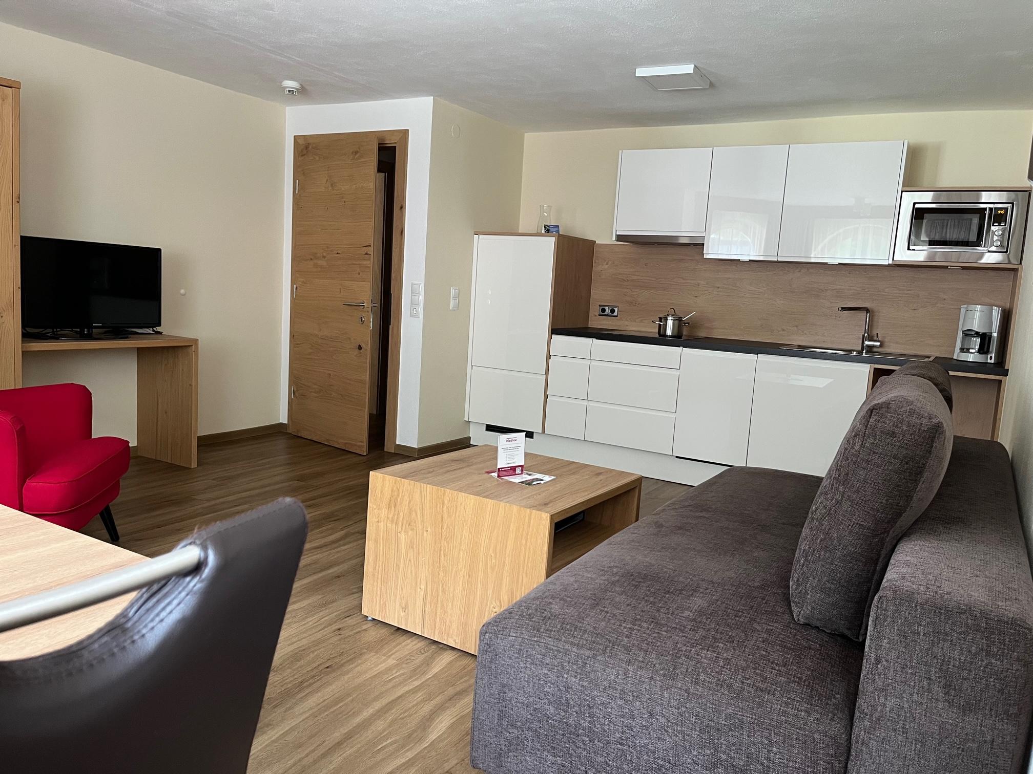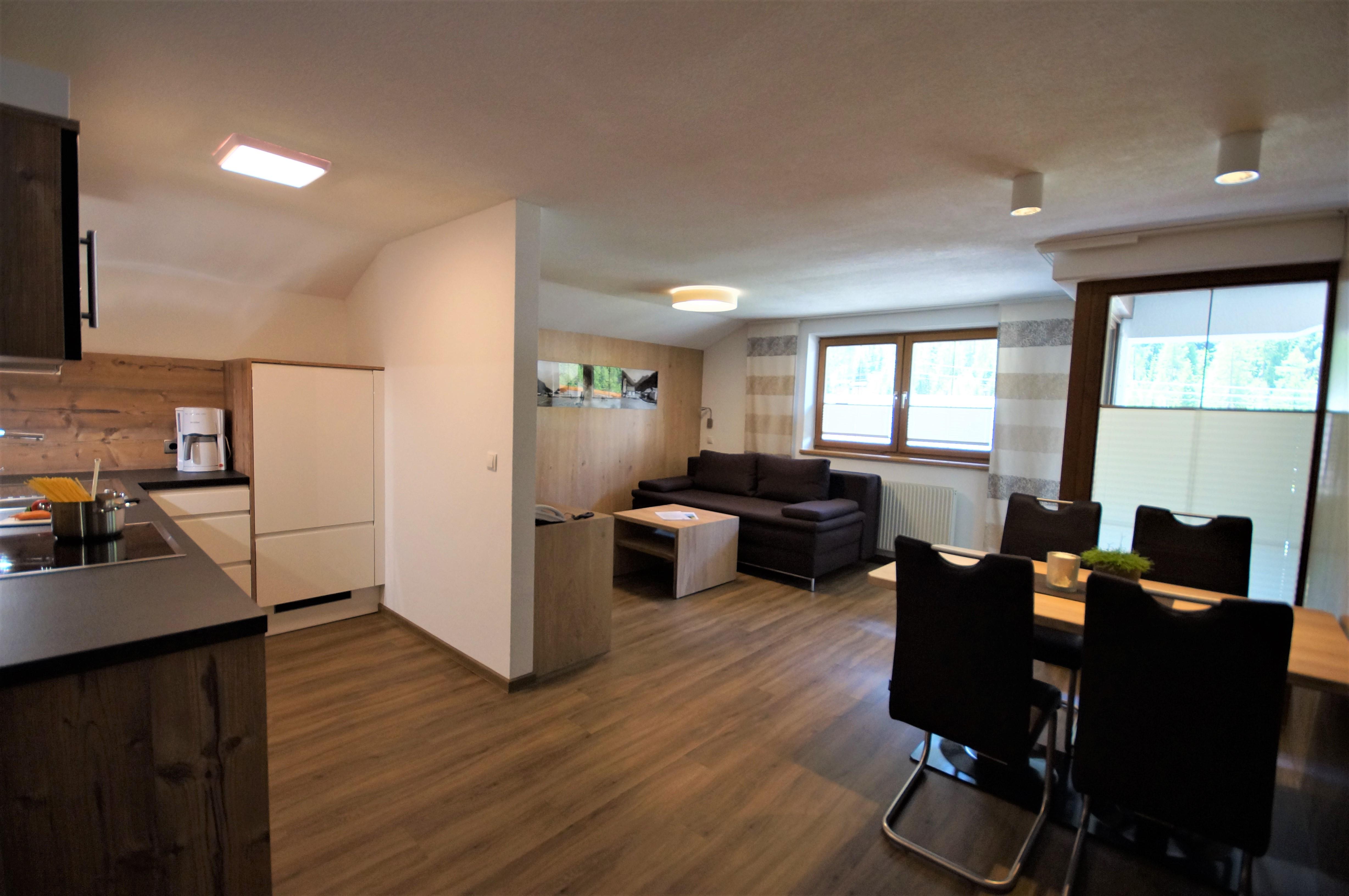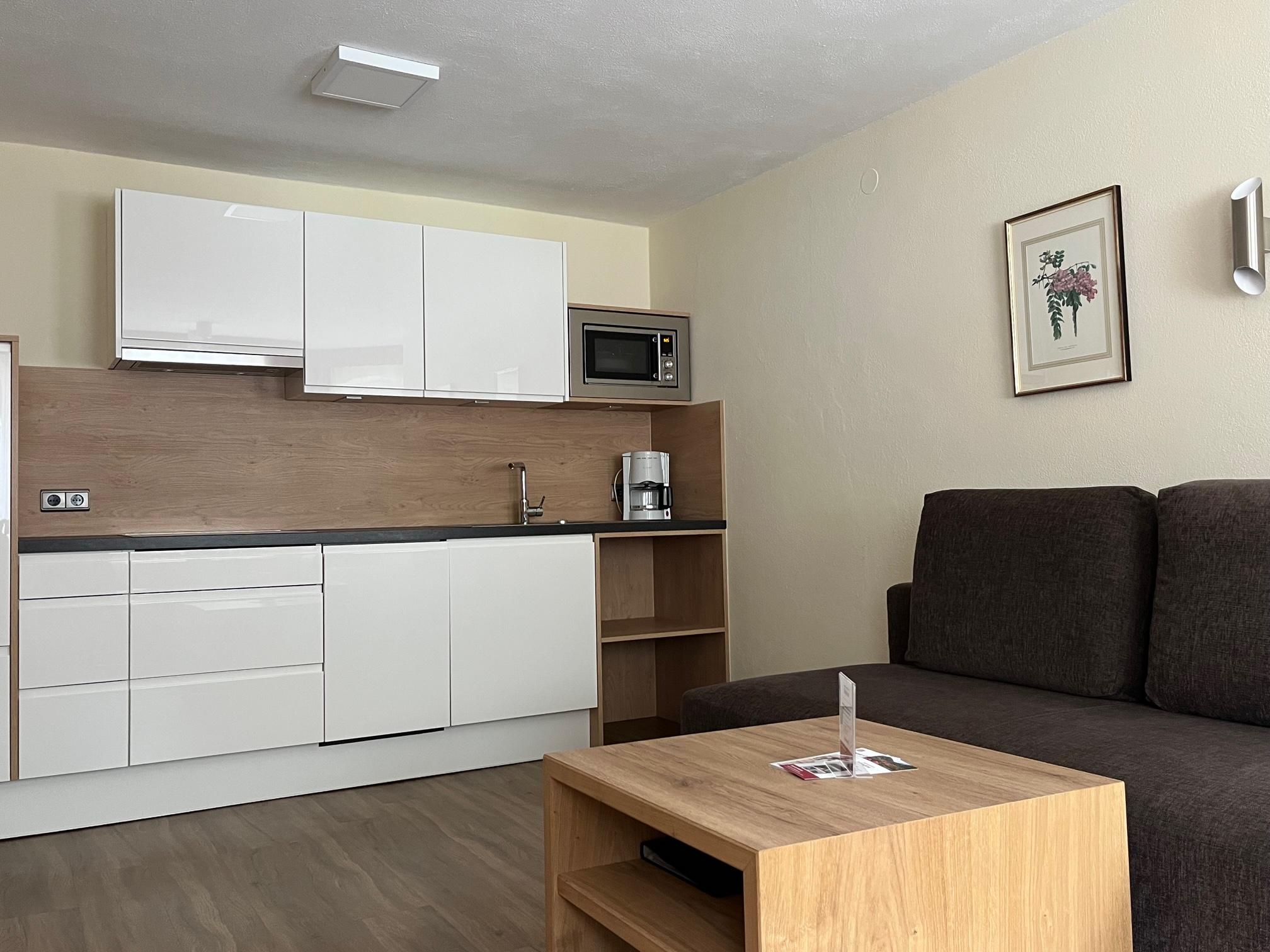 Gemütlich eingerichtetes Appartement (ca. 46 m²) mit Vorraum, Wohnküche mit Kochnische (Cerankochfeld, Kühlschrank/Gefrierfach, Kaffeemaschine, Geschirrspüler, Mikrowelle uvm.), Ess- und Wohnbereich mit Couch (Schlafgelegenheit für 2 Personen), 1 Doppelzimmer mit Zustellbett, Badezimmer mit Dusche/WC, Sat-TV, Durchwahl-Telefon, Internetanschluss und möblierter Balkon.