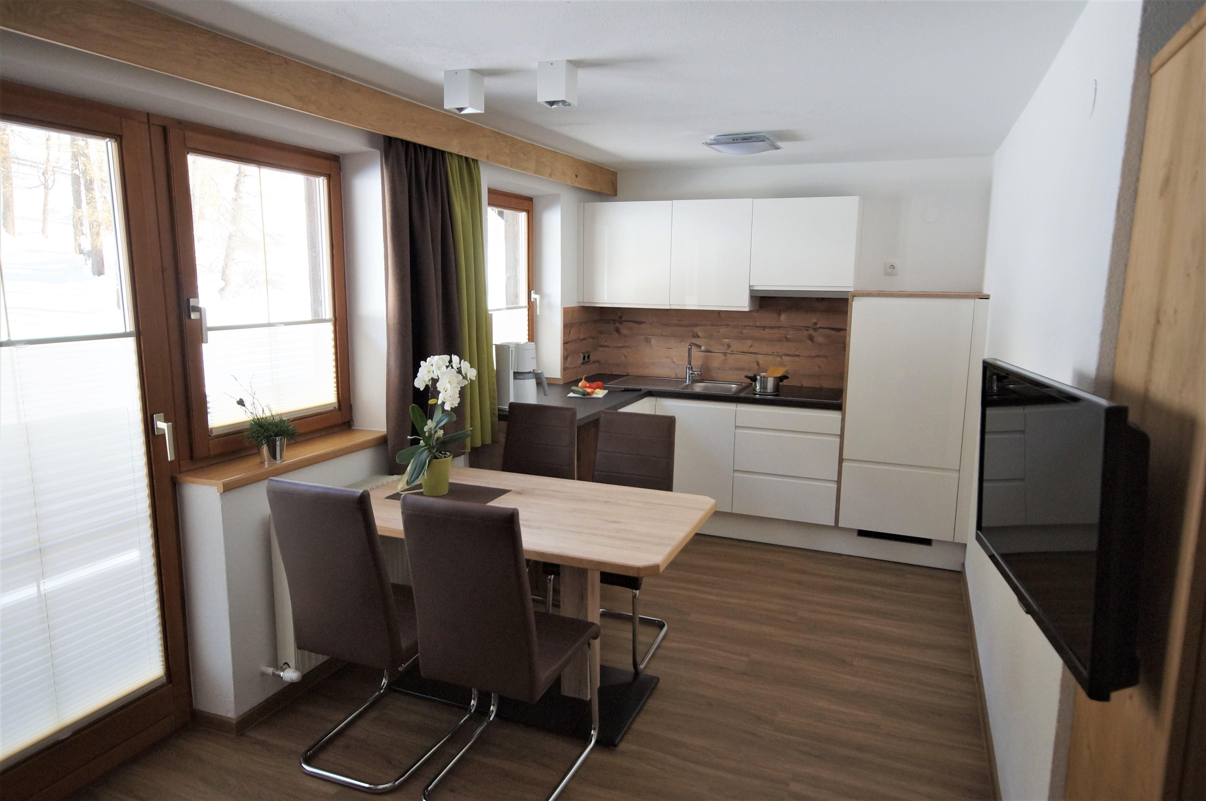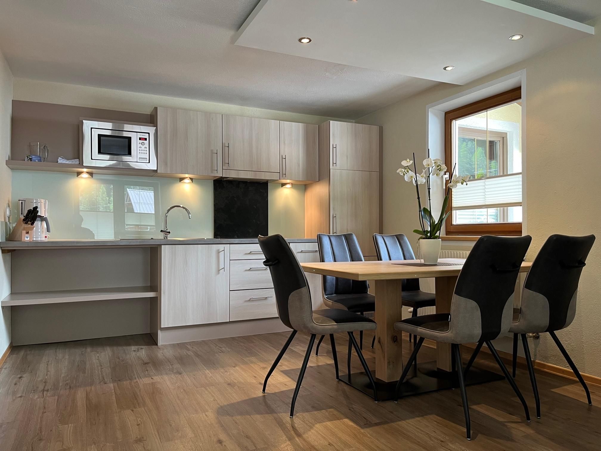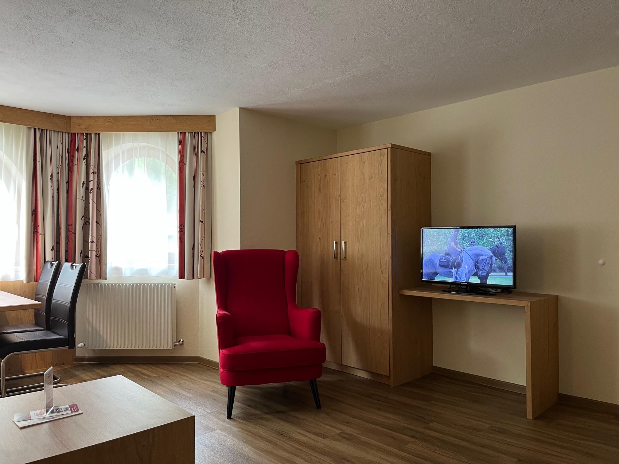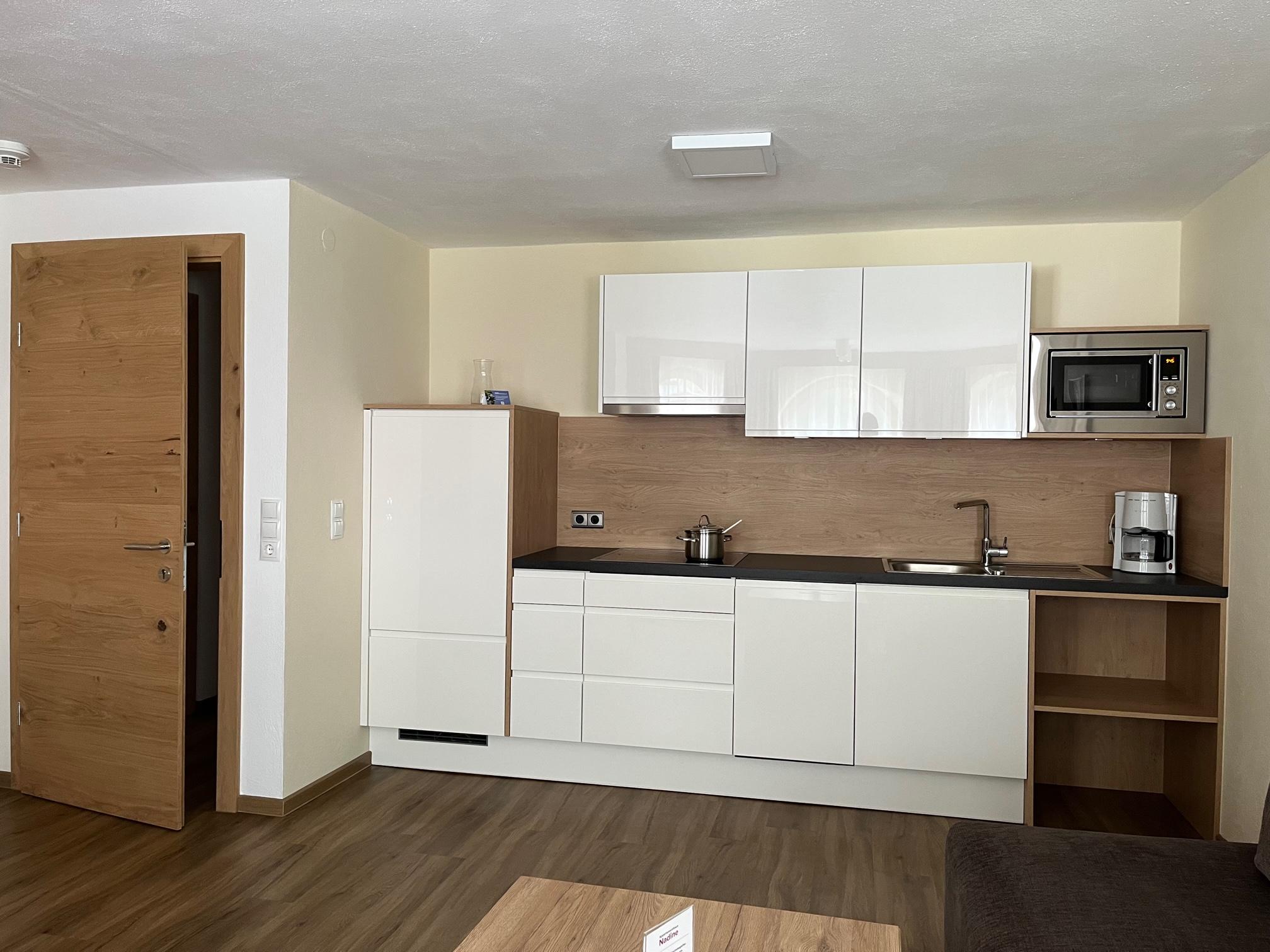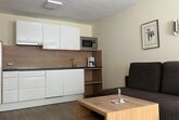 Gemütlich eingerichtetes Appartement (ca. 46 m²) mit Vorraum, Wohnküche mit Kochnische (Cerankochfeld, Kühlschrank/Gefrierfach, Kaffeemaschine, Geschirrspüler, Mikrowelle uvm.), Ess- und Wohnbereich mit Couch (Schlafgelegenheit für 2 Personen), 1 Doppelzimmer mit Zustellbett, Badezimmer mit Dusche/WC, Sat-TV, Durchwahl-Telefon, Internetanschluss und möblierter Balkon.