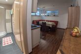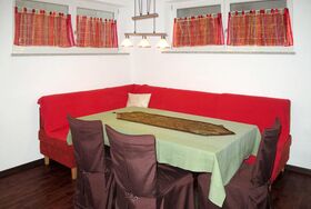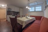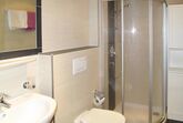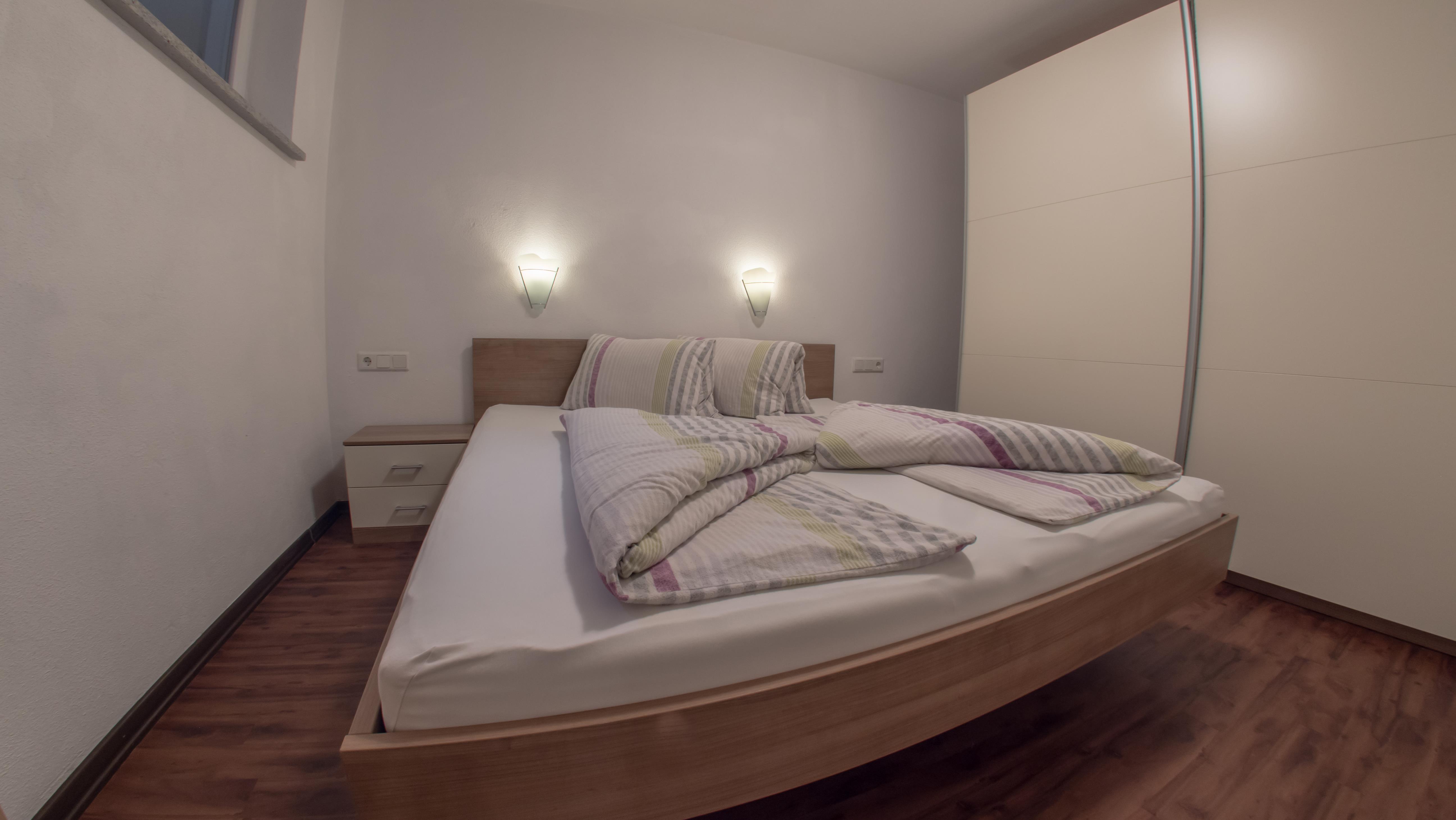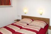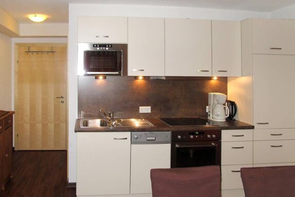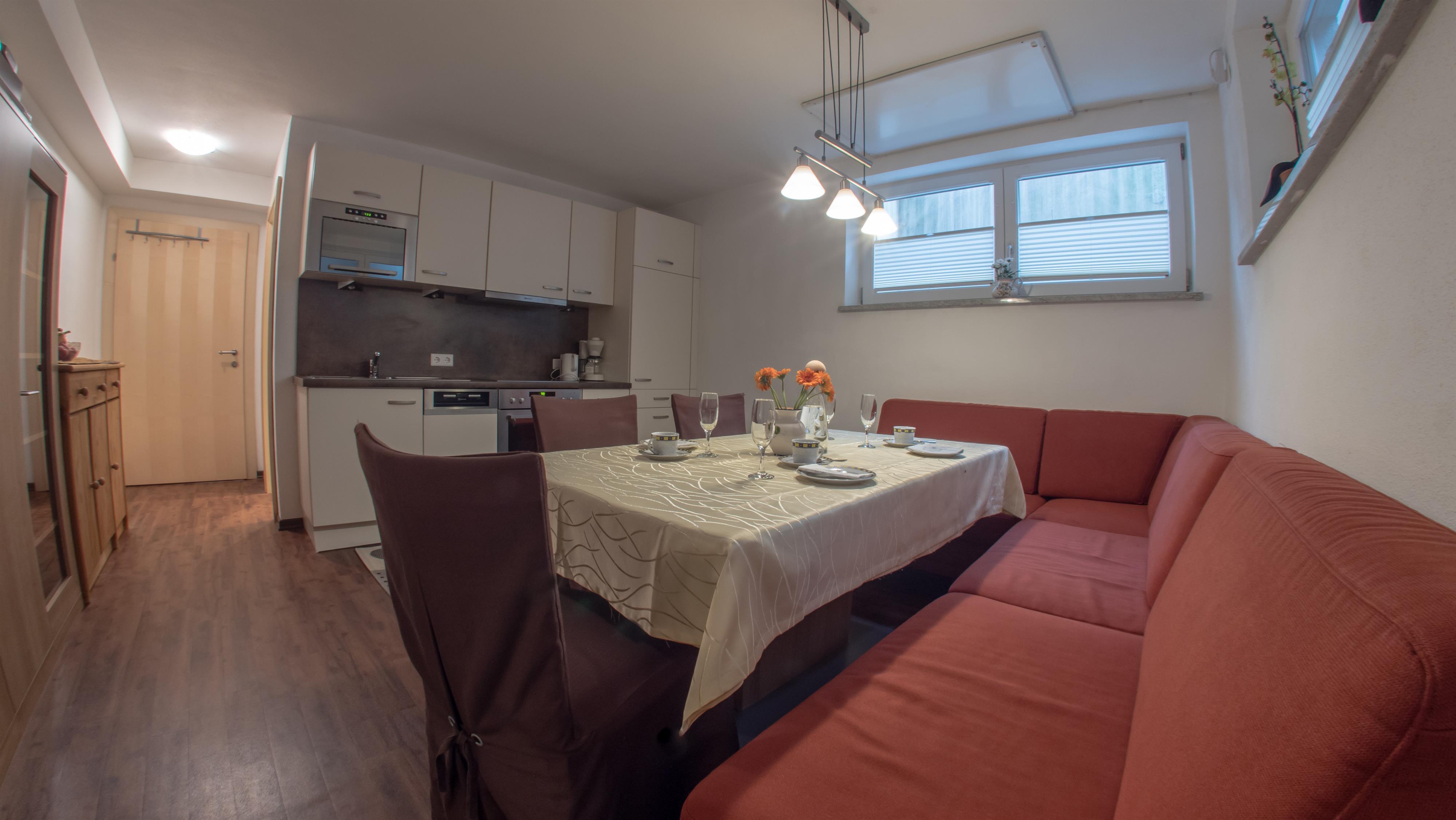 ApartSaphir im Untergeschoss, Größe ca. 42 m², 2-Zimmer-Wohnung mit Schachtfenster ohne Aussicht: 1 voll ausgestattete Wohnküche (Cerankochfeld, Kühlschrank, Kaffeemaschine, Mikrowelle, Geschirrspüler uvm.) mit Essbereich inkl. Eckbank und 1 Schlafsofa für eine Person, 1 Doppelzimmer mit Badezimmer mit Dusche/WC.