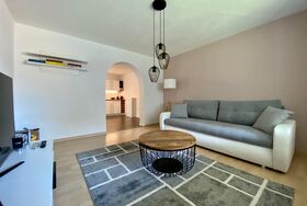 Das Appartement mit 55 m² verfügt über ein Doppelzimmer; eine voll ausgestattete Küche inkl. Geschirrspüler, Wasserkocher, Kaffeemaschine, uvm. mit Essbereich; ein Wohnzimmer mit Sat TV und ausziehbarer Couch (Schlafmöglichkeit für 3. Person), einem Badezimmer mit Badewanne, einem separatem WC und einer großen Sonnenterasse mit Loungemöbeln (ca. 10 m²); Parkplätze sind bei der Unterkunft vorhanden.
