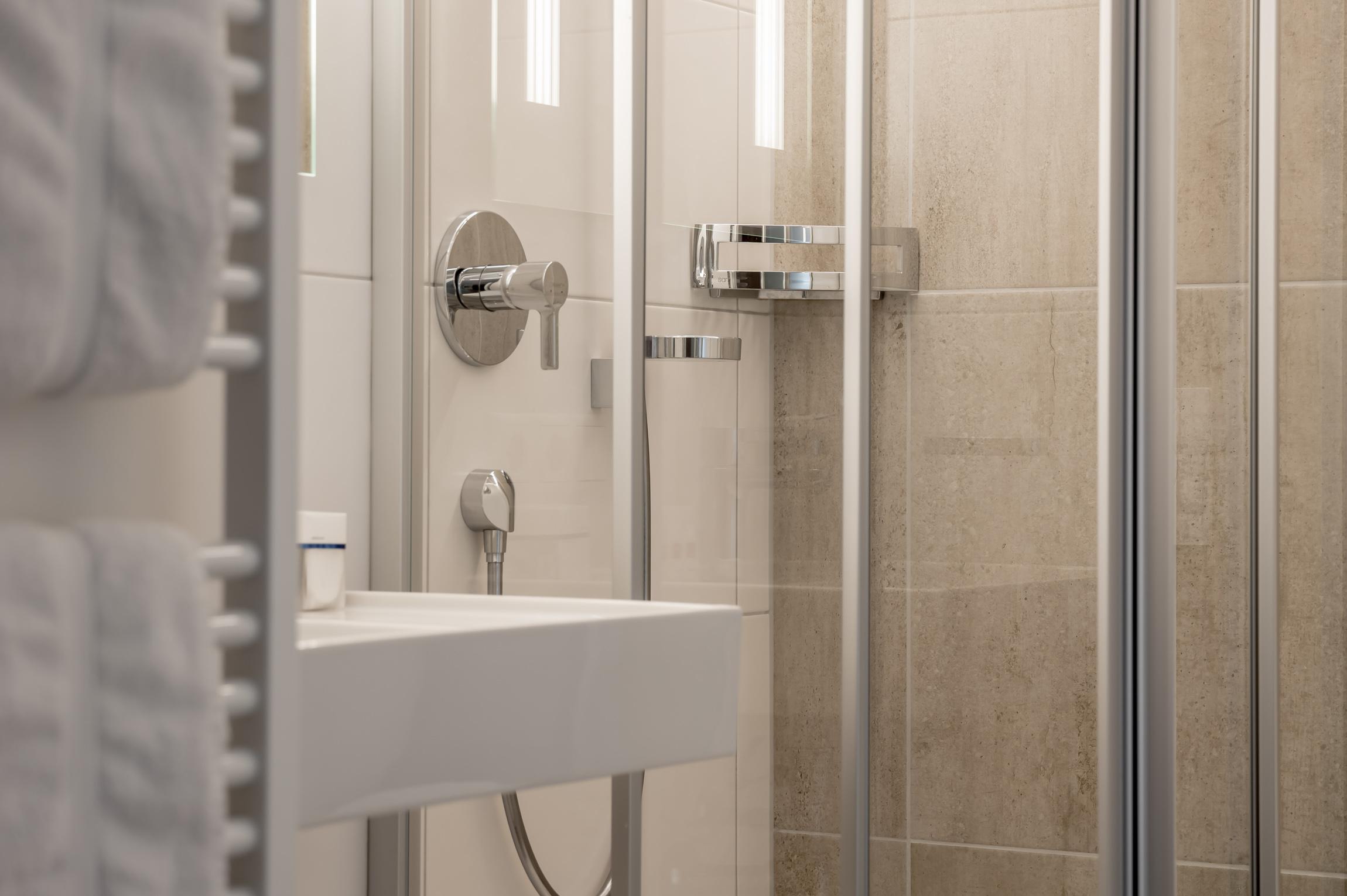 Schlafzimmer mit Doppelbett, Badezimmer mit Dusche/WC und Haarföhn, Flat-TV, Safe, Telefon, WLAN