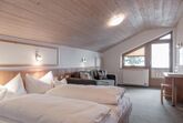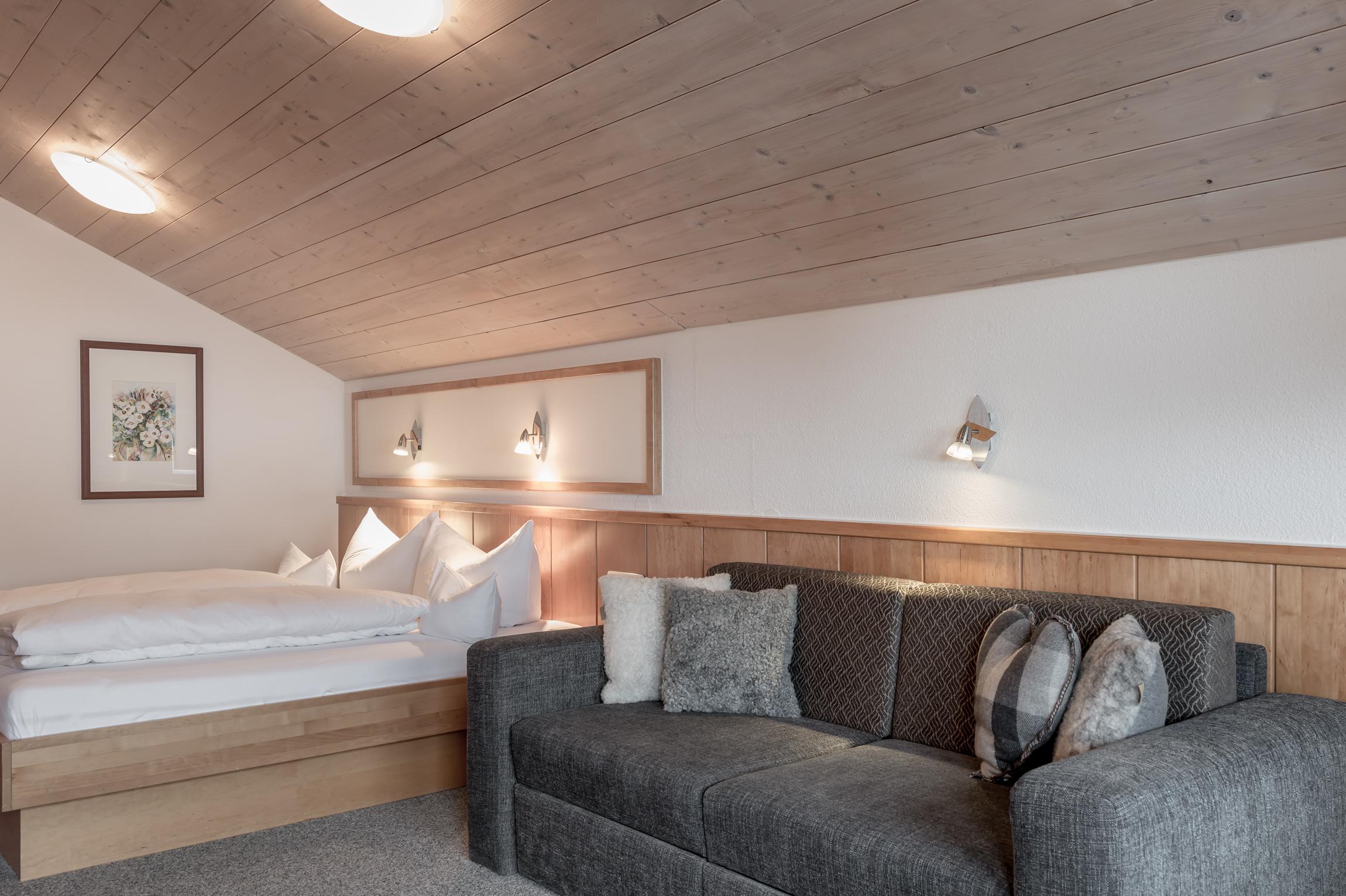 Schlafzimmer mit Doppelbett und Couch für 3. Person, gemütliche Sitzecke, Badezimmer mit Dusche/WC und Haarföhn