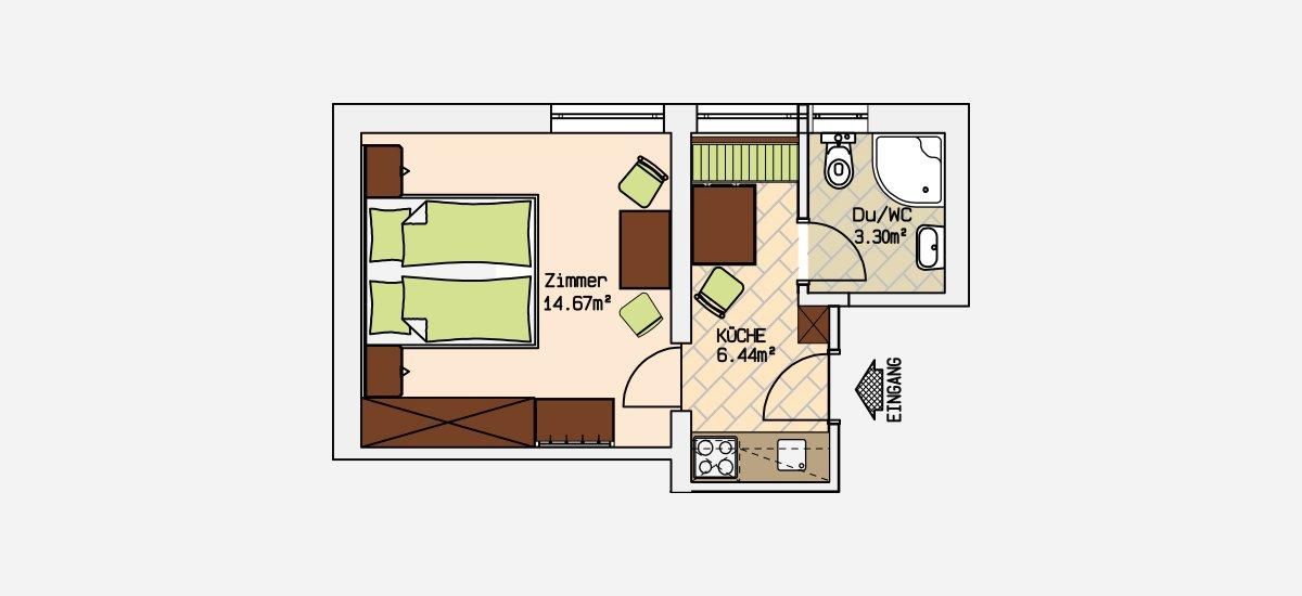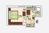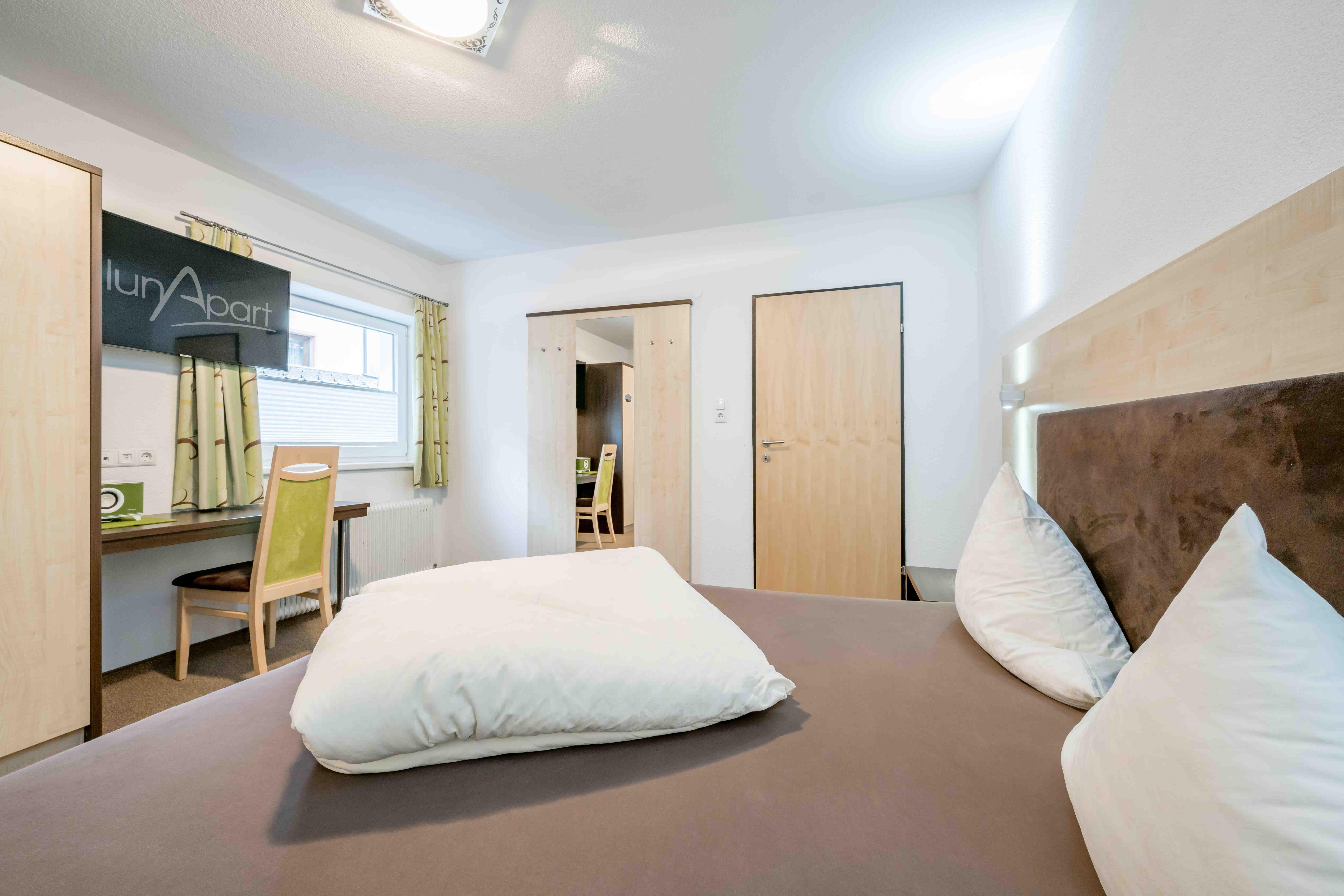 2 Personen-Appartement Schlafzimmer mit Doppelbett Badezimmer mit Dusche/WC vollausgestattete Wohnküche mit Geschirr- und Kochausstattung, 2-Plattenherd, Mikrowelle, Kühlschrank, Kaffeepadmaschine Flat TV mit digital TV iPod Docking Station Safe W-LAN Freizeit Arena inklusive