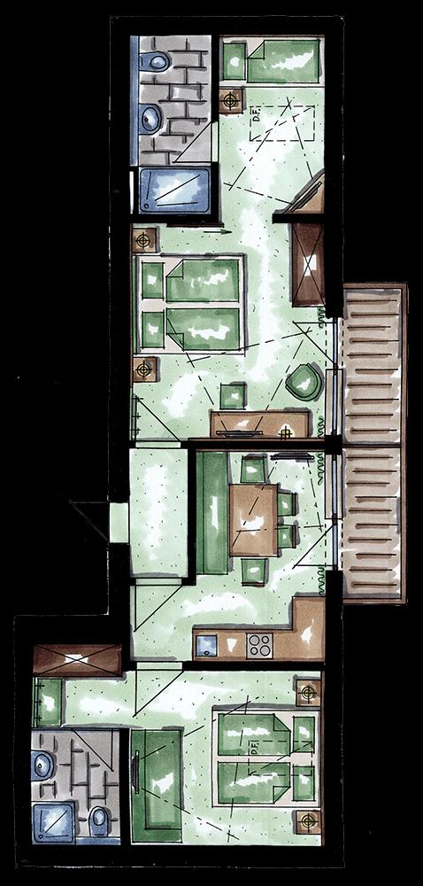 Landhausapart mit 2 Schlafzimmer mit Doppelbett und Couch, 2 Badezimmer mit Dusche/WC und Haarföhn, vollausgestattete Küche mit Ceran-Kochfeld und Backofen, Ceran-Kochfeld und Backofen, Geschirrspüler, Kaffeemaschine, Wasserkocher, Toaster, gemütlicher Essecke,... Telefon, Safe, WLAN, Balkon. Größe ca. 57 m².