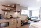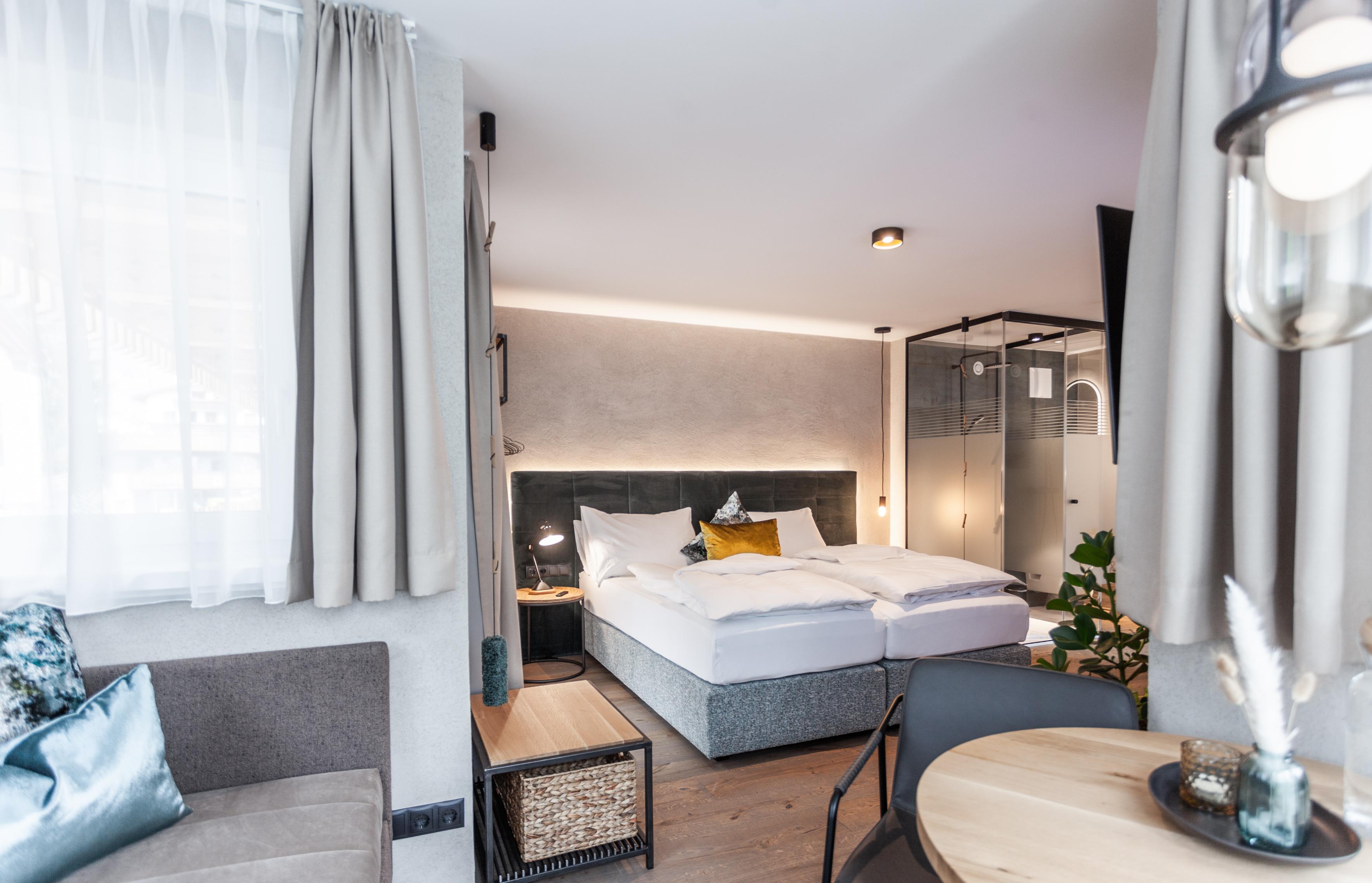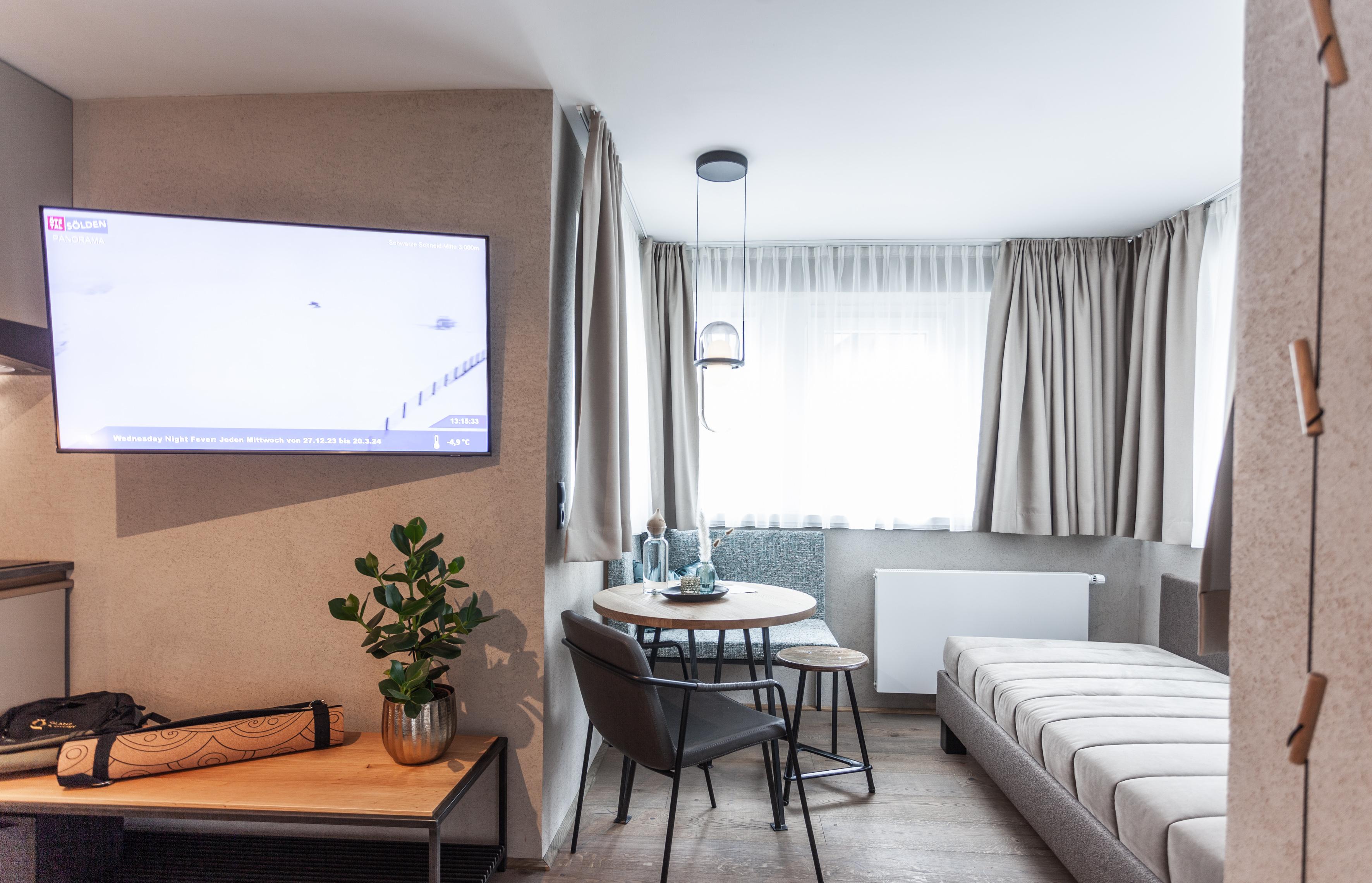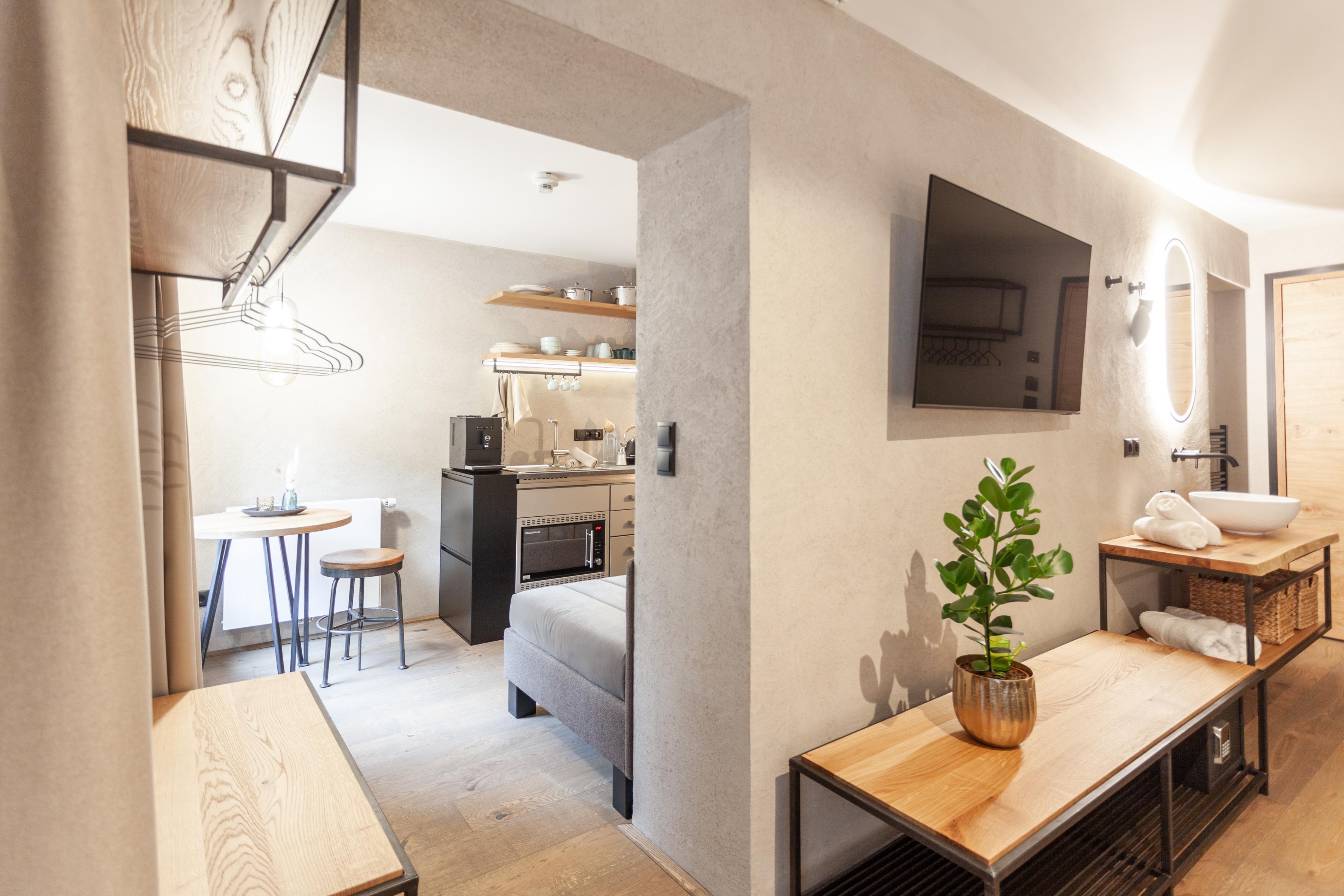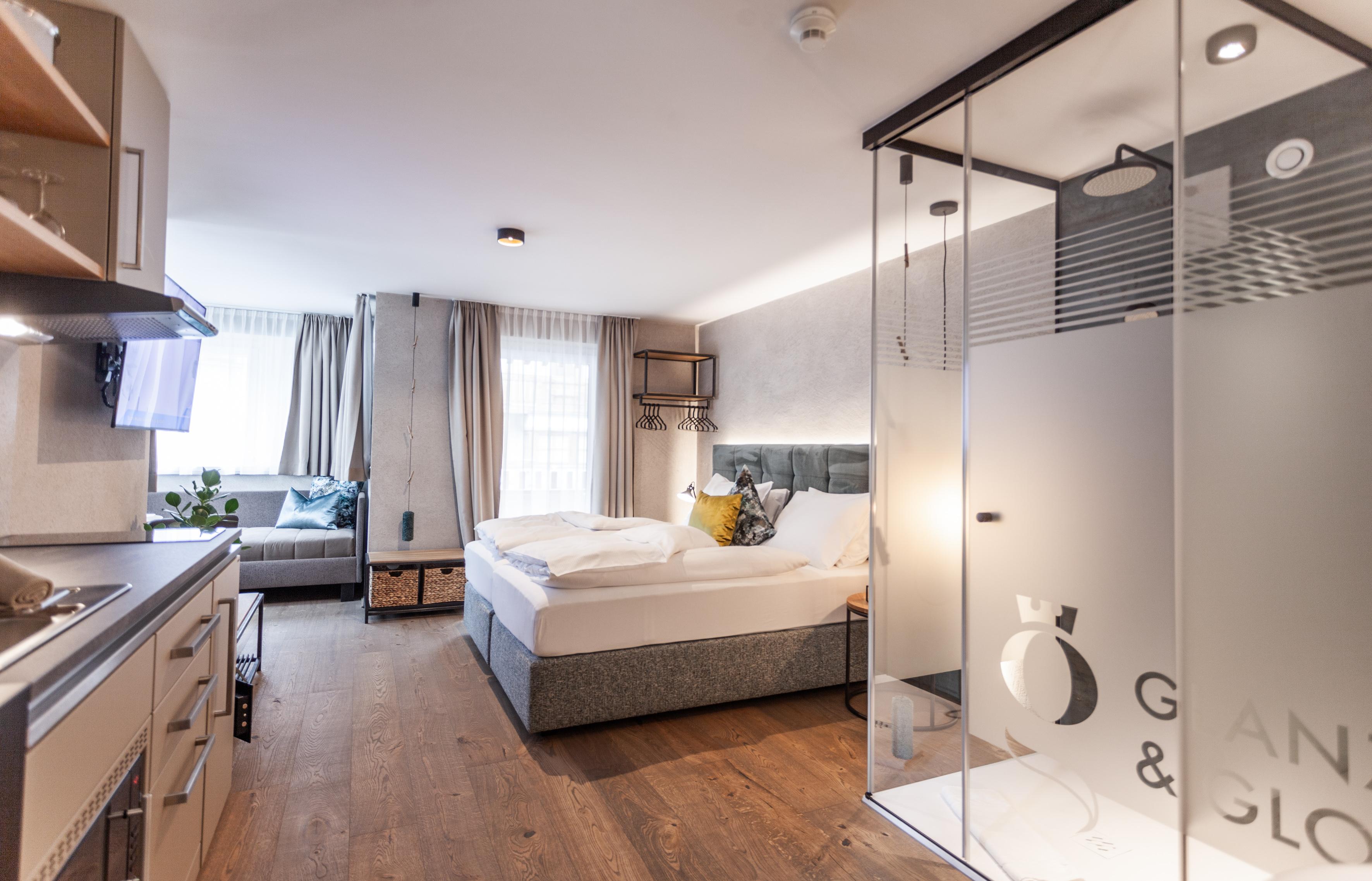 Studio Deluxe für 1-3 Personen ca. 26 m² - 33 m²: Wohnschlafraum mit Küche & Geschirrspüler, Kochfeld und Mikrowelle mit Backfunktion, Dusche, WC, Föhn sowie Hand- und Badetüchern, Flat-TV und gratis W-Lan, Balkon oder Panoramafenster. Extras: Wärmflasche, Rucksack für Tagesausflüge, Yogamatte, Marshall Lautsprecher, möblierter Balkon, Wellnesstasche mit Bademantel