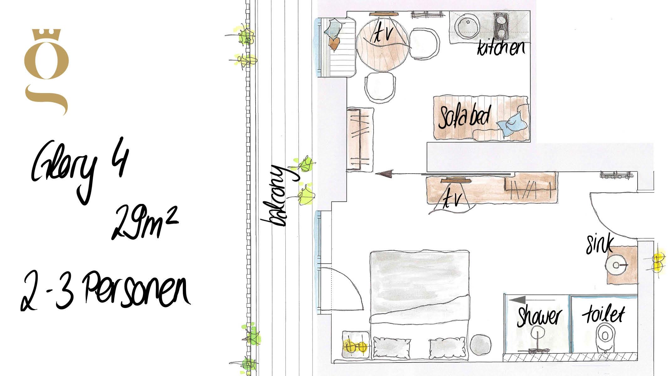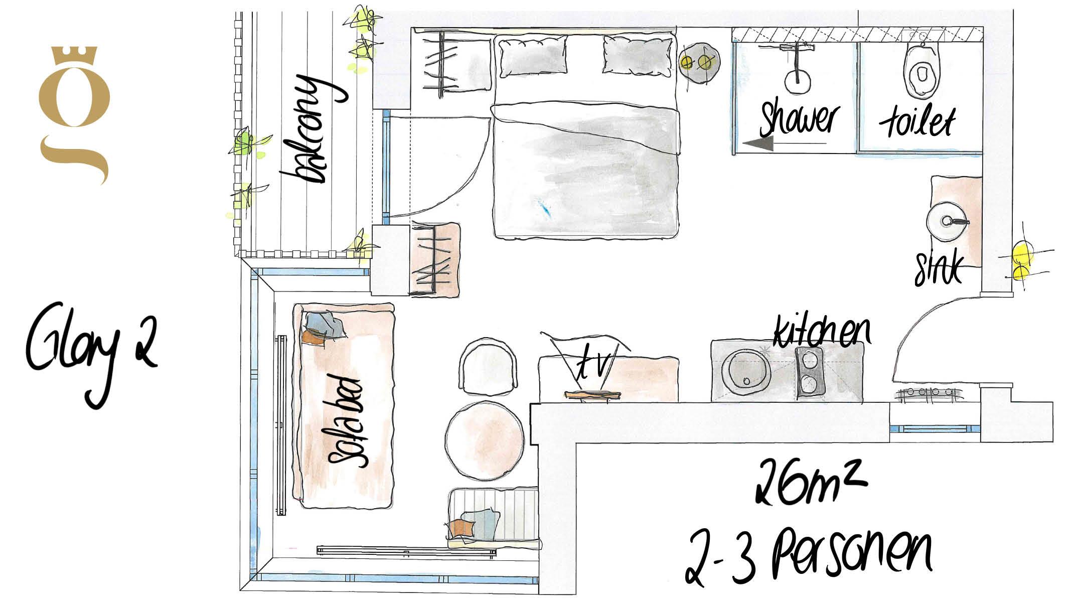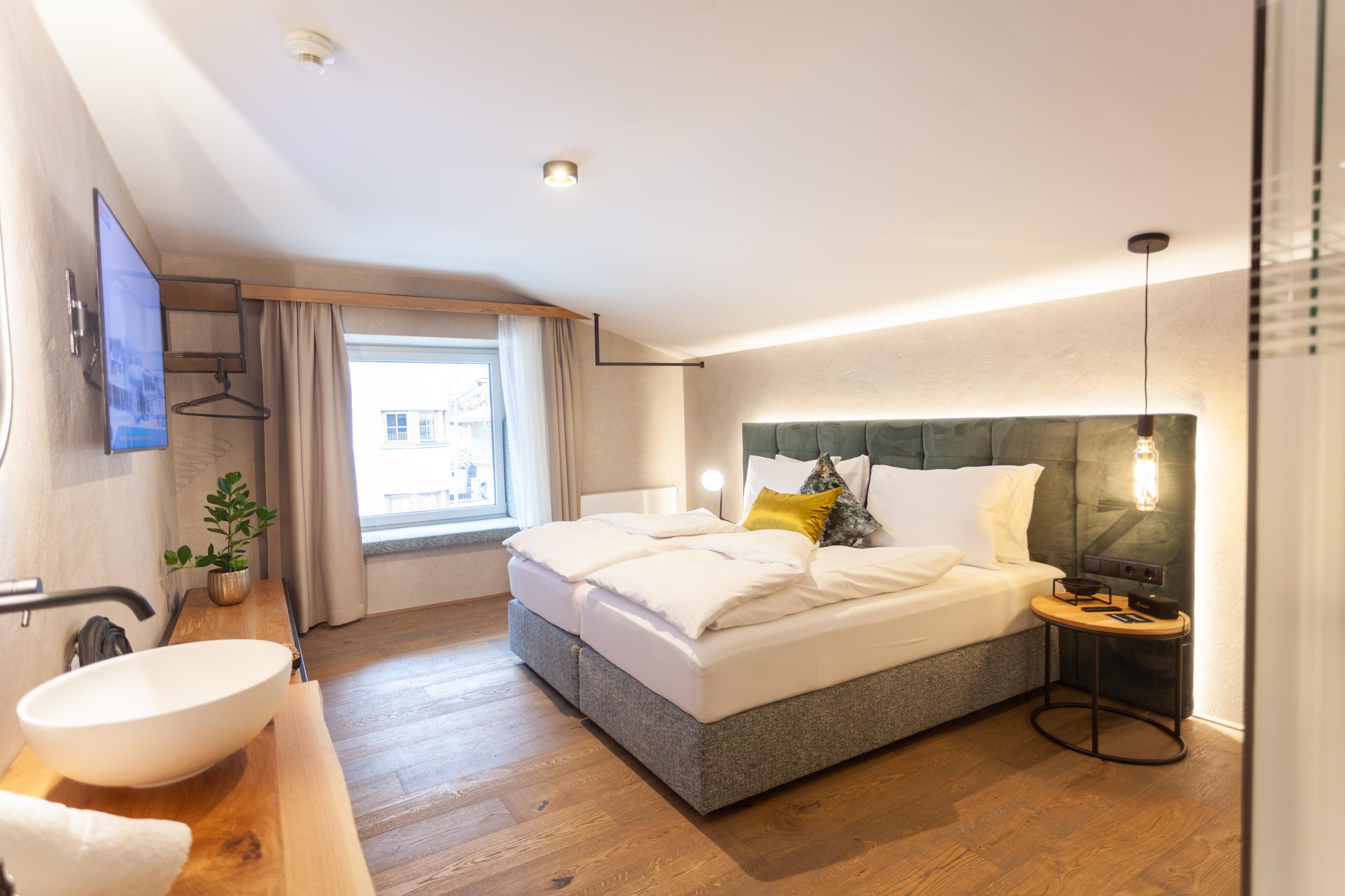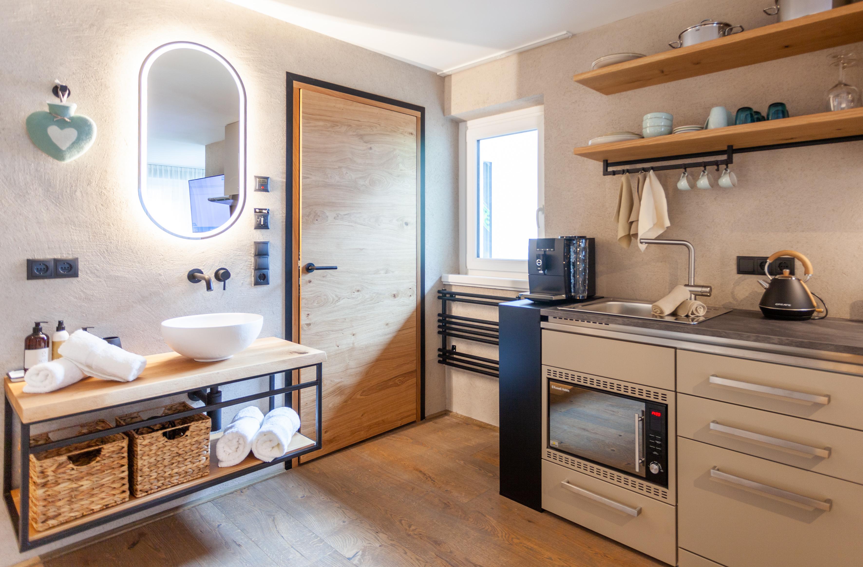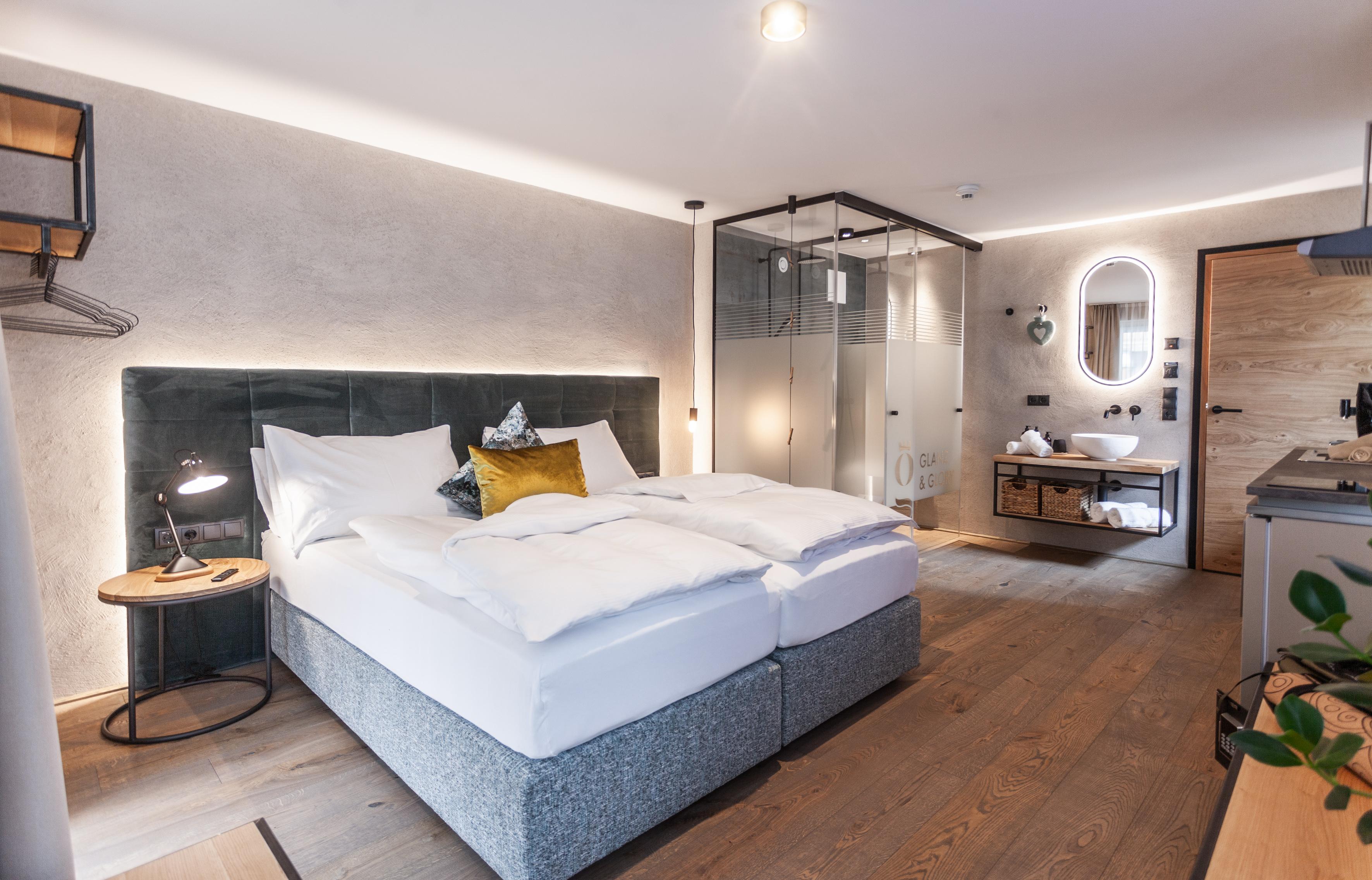 Studio Deluxe für 1-3 Personen ca. 26 m² - 33 m²: Wohnschlafraum mit Küche & Geschirrspüler, Kochfeld und Mikrowelle mit Backfunktion, Dusche, WC, Föhn sowie Hand- und Badetüchern, Flat-TV und gratis W-Lan, Balkon oder Panoramafenster. Extras: Wärmflasche, Rucksack für Tagesausflüge, Yogamatte, Marshall Lautsprecher, möblierter Balkon, Wellnesstasche mit Bademantel