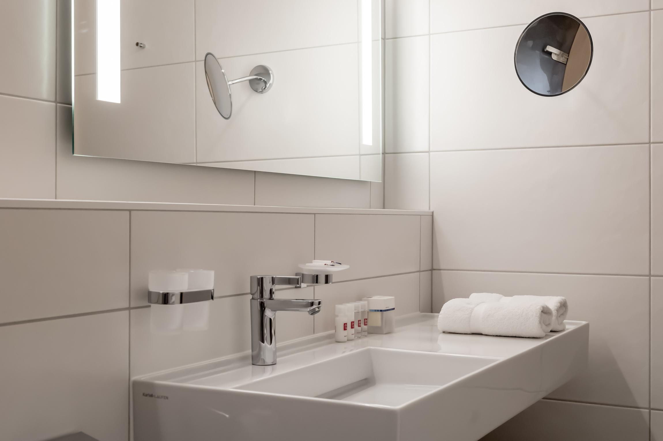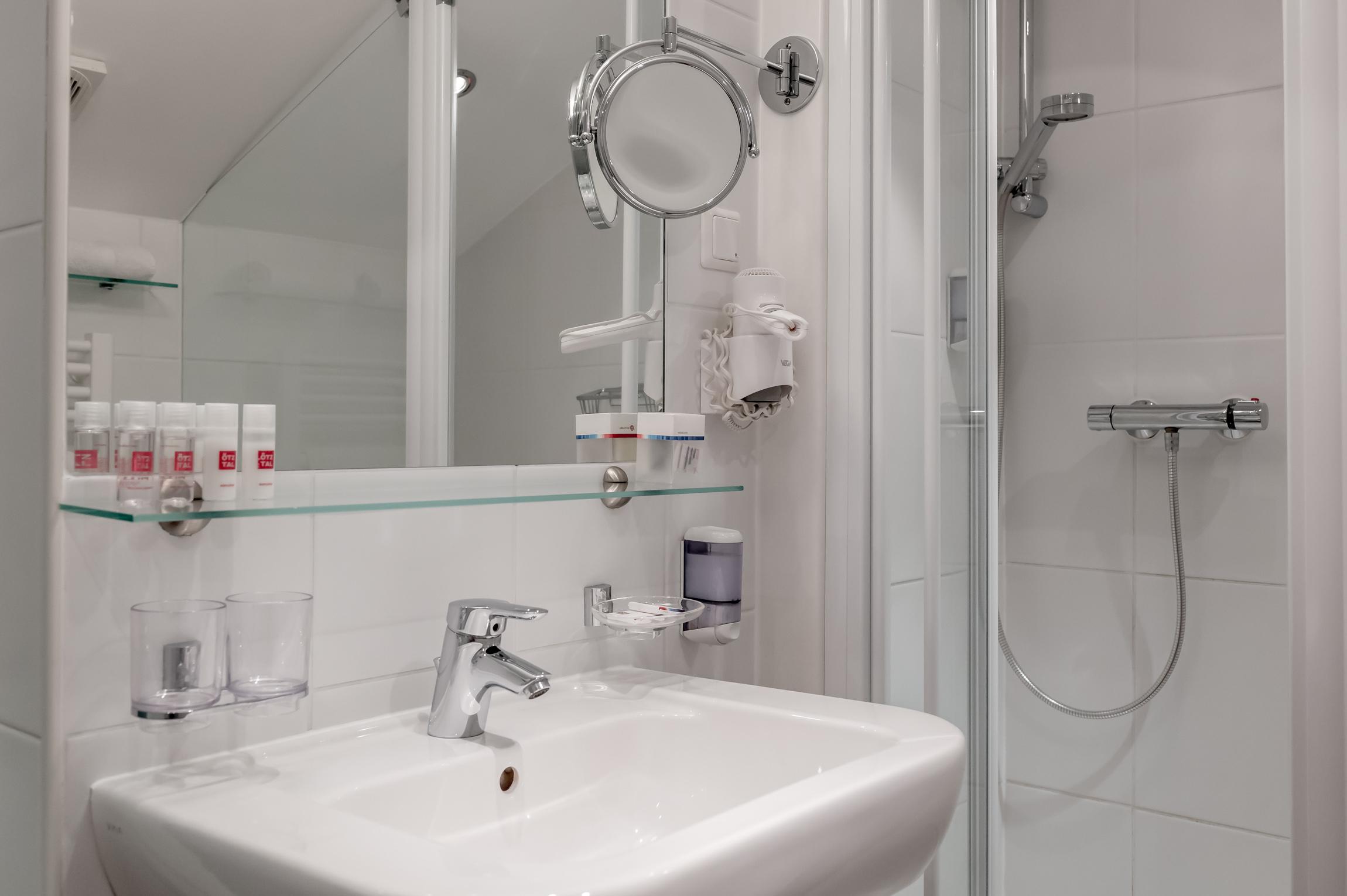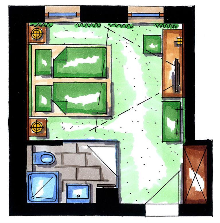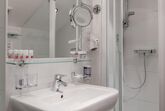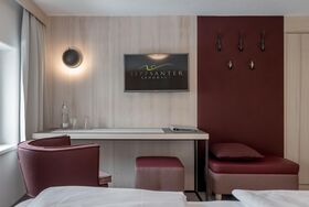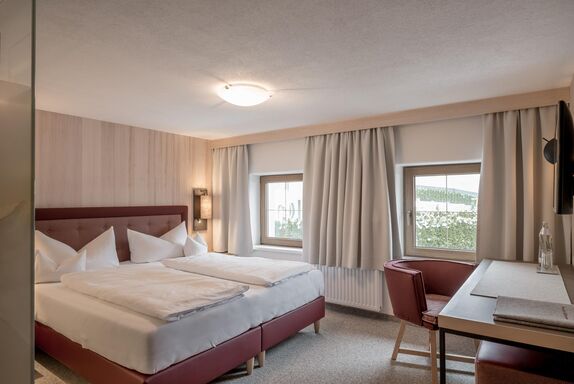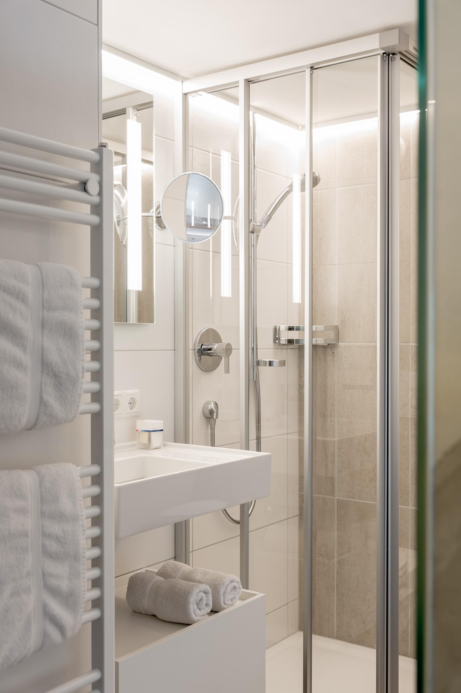 Schlafzimmer mit Doppelbett, Badezimmer mit Dusche/WC und Haarföhn, Flat-TV, Safe, Telefon, WLAN