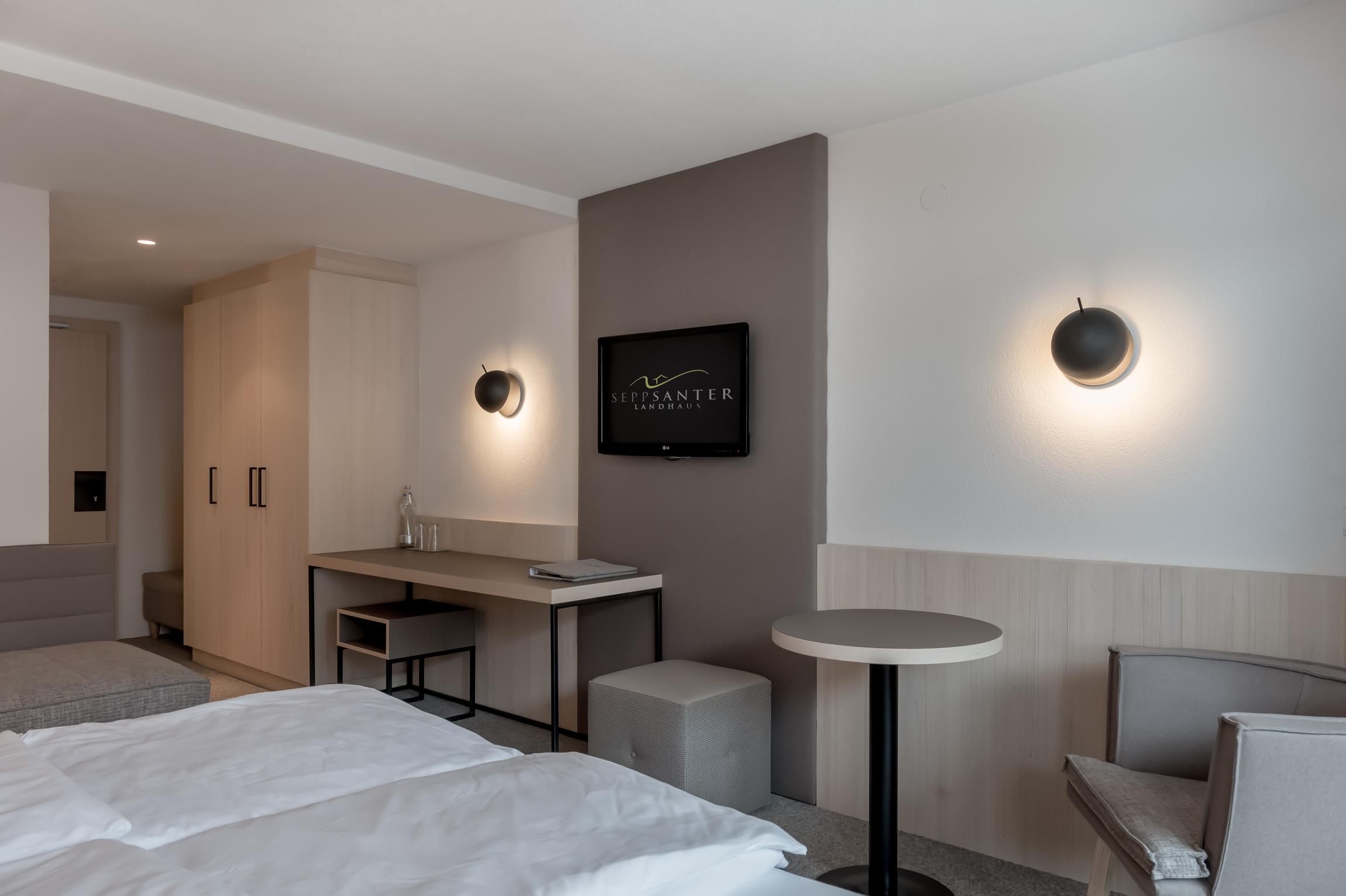 Schlafzimmer mit Doppelbett und Couch für 3. Person, gemütliche Sitzecke, Badezimmer mit Dusche/WC und Haarföhn
