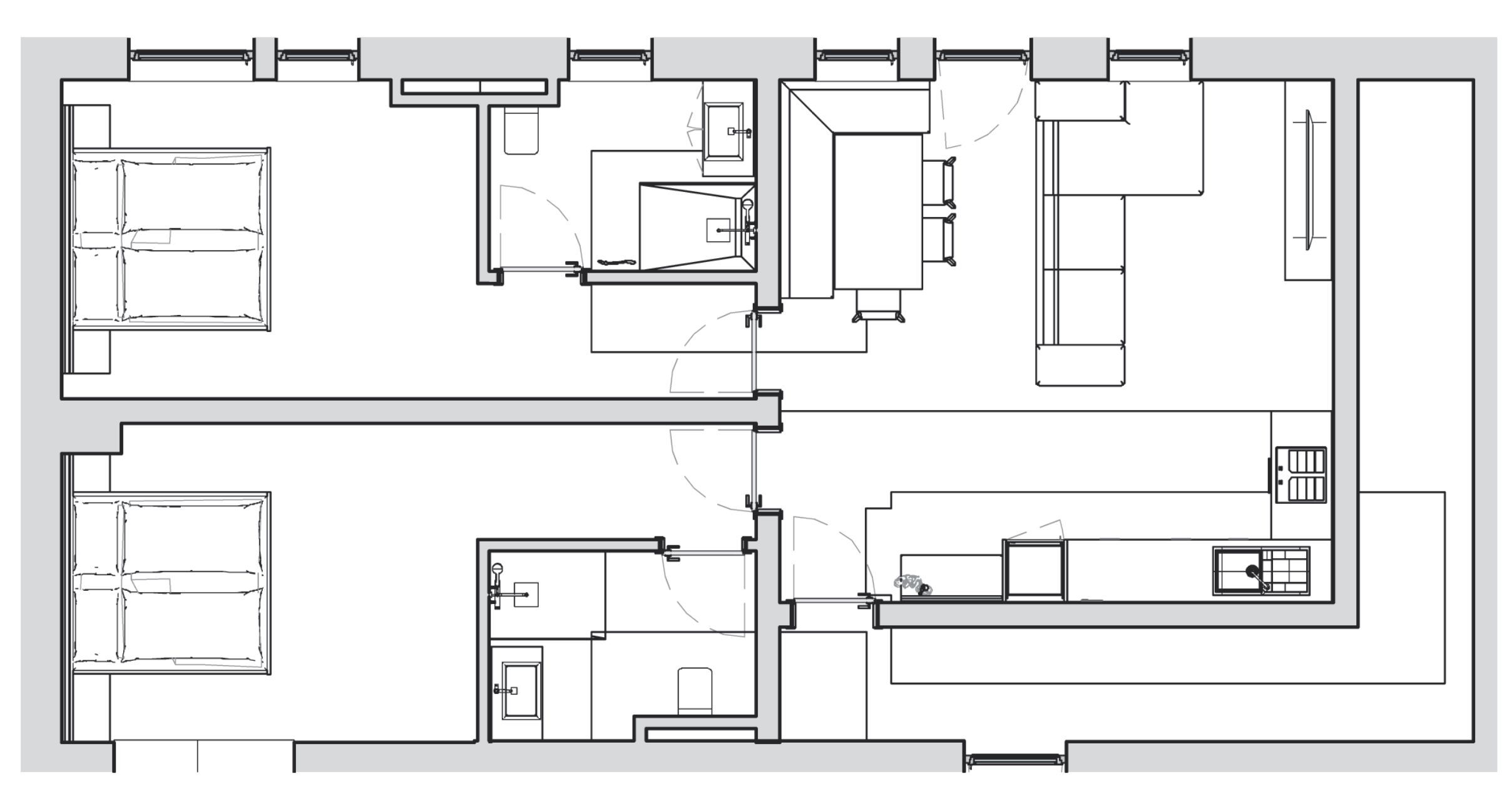 Unsere Ferienwohnung besteht aus zwei getrennte Doppelzimmer mit jeweils einem Badezimmer. (Für 5 bis 6 Personen je ein Zusatzbett im Zimmer .) Die Wohnküche ist mit einem gemütlichen Sofa ausgestattet. Sie verfügt auch über einen großen Balkon.