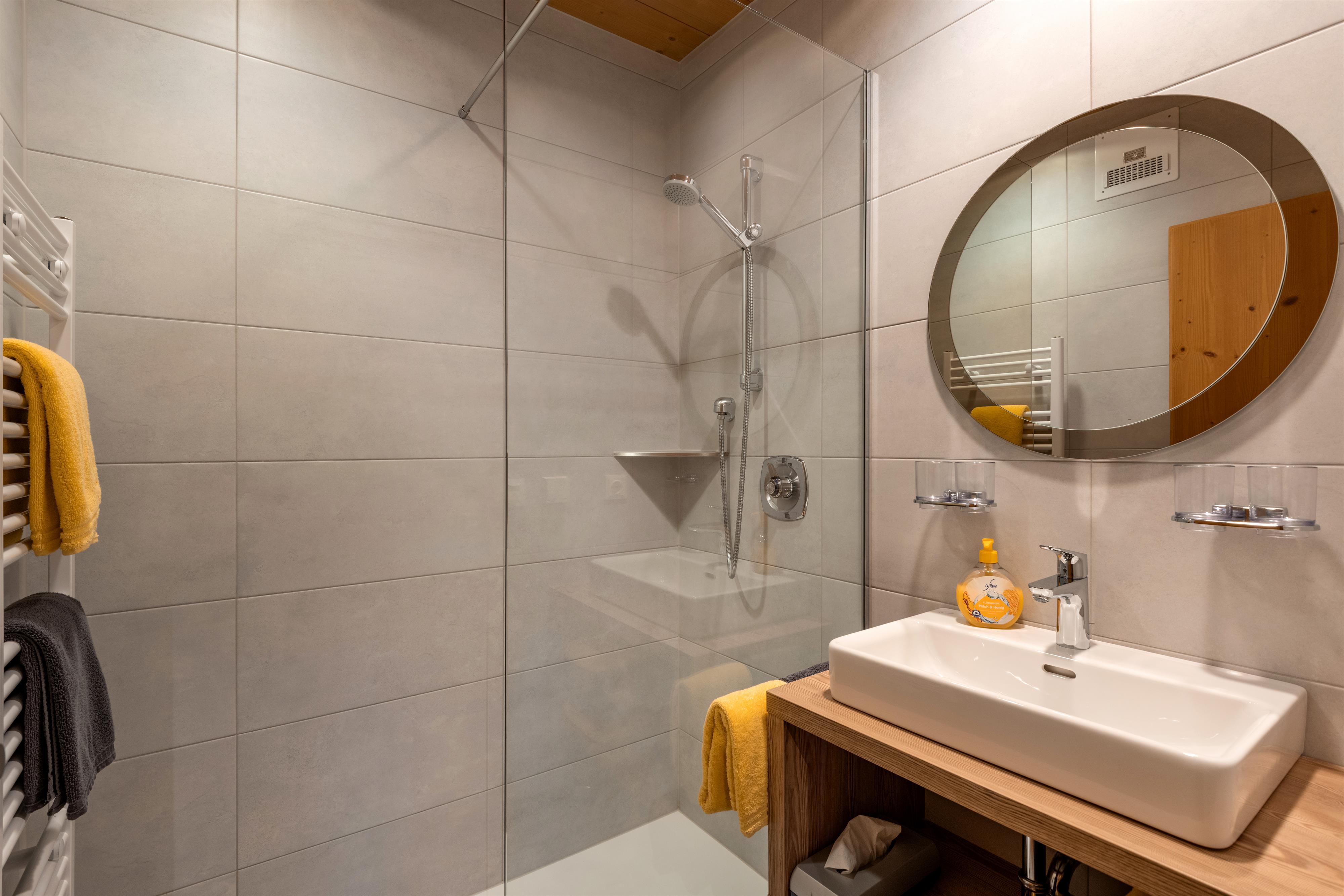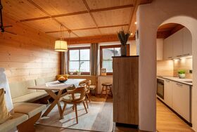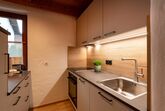 Gemütliches Appartement mit heller Holzverkleidung und elektrischem Kachelofen. Das Appartement hat einen Vorraum mit Garderobe, einen Wohnraum mit offenem Durchgang zum Schlafbereich, ein Schlafzimmer mit getrennten Betten, ein Badezimmer mit Dusche, ein separates WC und eine bestens ausgestattete Küche.