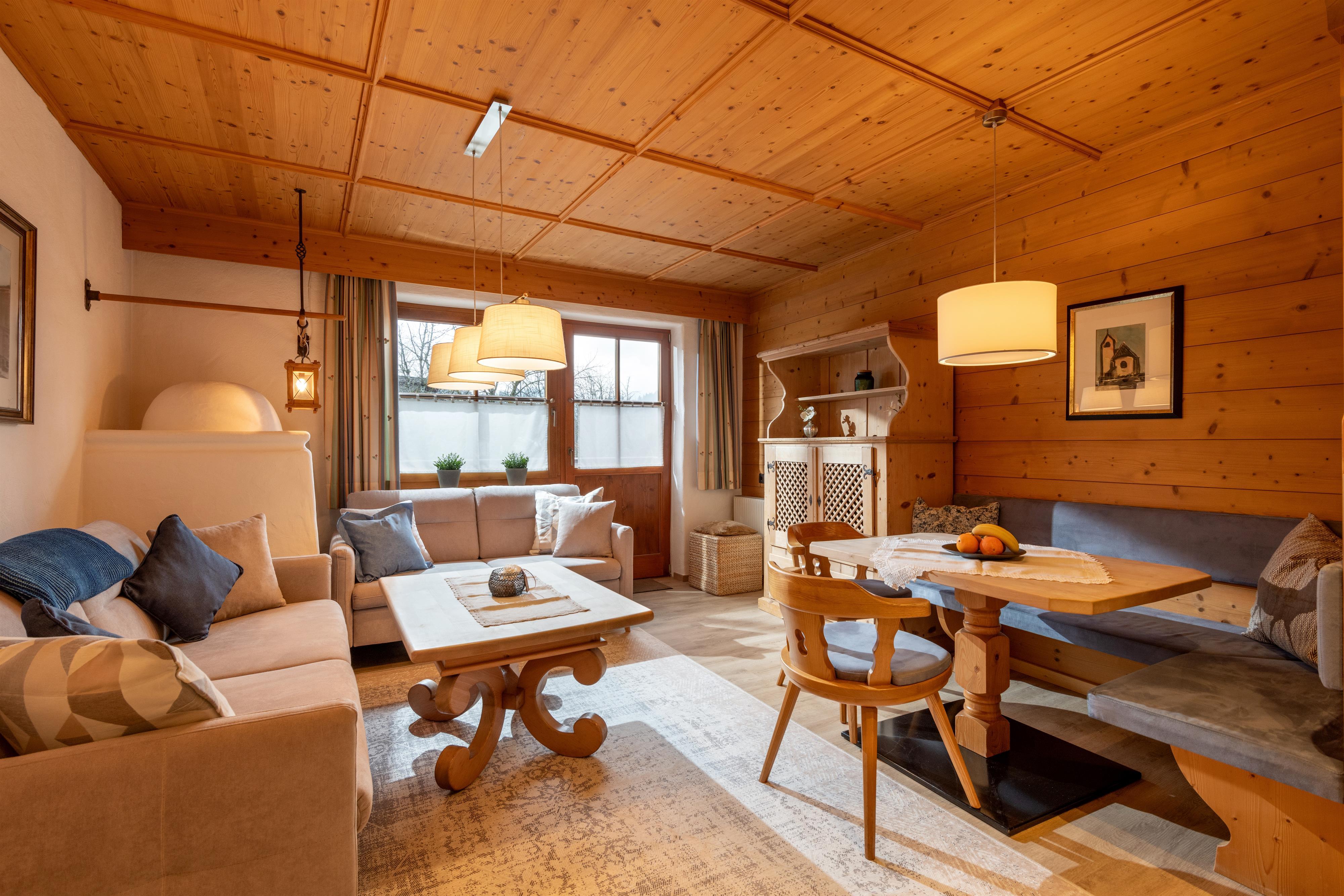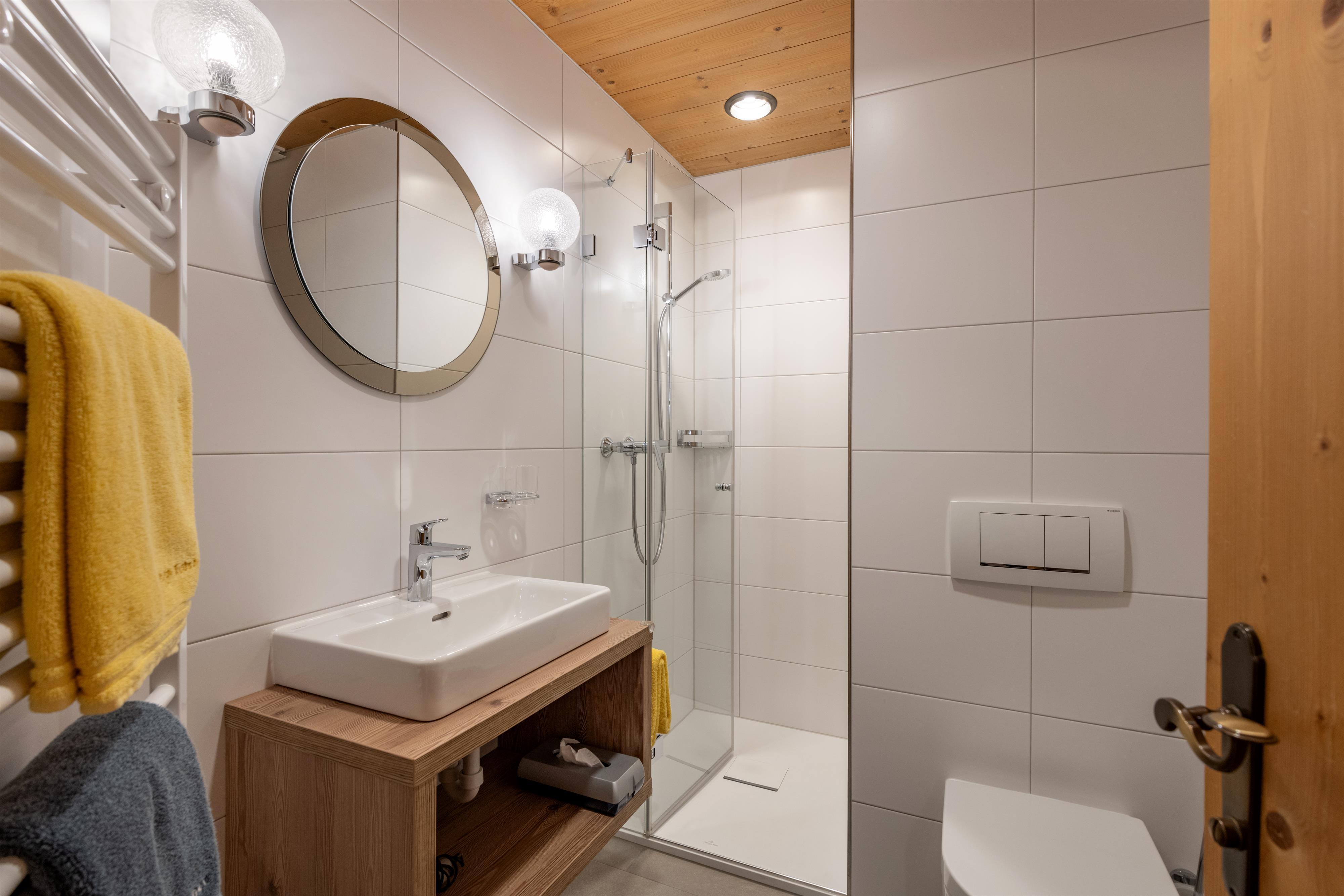 Gemütliches Appartement mit heller Holzverkleidung und elektrischem Kachelofen. Das Appartement hat einen Vorraum mit Garderobe, zwei Schlafzimmer, zwei Badezimmer mit Dusche, ein separates WC, eine bestens ausgestattete Küche und einen Wohnraum. Im Sommer können Sie auch die Terrasse nutzen.