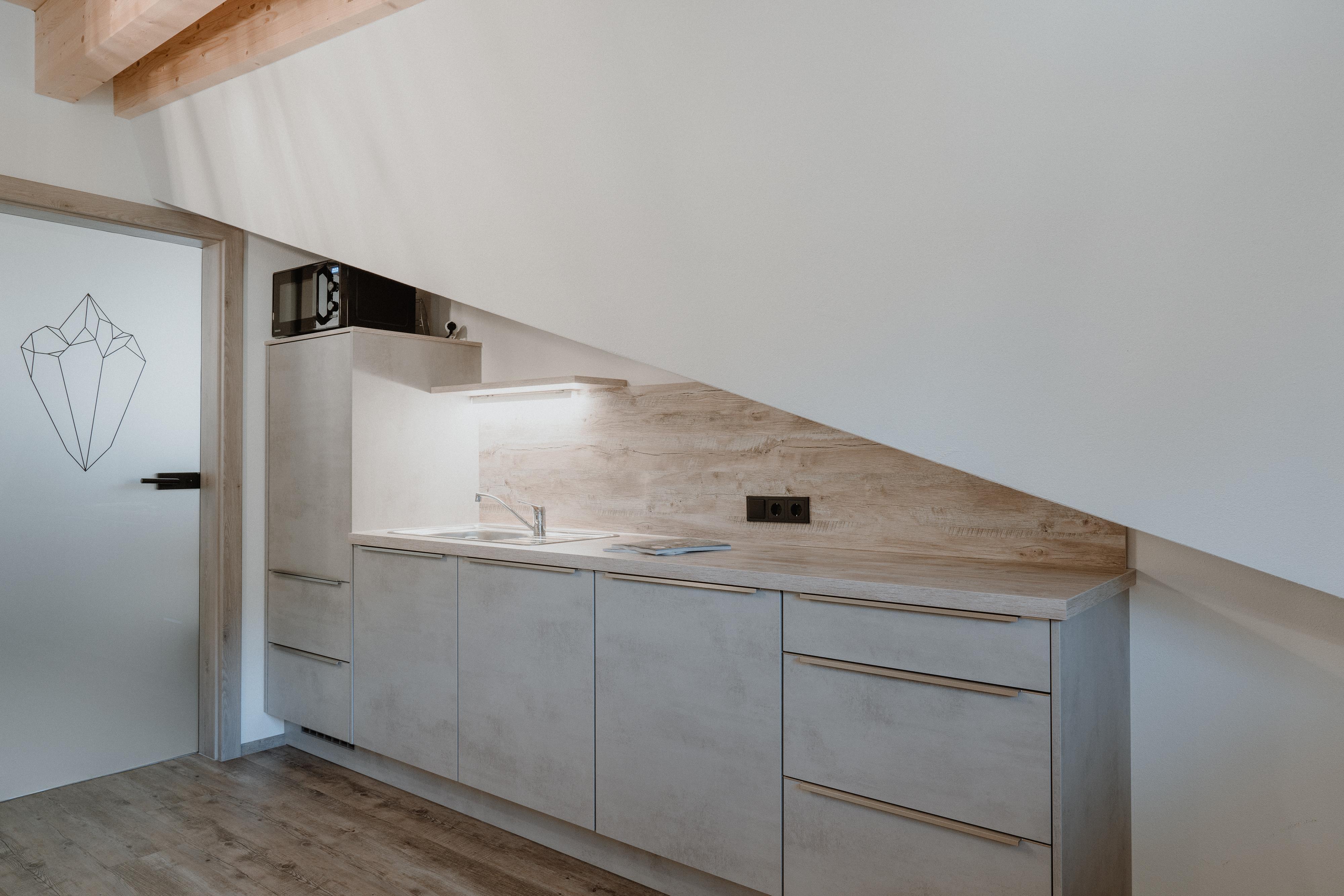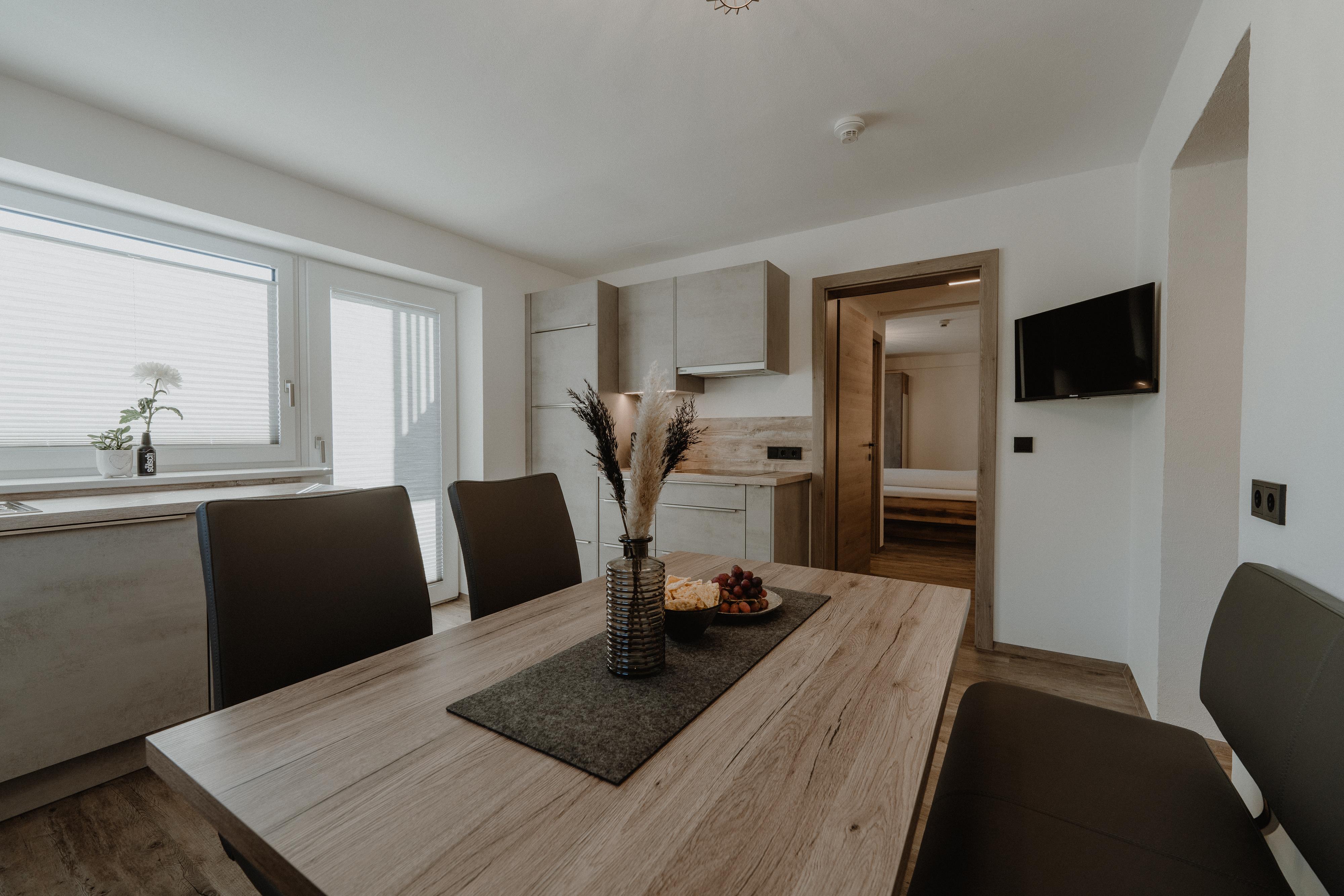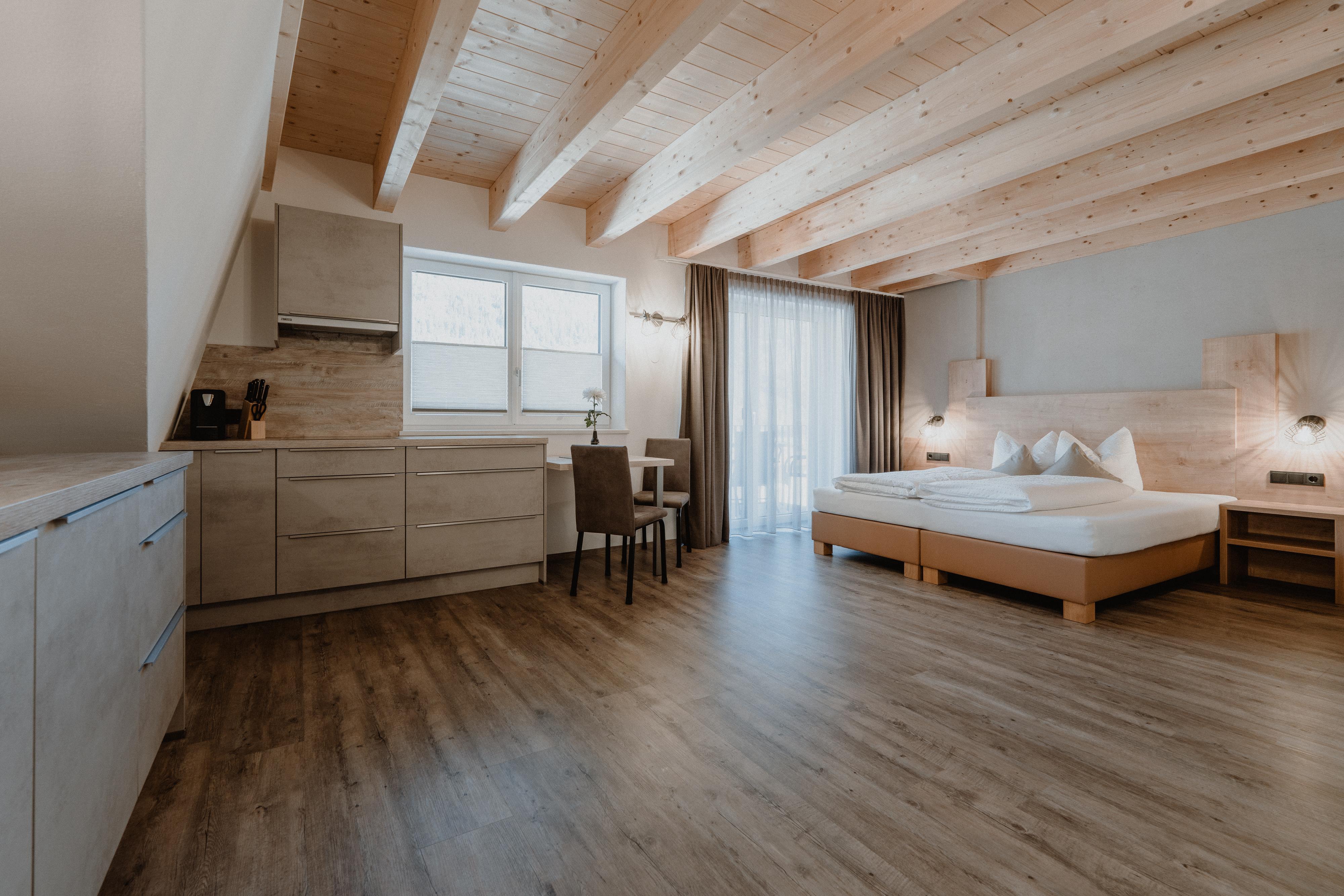 NEUES Top 6 (ca. 28 m²): Studio mit offenem Wohn-Schlafraum mit Doppelbett, voll augestatteter Wohnküche (Cerankochfeld, Geschirrspülmaschine, Kühlschrank mit Tiefkühlfach, Mikrowelle, Toaster, Kaffeemaschine, Wasserkocher uvm.) und Flat-TV. 1 Badezimmer mit Dusche/WC. Ostseitig gelegener Balkon für unvergessliche Stunden.