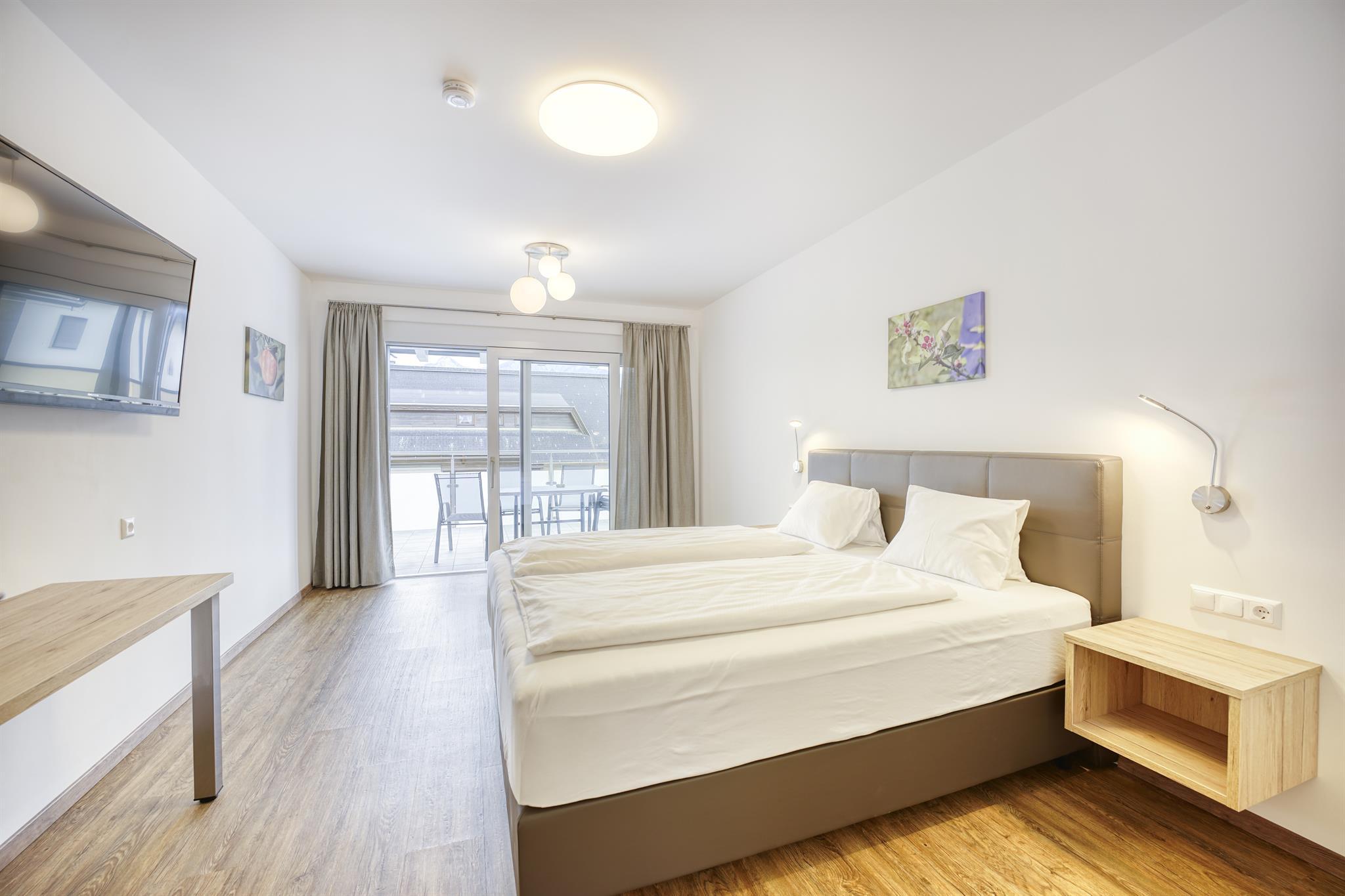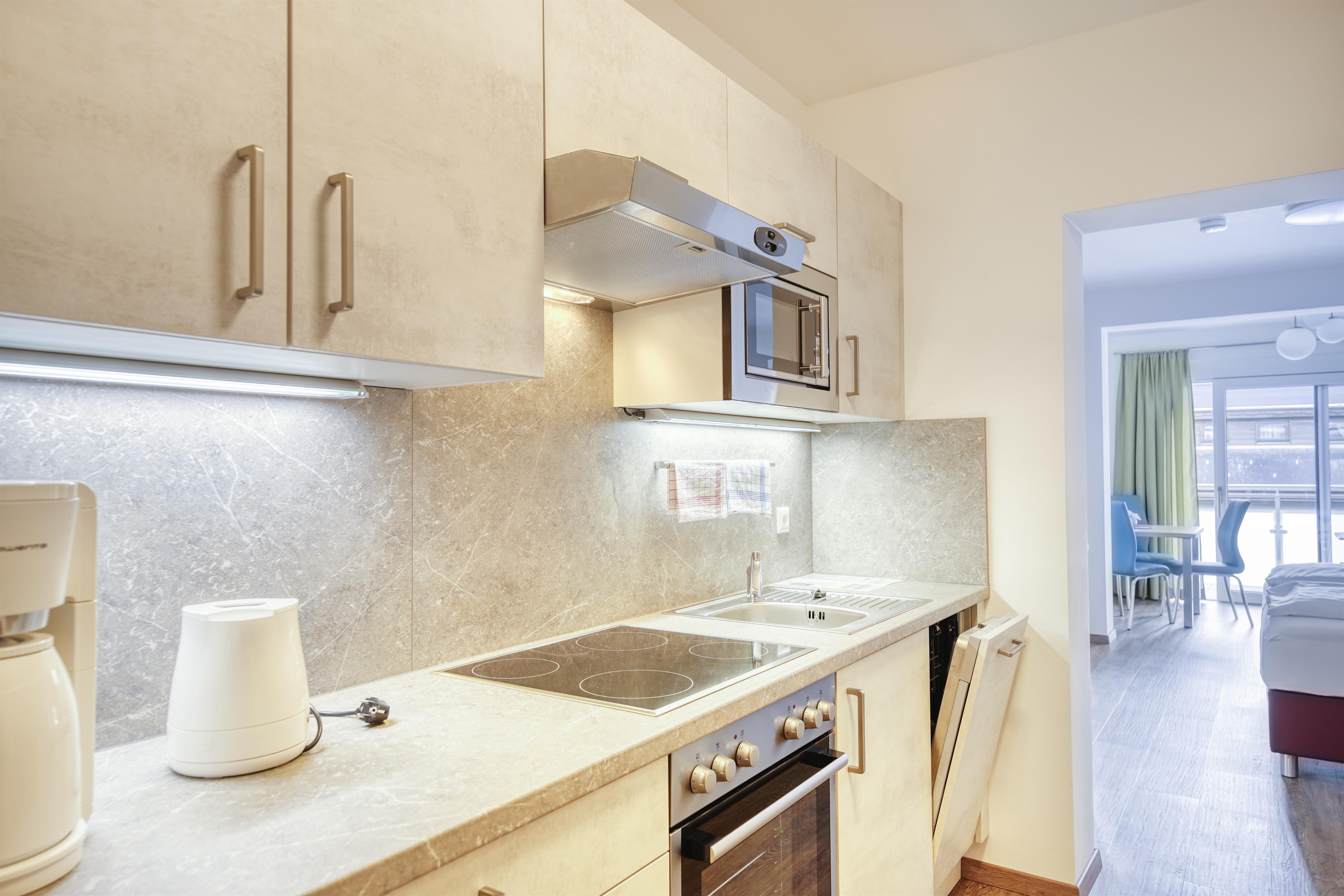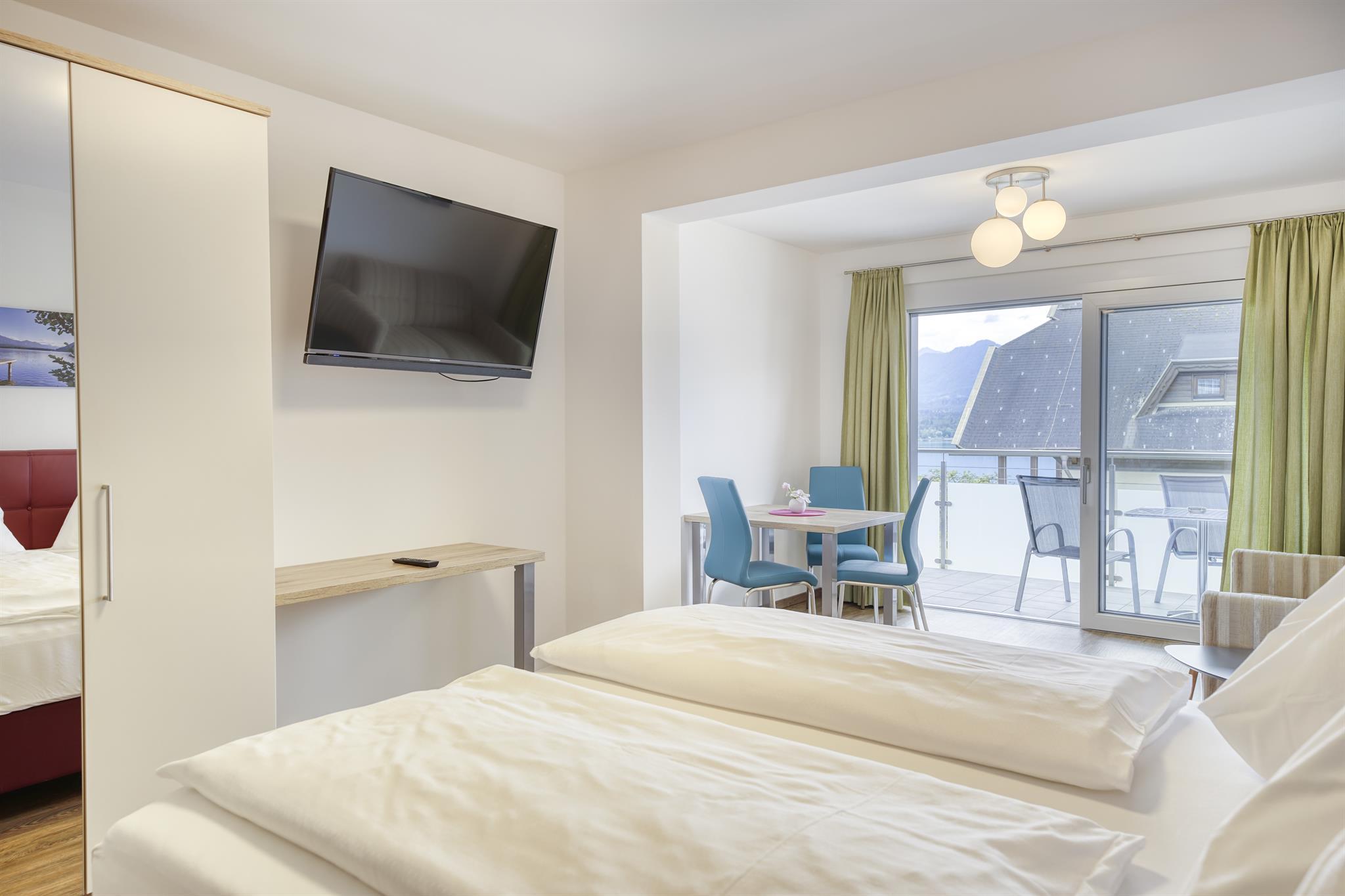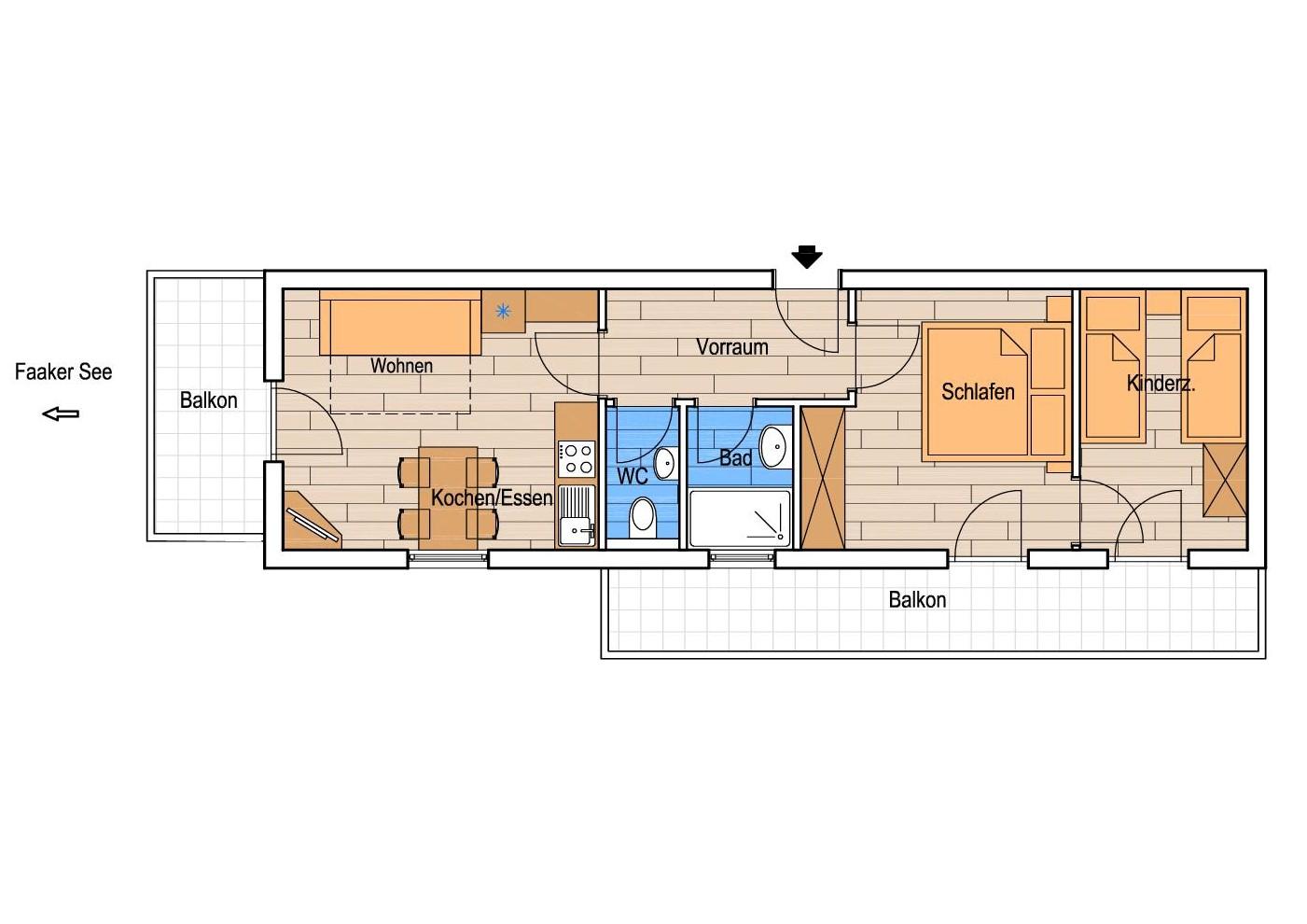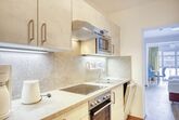 Unsere Ferienwohnung im Haus 1, ist mit 1 Wohnschlafraum, Küchenzeile - komplett eingerichtet mit Geschirrspüler Backrohr, Ceranfeld, Wasserkocher, Toaster und Kaffeefiltermaschine, Dusche, WC, Sat-TV, gratis WLAN und Balkon. Bade- und Handtücher, Bett und Tischwäsche sind vorhanden. Eigener Badestrand!