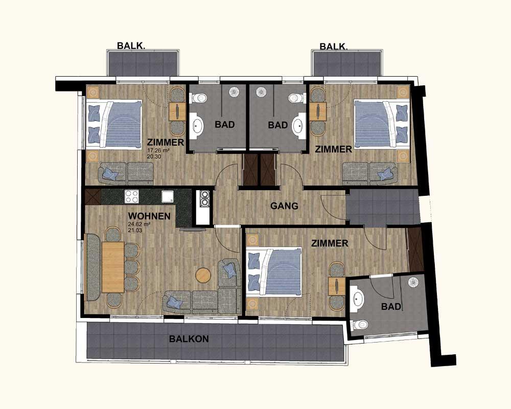 Im Panorama Deluxe Apart im 3. Obergeschoss, trifft Design auf heimische Holzarten und erlesene Materialien, stets inspiriert von der umliegenden Natur und einem Ausblick, der einen erstaunen lässt. 100 m² Wohnerlebnis mit den angenehmen Farben und dazu ein Hauch von schlichtem Luxus, machen dieses Apart Deluxe zu etwas Besonderem: