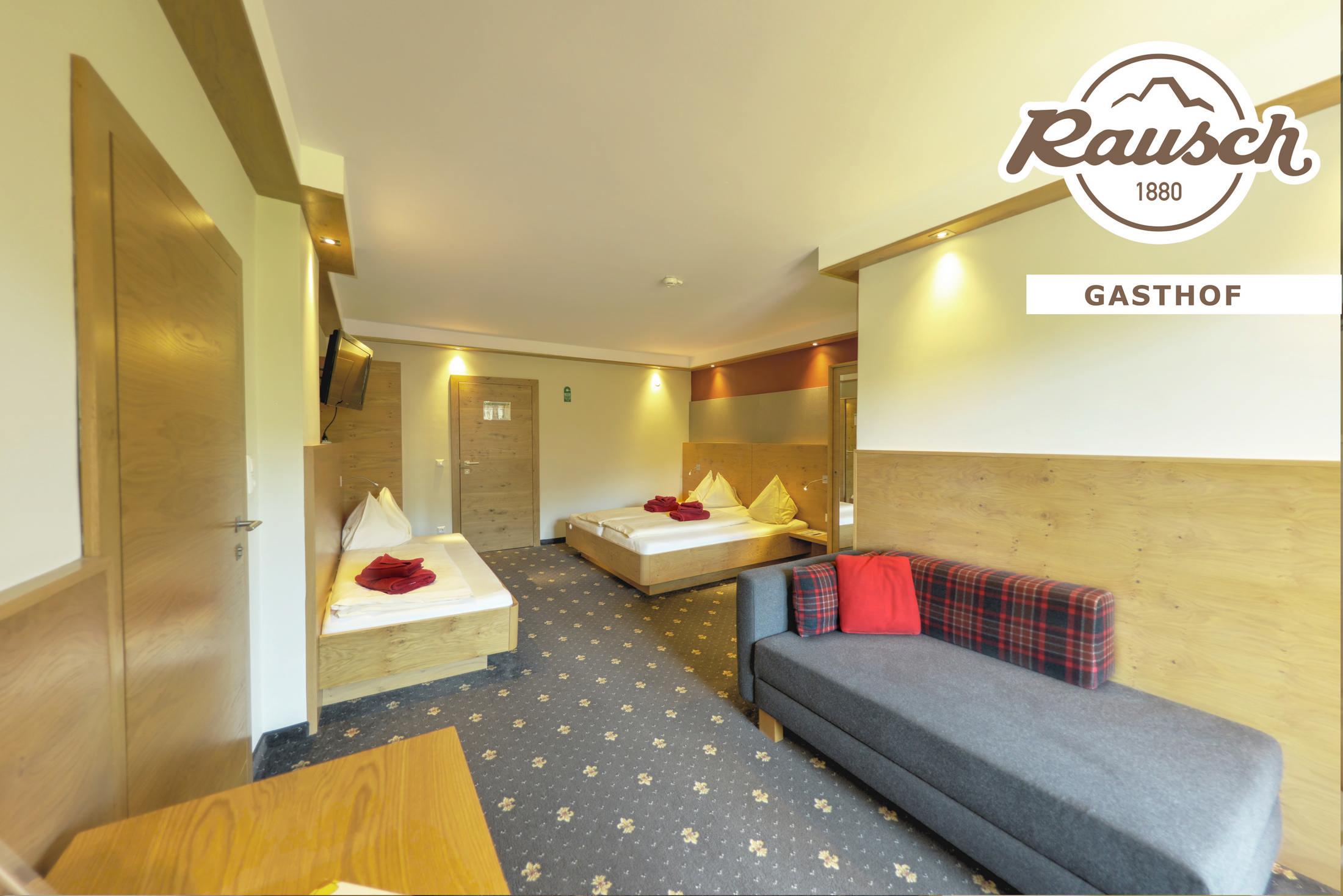 Unser Familienzimmer im Gasthof ist ein modernes Familienzimmer und verfügt über 1 Doppelbett, 1 Doppelschlafcouch oder 1 Einzelbett und 1 Einzelschlafcouch, Balkon, Sat - Flat TV und ein Badezimmer mit Dusche, Haartrockner und WC. Am Balkon steht auch eine Sitzgelegenheit zur Verfügung.