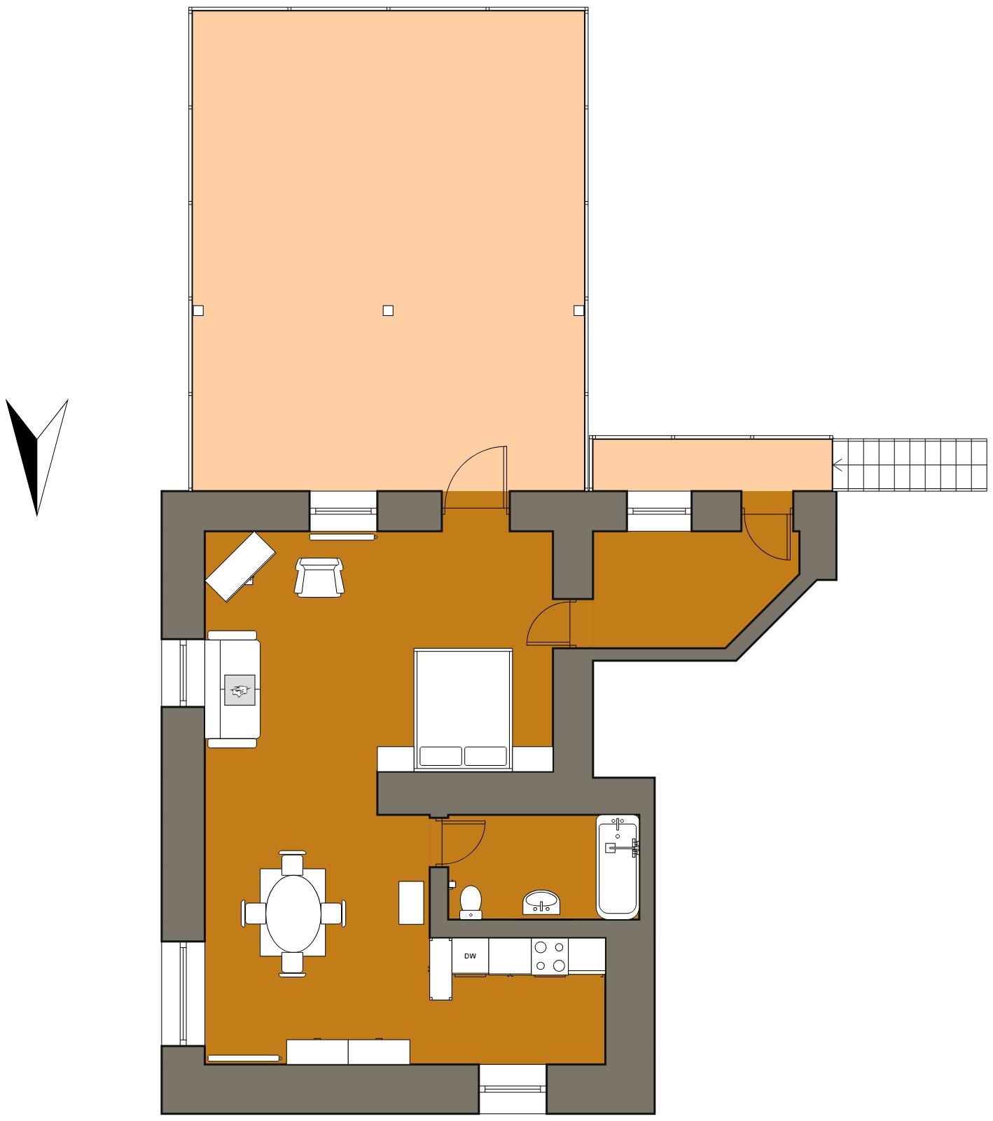 Komplettes Einraumstudio (65m2) für 1-4 Personen mit integriertem Koch- Wohn- Essbereich, Badezimmer und separatem Zugang zum Balkon.