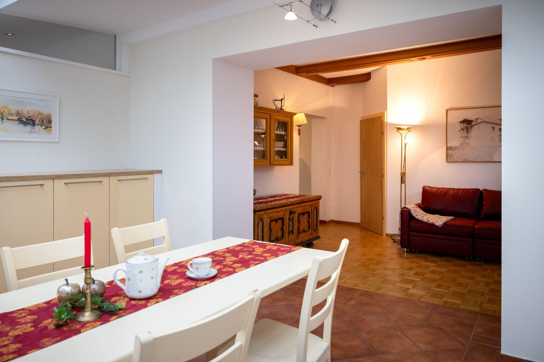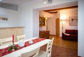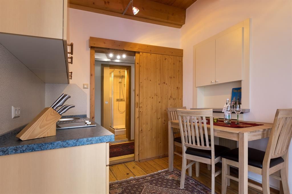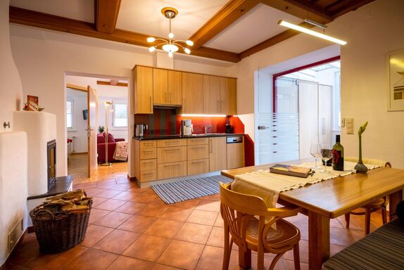 Neben der vollausgestatteten Wohnküche mit Kachelofen, dem Bad mit WC und Dusche, stellt der großzügige Wintergarten das Highlight des Apartments dar. Er lädt zum gemeinsamen Essen und Verweilen ein.