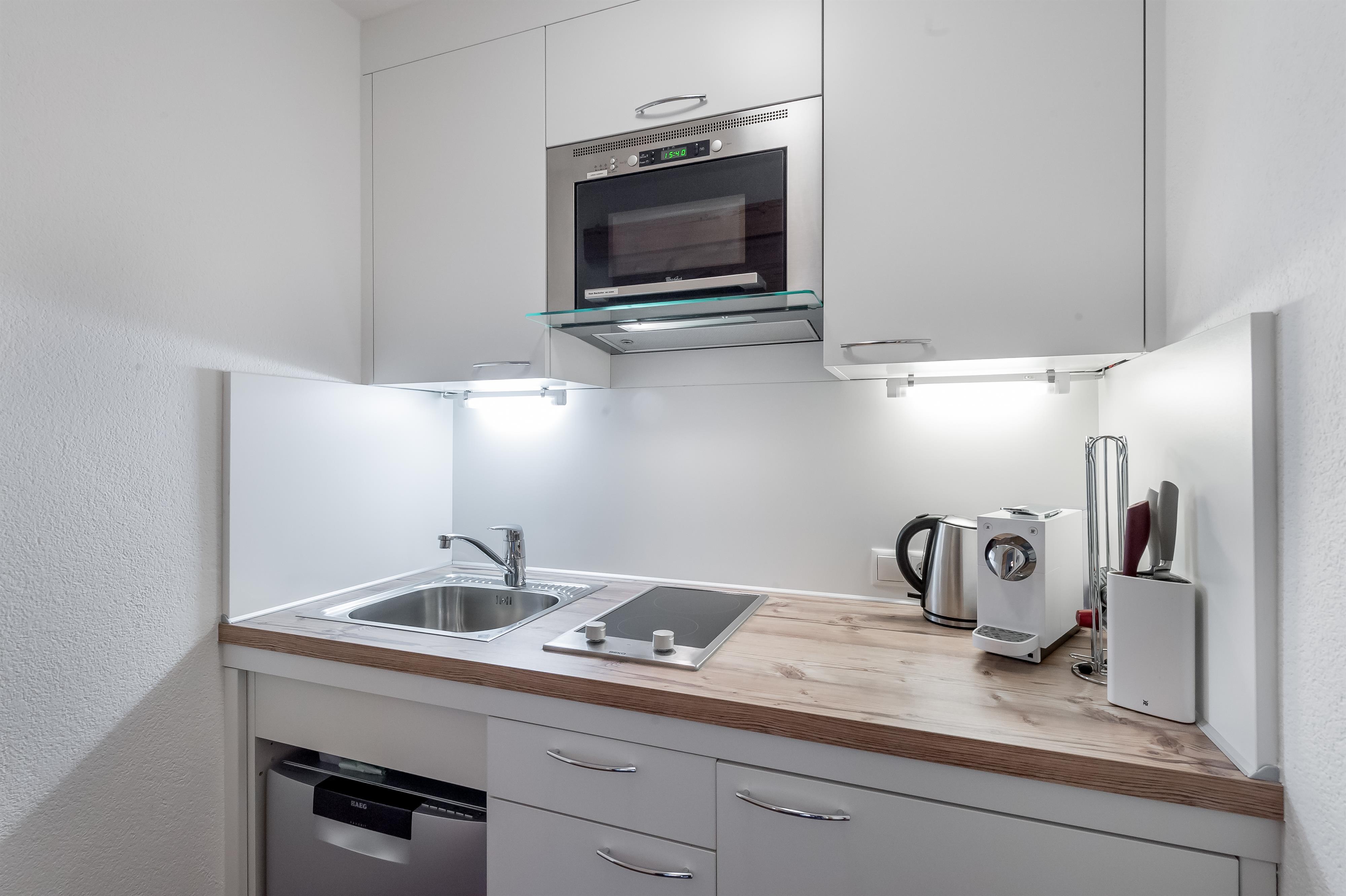 • Vollausgestattete, separate Küche mit Mikrowelle, Wasserkocher, Nespresso Kapsel-Kaffeemaschine, Spülmaschine, Kühlrschrank mit Gefrierfach, Ceranfeld mit 2 Kochfeldern, Kochgeschirr, Speisegeschirr und Besteck