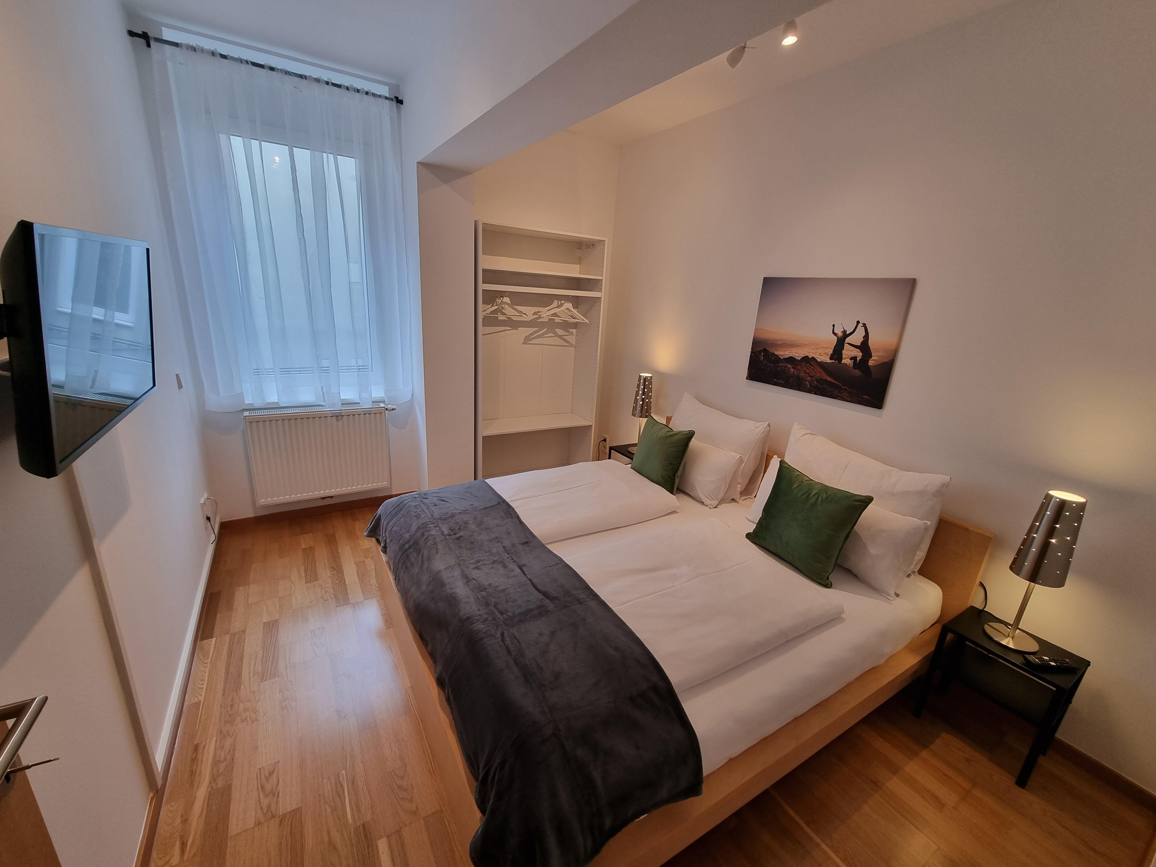 Studio S Appartement, das Appartement verfügt über einen Vorraum, Bad mit Dusche / WC, 1 Schlafzimmer mit einem Doppelbett 160 x 200, Küche, Raumteilerschrank, Kellerraum für Ski- bzw. Fahrräder (Allgemeinfläche).