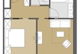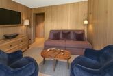 Suite 38m²: Schlafzimmer mit Doppelbett, Wohnzimmer mit Doppelschlafsofa, Badezimmer, Haarfön, Kosmetikspiegel, WC separat, Flat-TV, Safe, Telefon und kostenloses W-Lan. Französche Fenster mit herrlicher Panoramablick auf das Dorf und die Lecher Berge.
