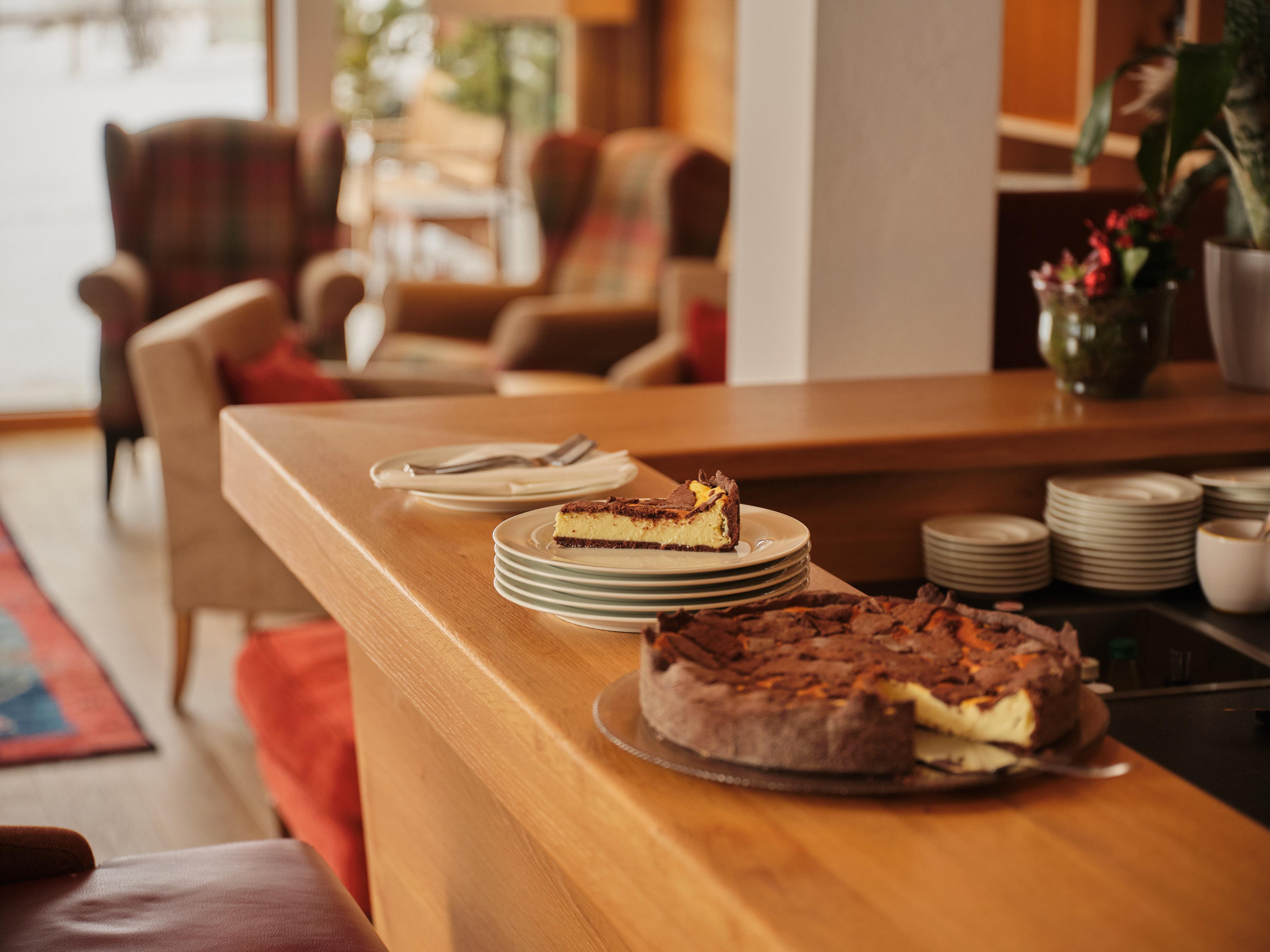 Wenn es draußen stürmt und schneit, machen Sie es sich am knisternden Kamin in unserer Lounge mit Hausbar gemütlich. Nachmittags servieren wir dort hausgemachte Kuchen zu feinem Kaffee vom Barista.