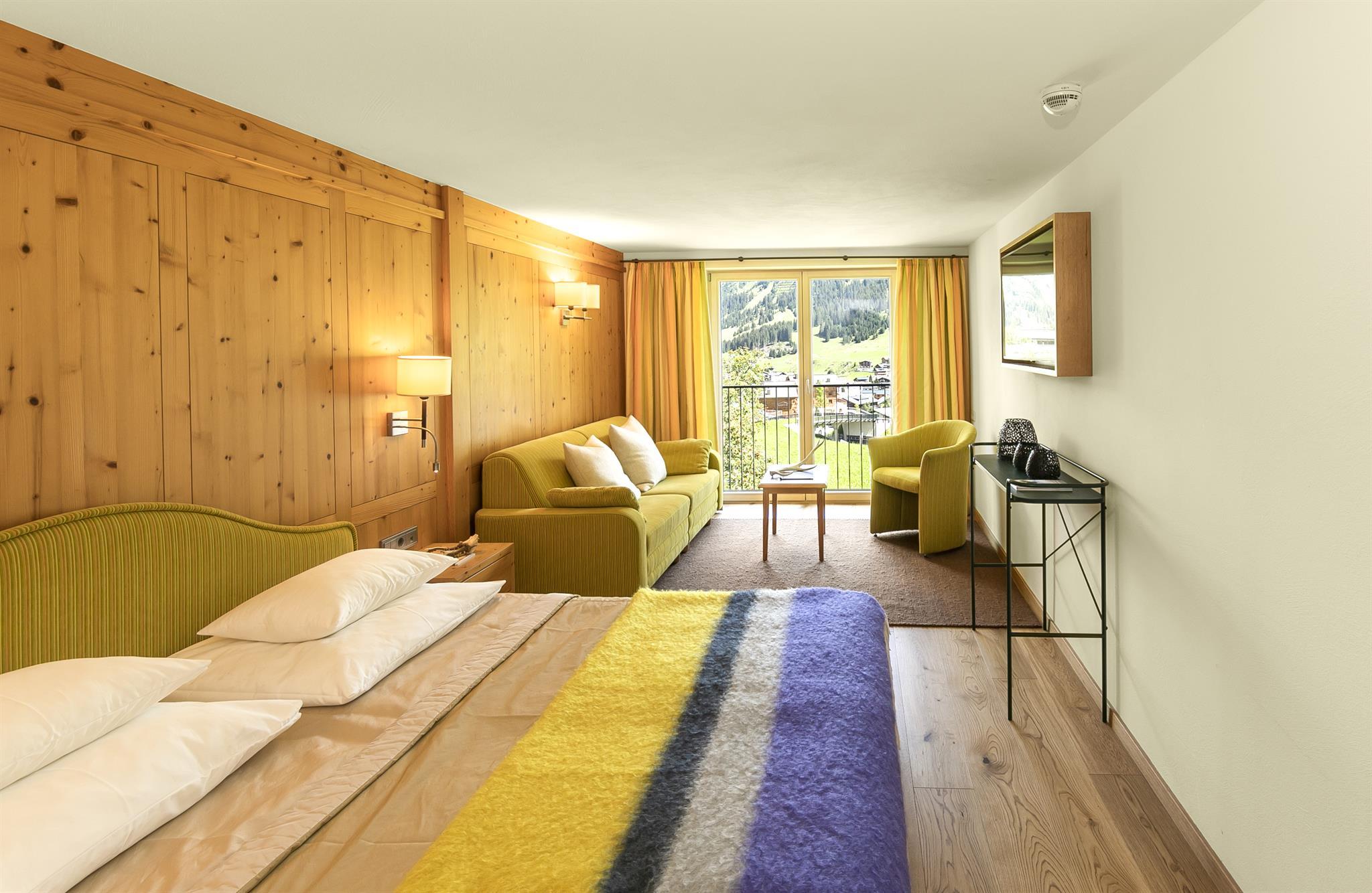 Unsere hellen Zimmer, Suiten und Appartements, größtenteils mit Balkon oder französischem Balkon, sind mit viel Holz von unseren heimischen Tischlern ausgestattet. Wunderschöne Wollstoffe und klassisch gehaltene, helle Bäder laden zum Wohlfühlen ein.