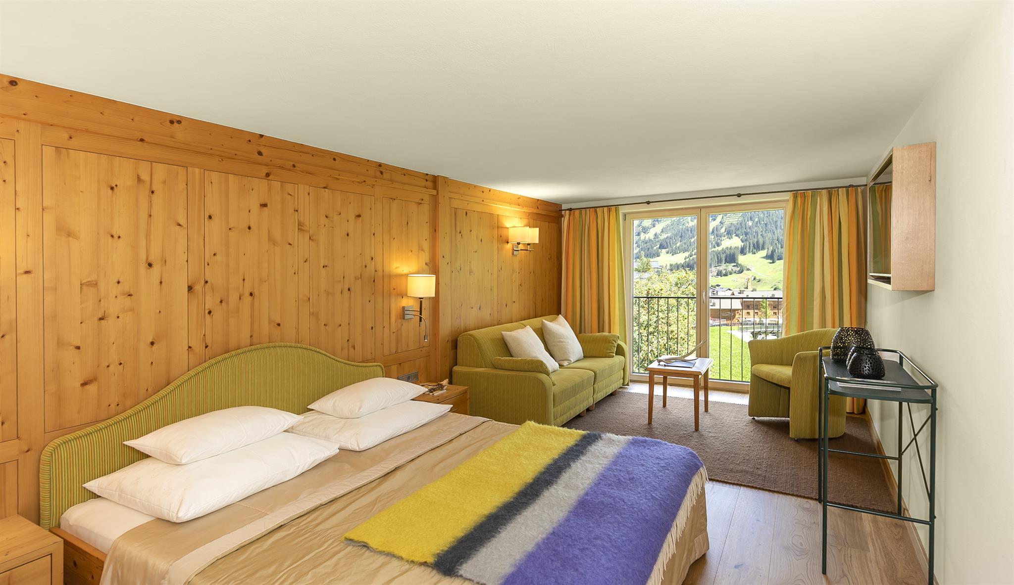 Doppelzimmer 28m²-35m² mit französischem Balkon und Panoramblick auf Lech. Doppelbett, Sitzecke mit Ausziehcouch, Badezimmer mit Badewanne und WC, Haarfön, Kosmetikspiegel. Flat-TV, Safe, Telefon und W-Lan.