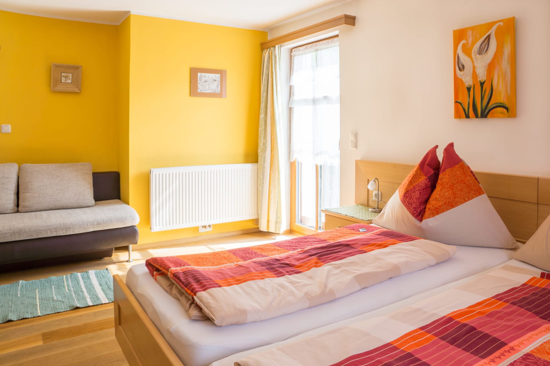 • Komfortzimmer Morgensonne ebenfalls mit Terrasse und Abgang in den Garten, Couch, Bad/WC, Sat-TV, Radio, Internetanschluss.