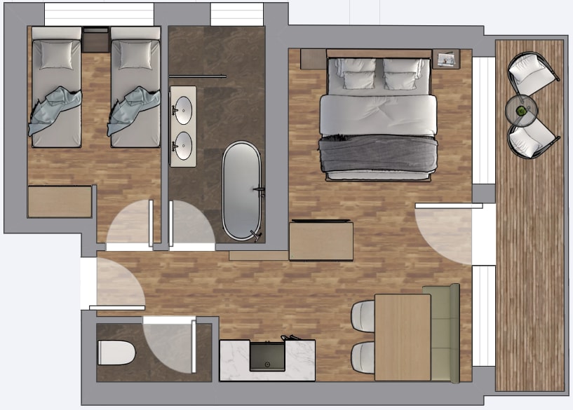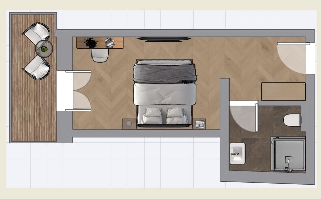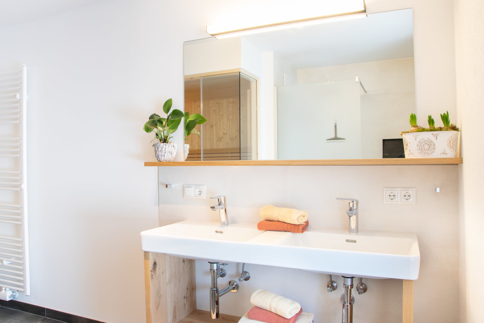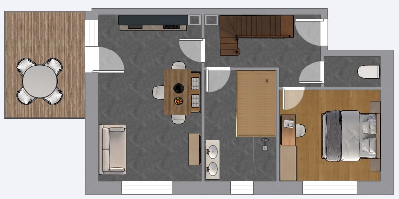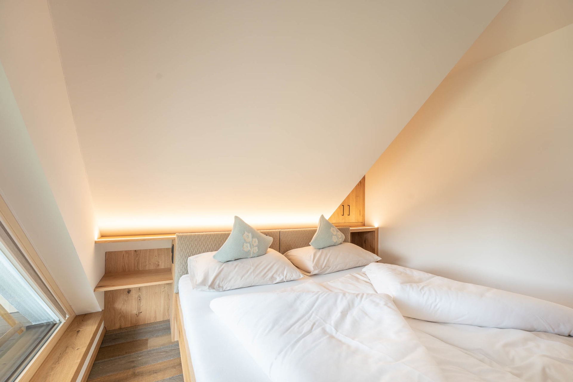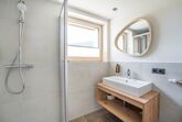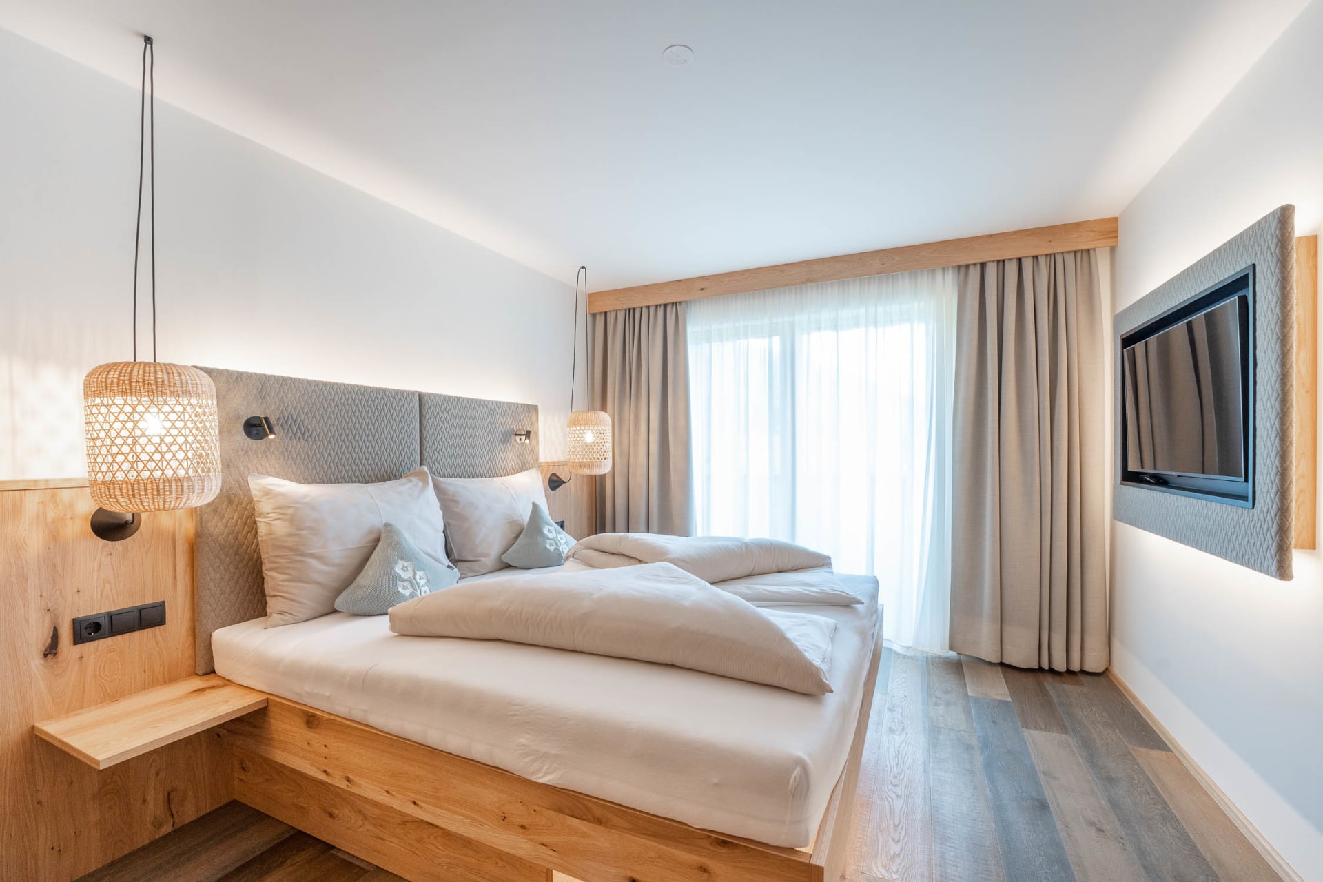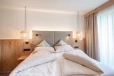 Ausgestattet sind unsere DorfLeben Zimmer mit einem Doppelbett ohne Fußteil, einem Südbalkon, einer Dusche und WC, sowie Edelholzböden, Wlan, Föhn und Smart TV.
