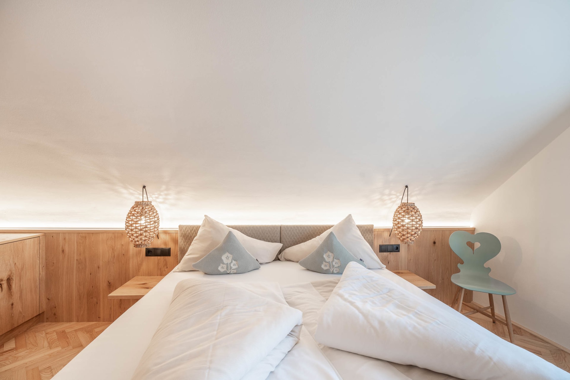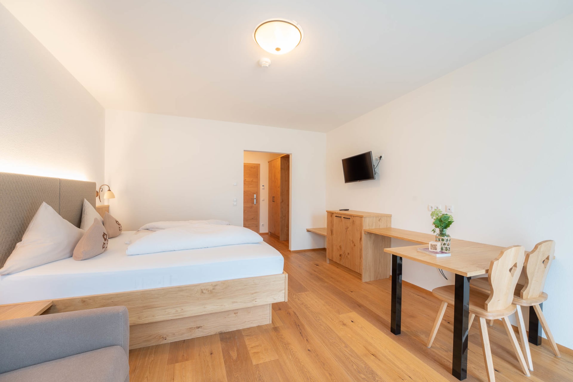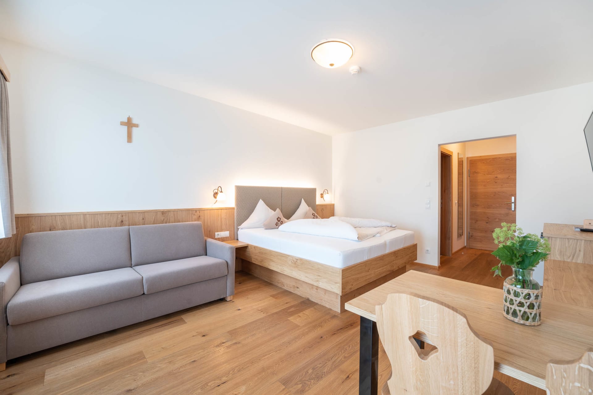27m², welche für 1-3 Personen konzipiert sind: ein Doppelbett, sowie eine komfortable Schlafcouch finden in dem nördlich ausgerichteten Berg,-Wiesenblickzimmer Platz.