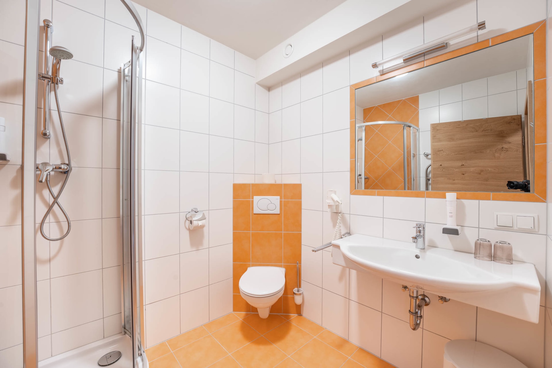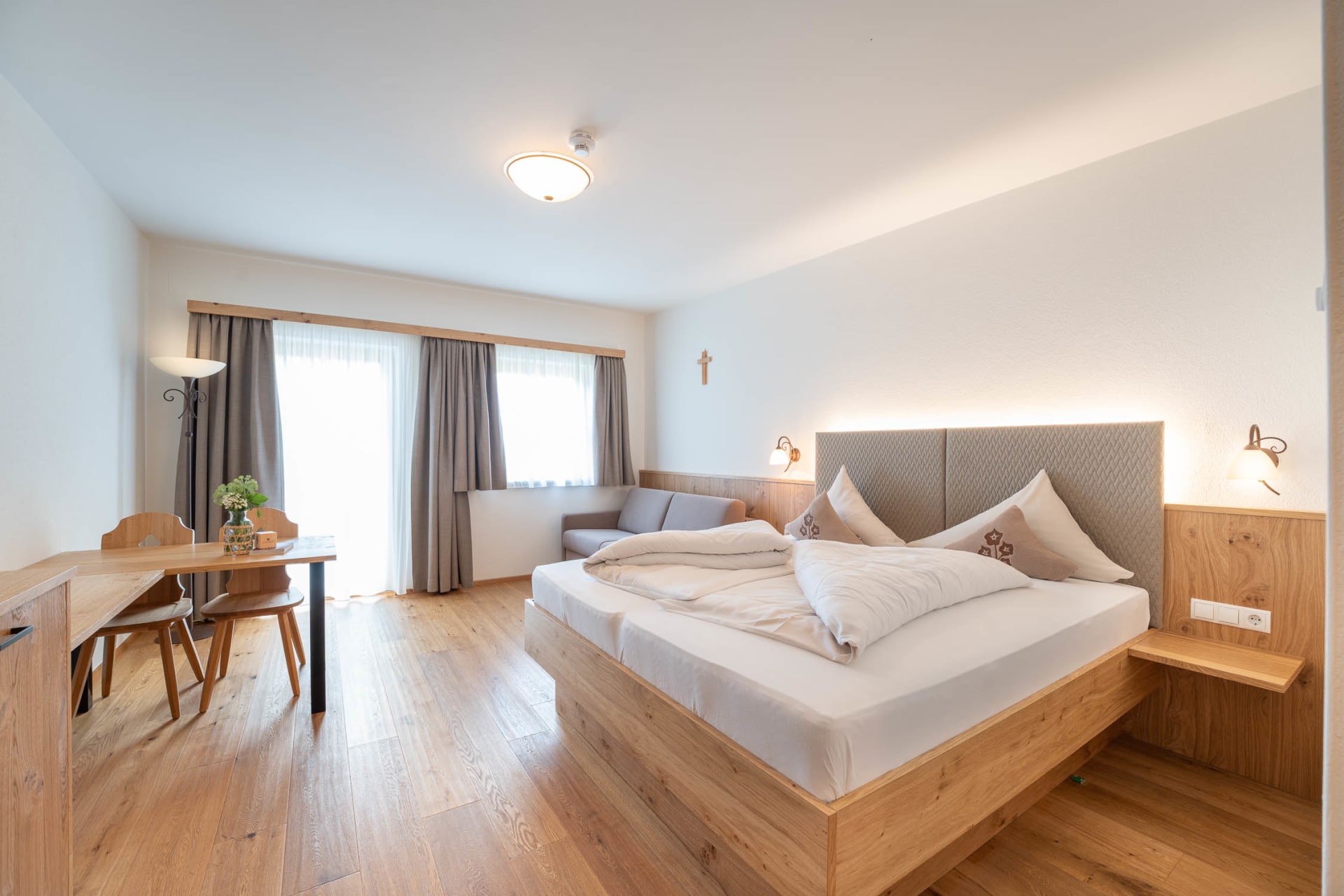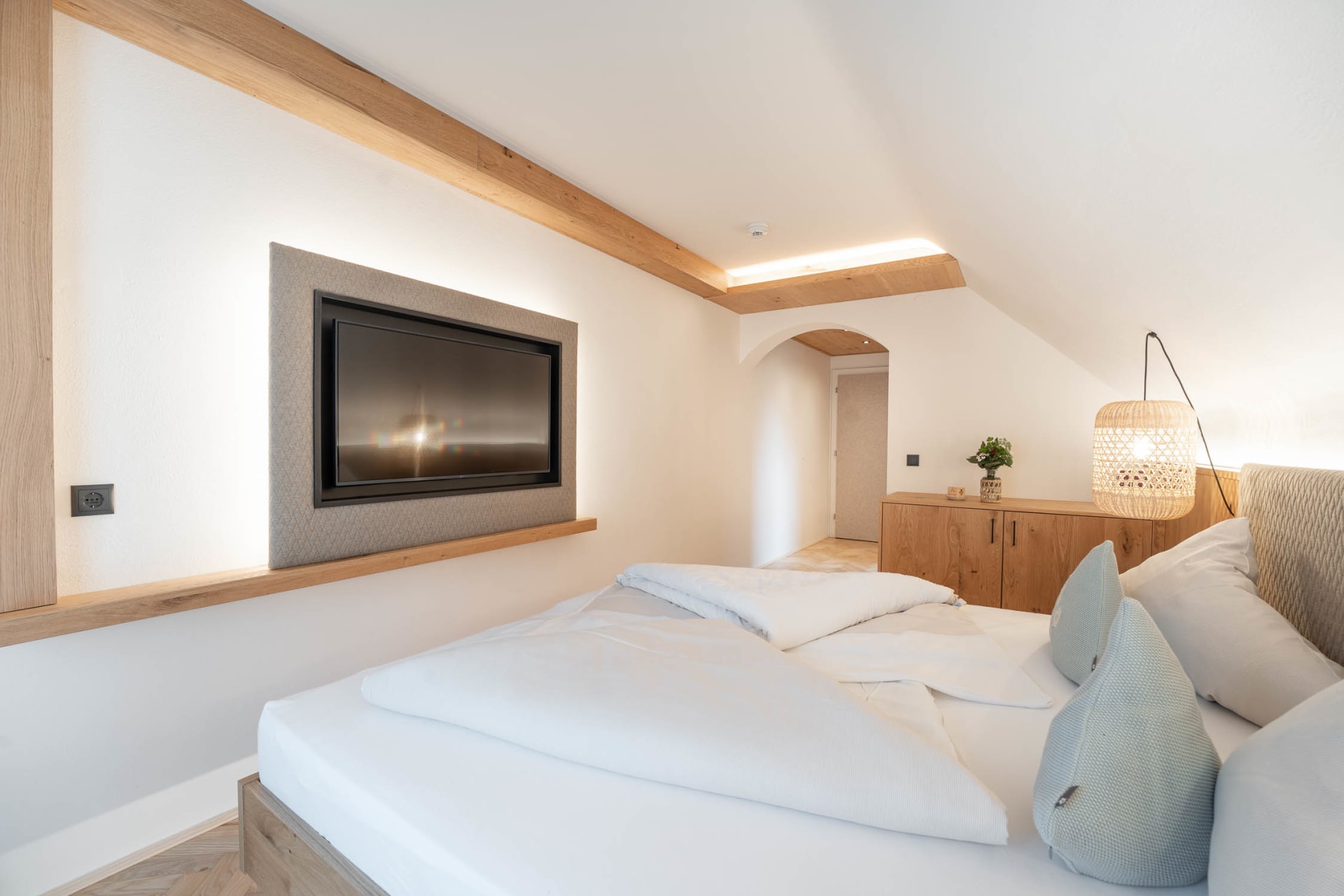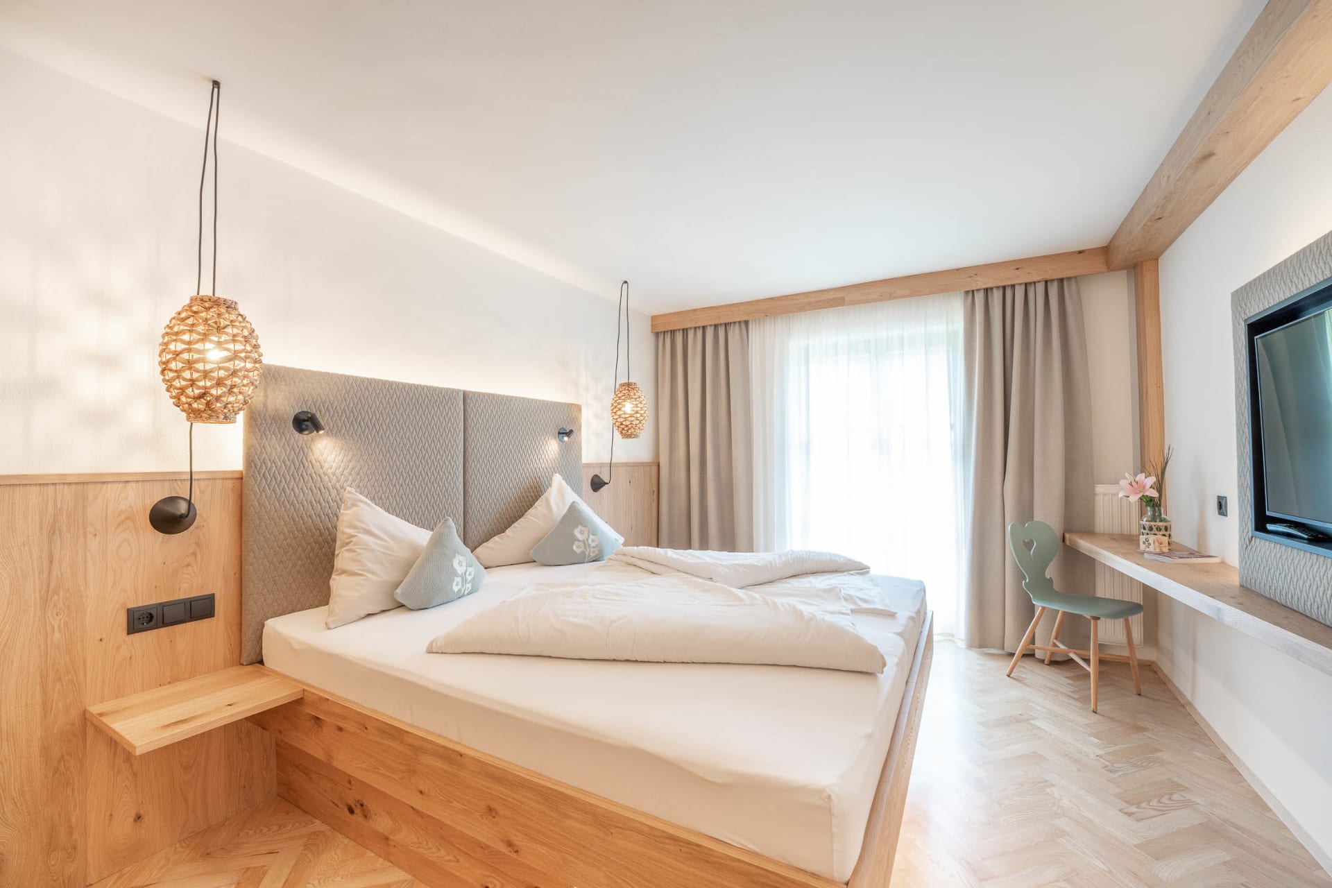Ausgestattet sind unsere LandLeben Zimmer mit hochwertigen Vollholzmöbeln, einem Holzboden, einer Dusche und WC, sowie Wlan, Föhn und Smart TV.