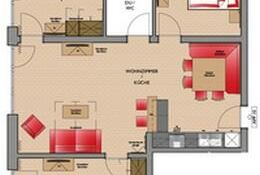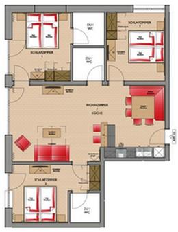 Appartement (86 m²), voll ausgestattete Küche mit Backrohr, Microwelle, Geschirrspül- und Kaffeemaschine, gemütlicher Esstisch, Kabel TV, großer Wohnraum mit ausziehbarer Sofalandschaft, 3 Schlafzimmer mit Doppelbett, großer Kleiderschrank, 3 Badezimmer mit Dusche/WC oder Bad/WC, Balkon