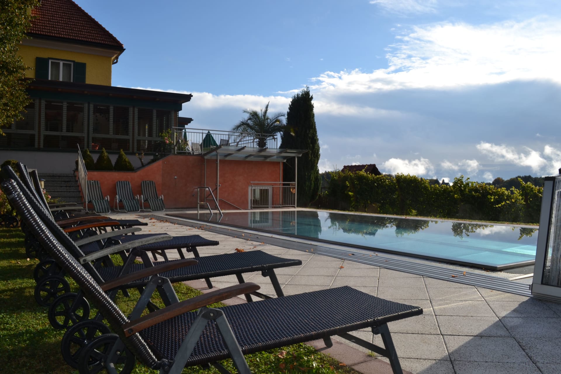 Statt immer zu lächeln, einmal auch zu gähnen. Statt überall dabei zu sein, faulenzt man auf der Liegewiese neben unserem neuen, beheiztem erlebnis Schwimmbad mit Blick in die Weinberge oder in der neuen Wellnesslandschaft (1oo m² mit Finnischer Sauna, Dampfbad, Infrarotkabine, Erlebnisdusche, Wärmebank und Trinkbrunnen).
