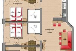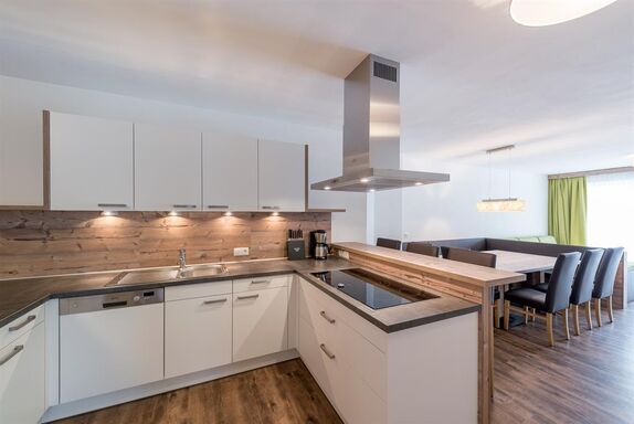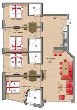 Appartement (115 m²), voll ausgestattete Küche mit Backrohr, Microwelle, Geschirrspül- und Kaffeemaschine, gemütlicher Esstisch, Kabel TV, großer Wohnraum mit ausziehbarer Sofalandschaft, 4 Schlafzimmer mit Doppelbett, großer Kleiderschrank, 4 Badezimmer mit Dusche/WC oder Badewanne/WC, Balkon