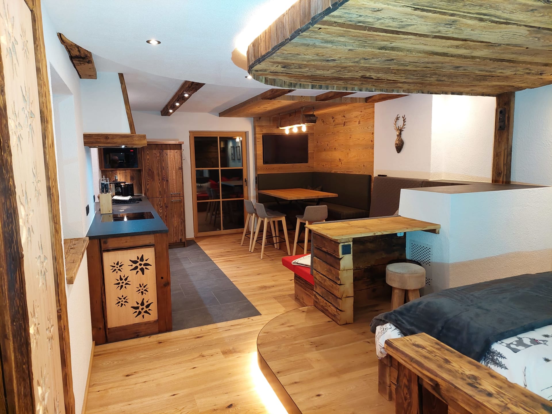 Das Appartement mit ca. 85 m² und separaten Eingang ist sehr hochwertig und mit Liebe zum Detail eingerichtet. Es besteht aus: 1 großen, gemütlichen und offenen Wohnraum mit einer vollausgestatteten Küche inkl. Spülmaschine, Cerankochfeld, Backrohr, Mikrowelle, uvm.; Essbereich mit  Sat-TV; selbstregelnder, beheizter Bauernofen für kuschelige Tage.