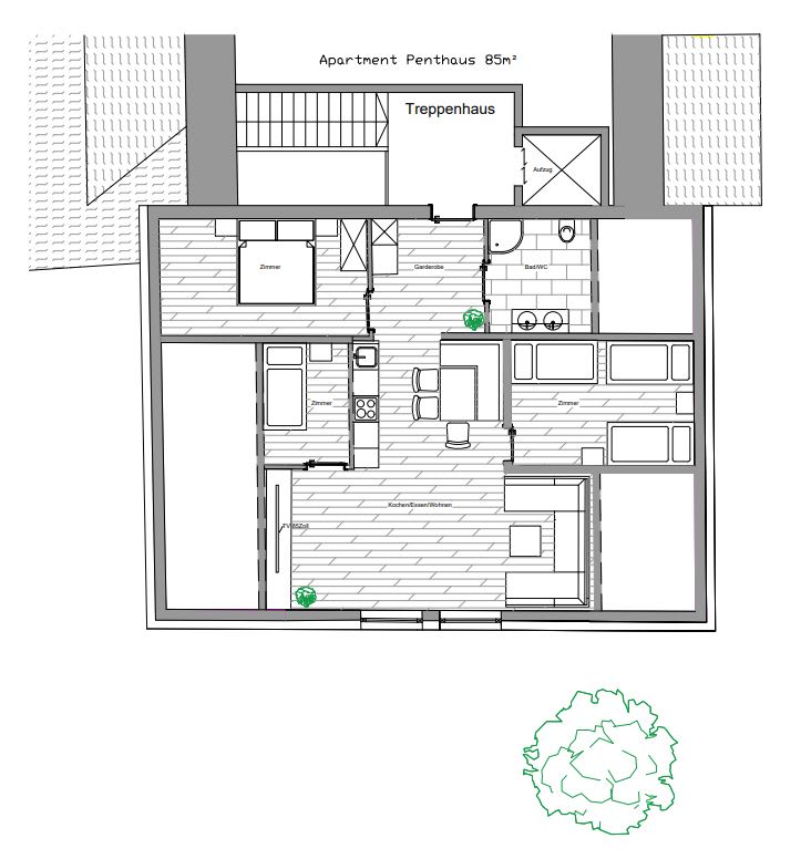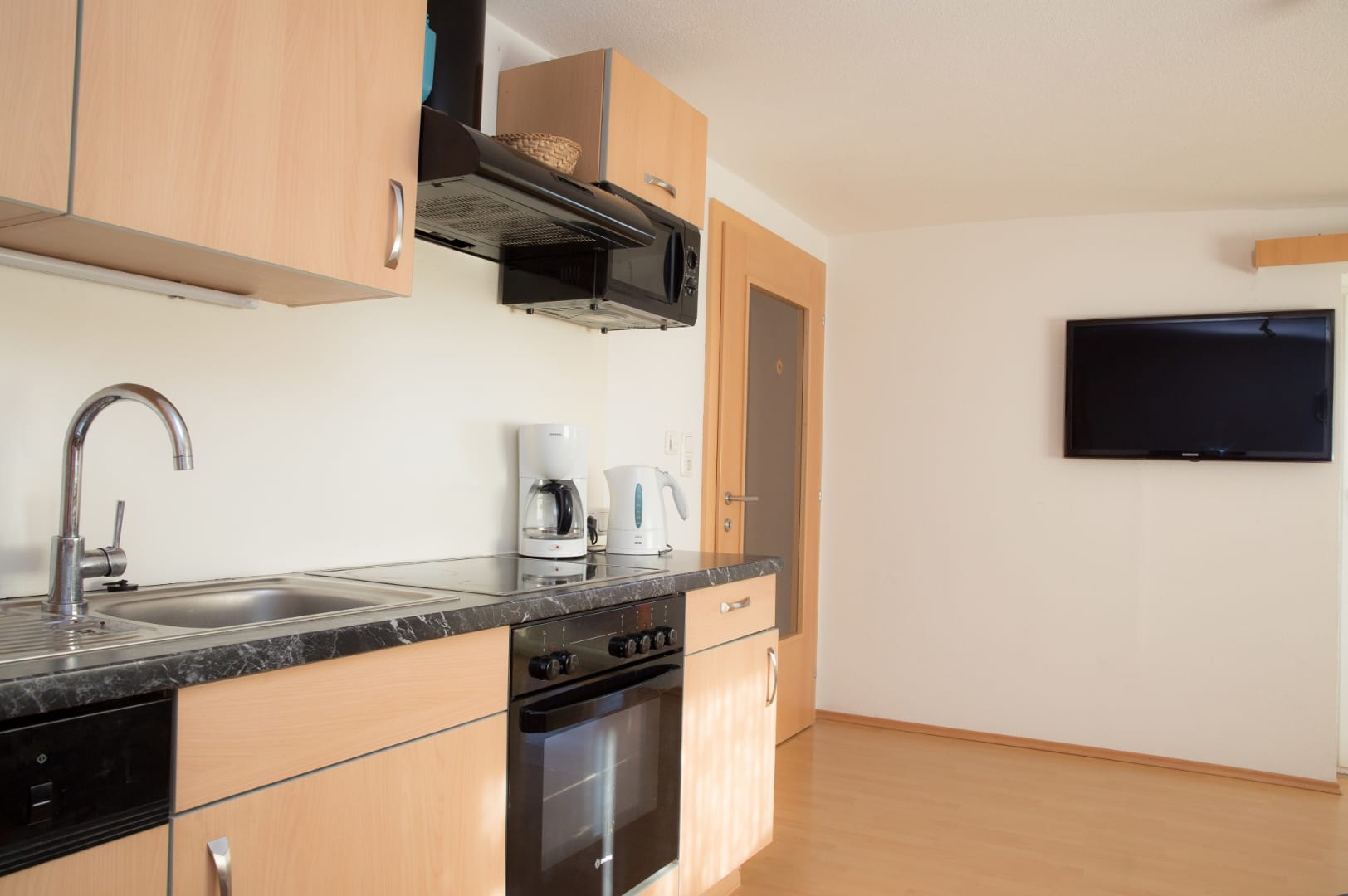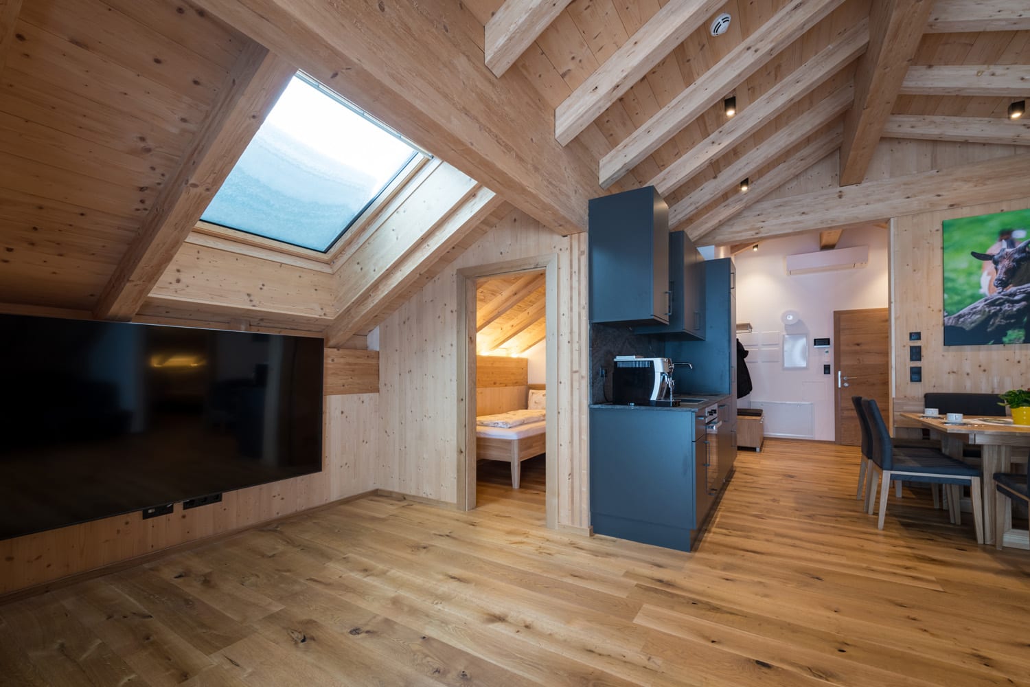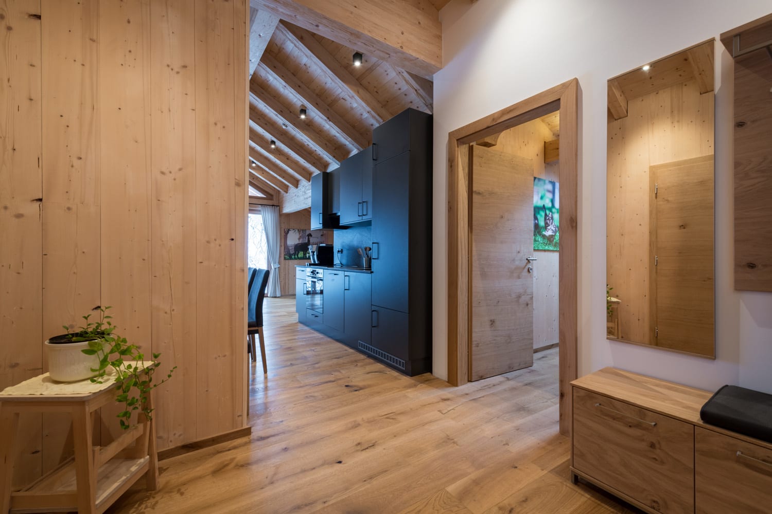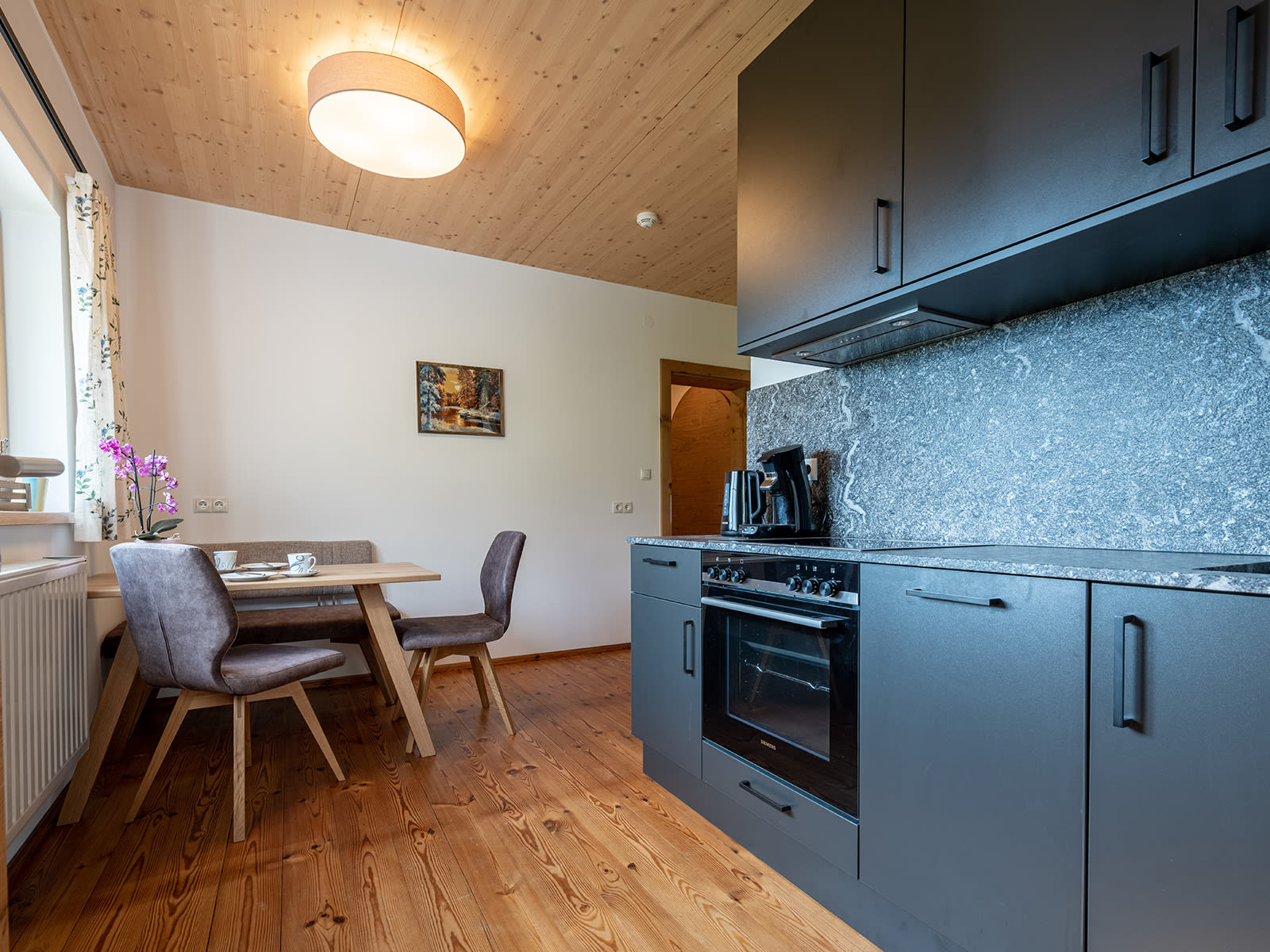 Neues Apartement für 2 Personen + 1 Kleinkind, Gitterbett und Hochstuhl vorhanden,Wohnküche, 1 Schlafzimmer mit Zirbenholz , Dusche/WC und Balkon