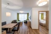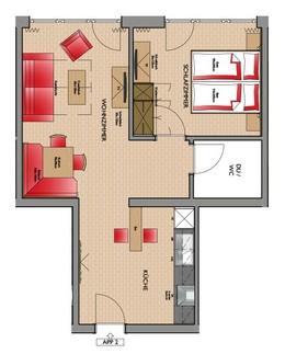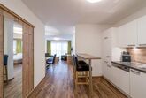 Appartement (46 m²); voll ausgestattete Küche mit Backrohr, Microwelle, Geschirrspül- und Kaffeemaschine, gemütlicher Esstisch, Kabel TV, großer Wohnraum mit ausziehbarer Sofalandschaft, 1 Schlafzimmer mit Doppelbett, großer Kleiderschrank, 1 Badezimmer mit Dusche/WC, Balkon