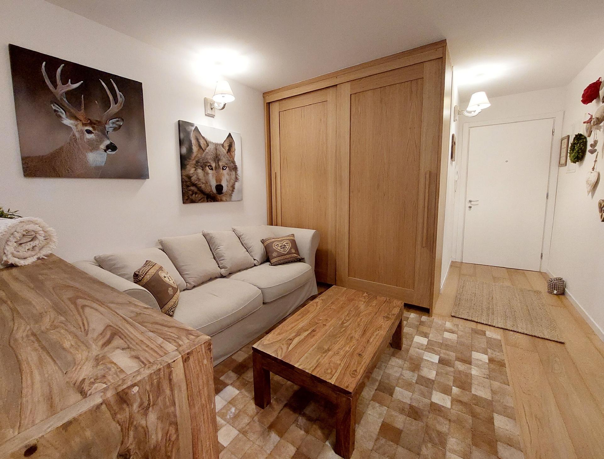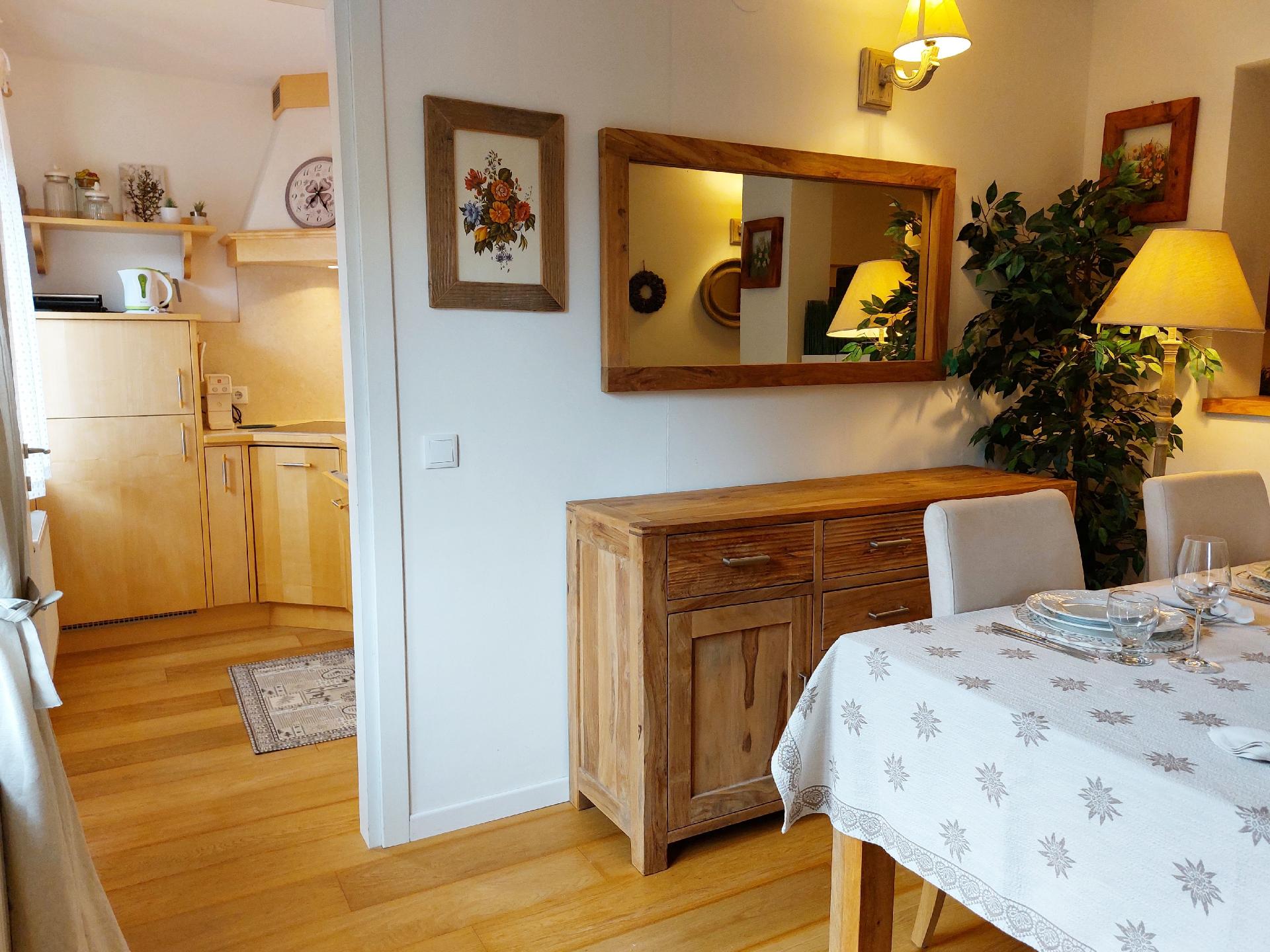 Die Innenausstattung der Wohnung lässt keine Wünsche offen. Ein großzügiges Schlafzimmer mit gemütlichem Doppelbett verspricht ruhige Nächte. Im einladenden Wohnzimmer bietet eine praktische Schlafcouch zusätzlichen Raum für Gäste. Die voll ausgestattete Küche lädt zu köstlichen Mahlzeiten ein, und das moderne Bad mit Dusche sorgt für Komfort und Genuss während Ihres Aufenthaltes.
