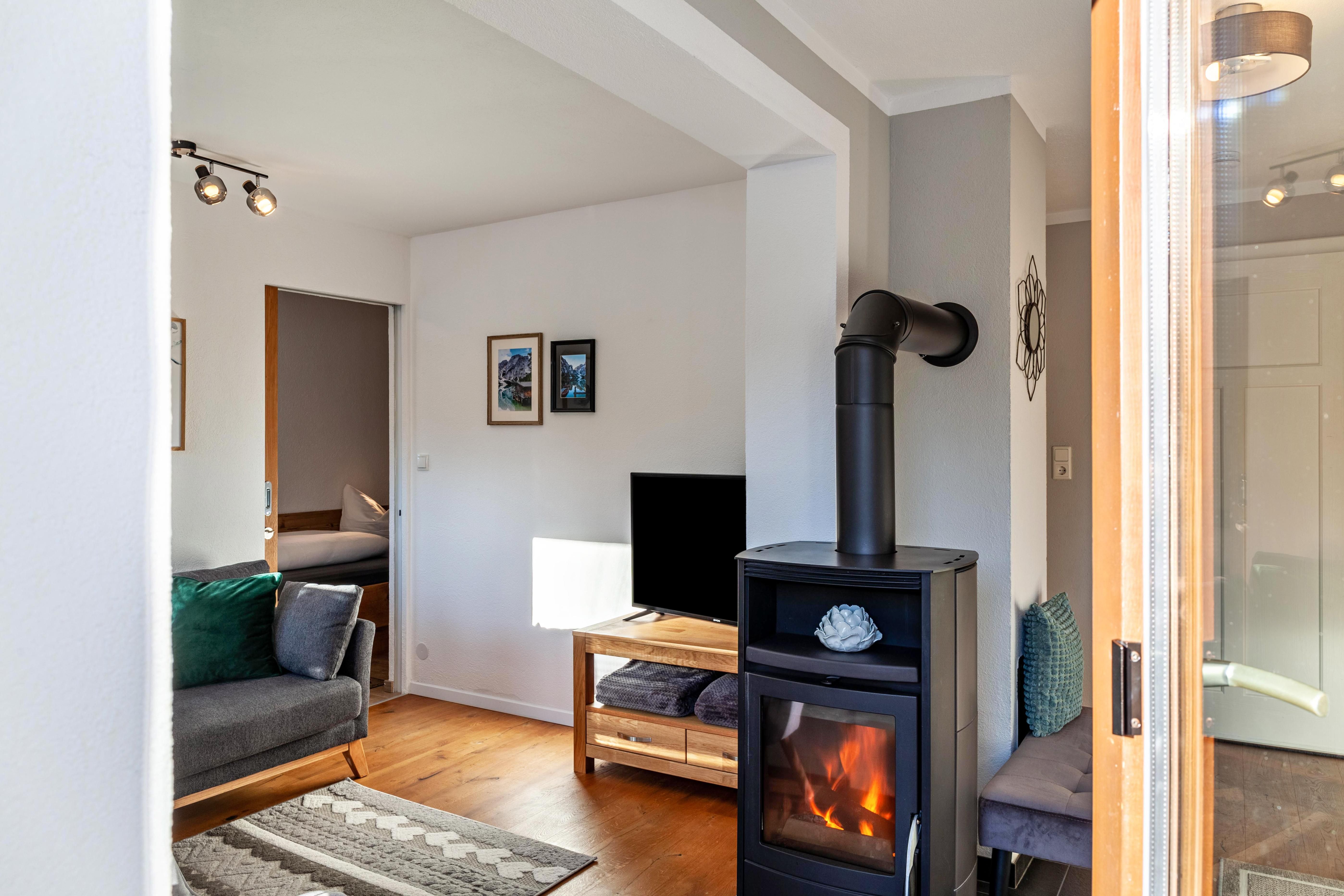 -Wohnzimmer mit Sofa, Ohrensessel und Kaminofen