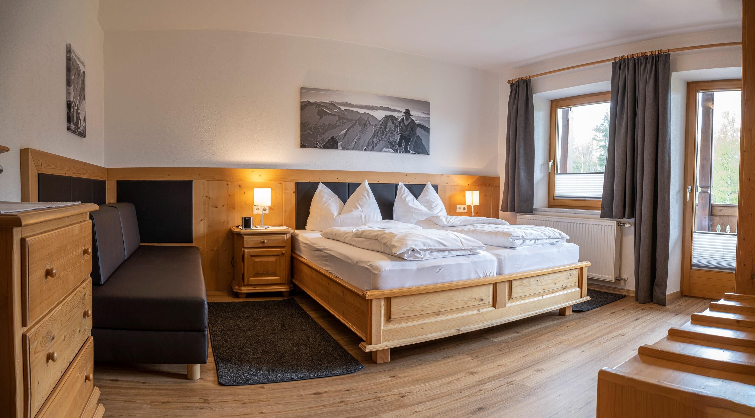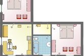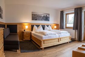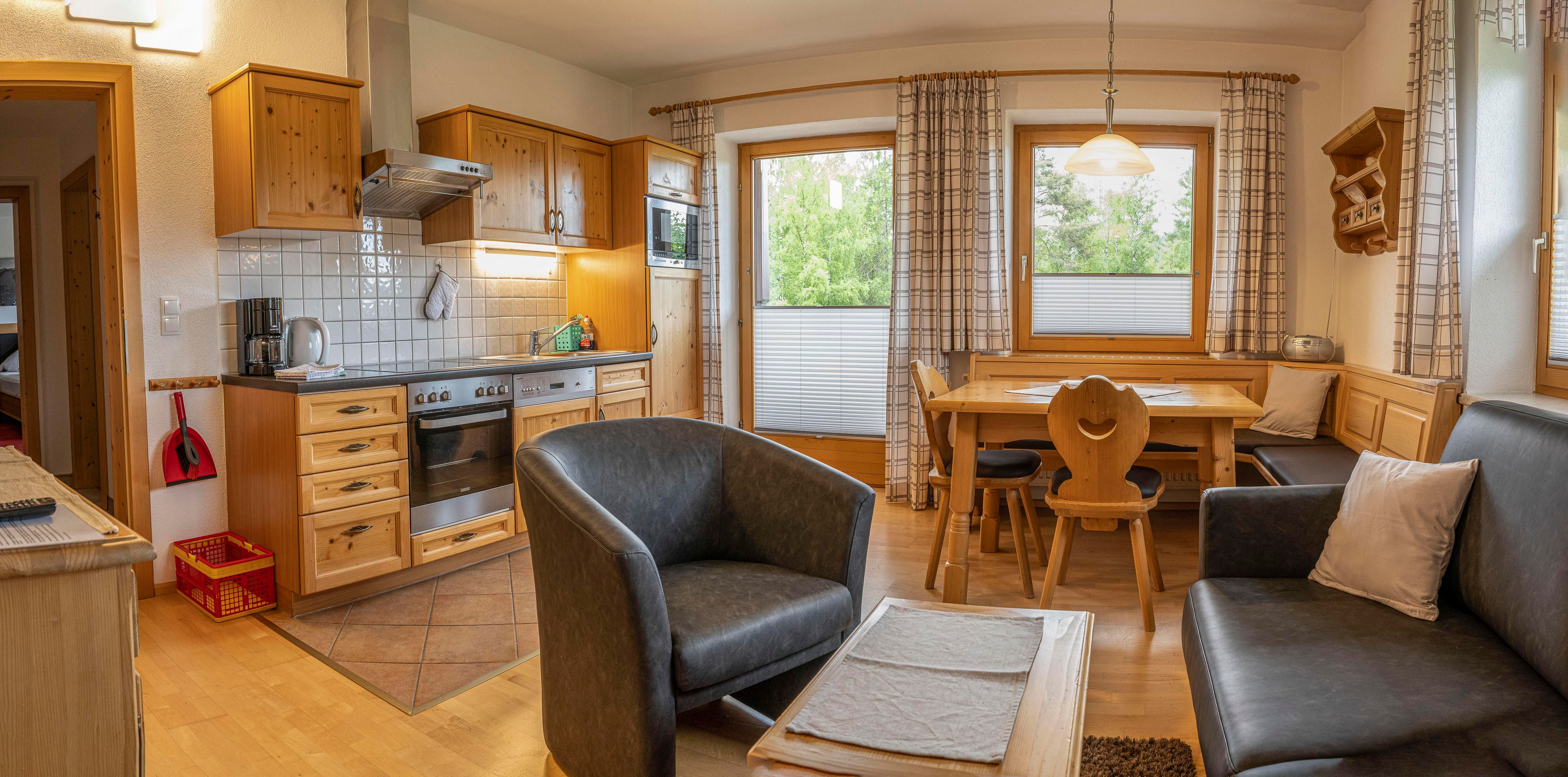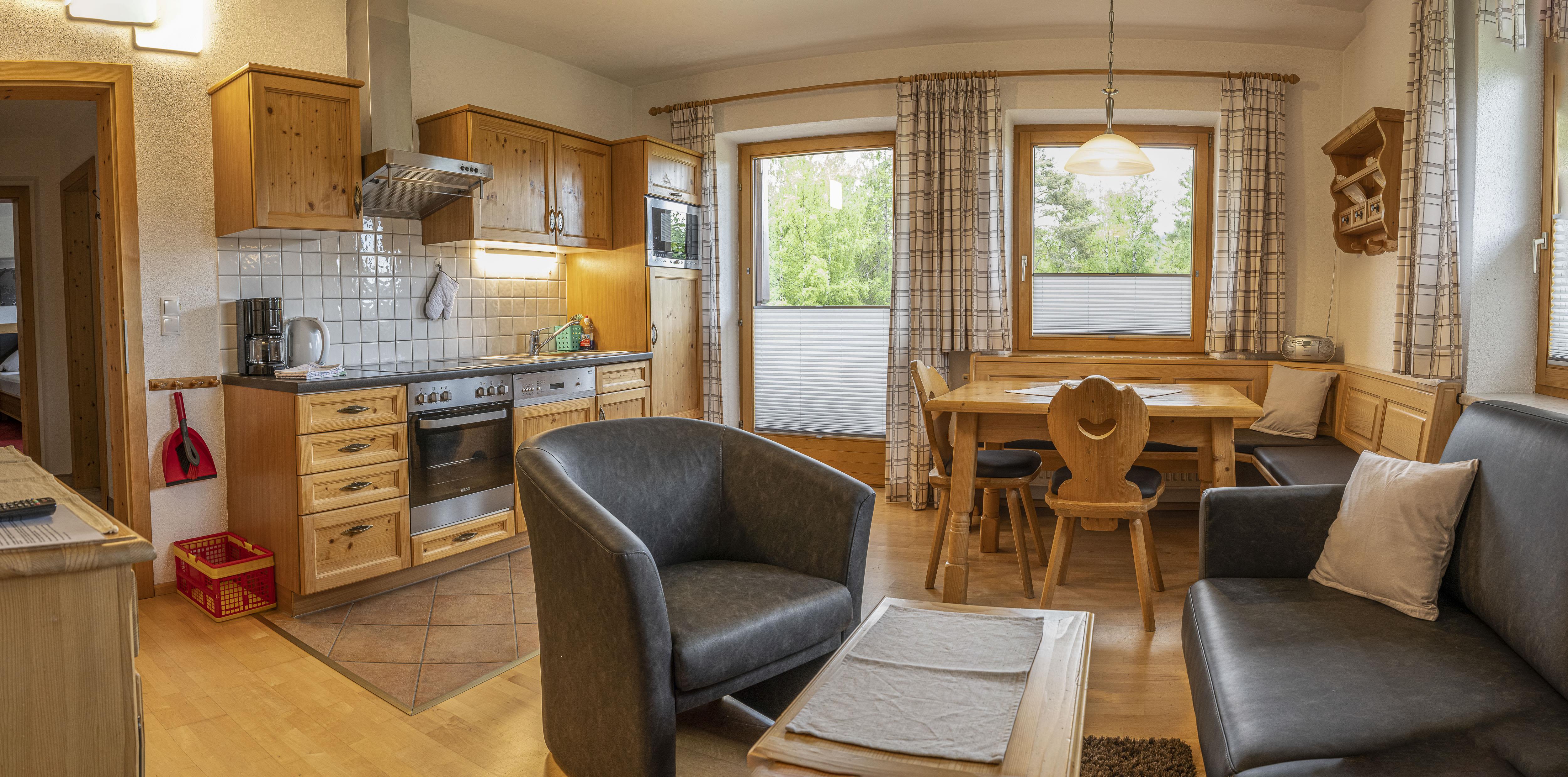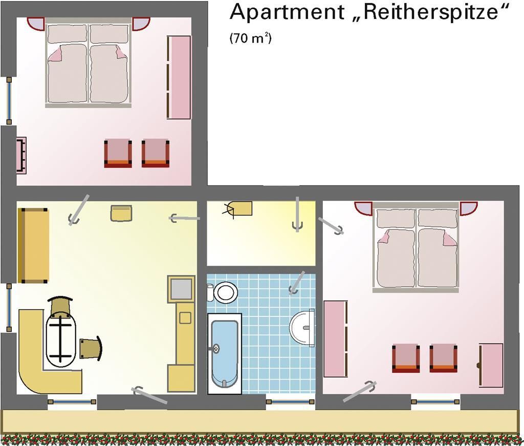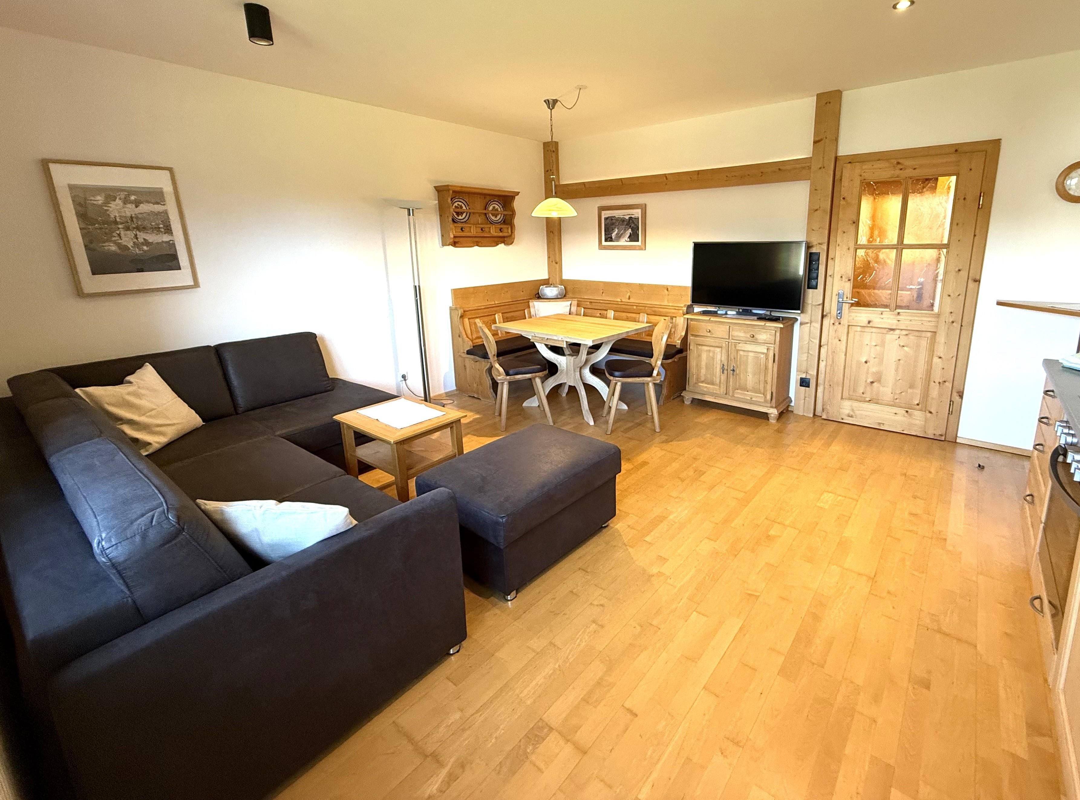 Großzügiges 3-Raum-Apartment (70 m²)im ersten Stock mit Blick auf die 2360 hohe Reitherspitze im Karwendel Gebirge. Wohnzimmer mit Küchenzeile, Essecke und Couch, 2 Schlafzimmer, Süd-Westlage, großer Südbalkon, Badezimmer mit Badewanne und WC, ideal für Familien. Auf Anfrage auch als 2-Raum Apartment für 2 Personen buchbar.