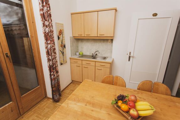 Küche mit Esstisch, Backofen, Herd, Kaffeemaschiene, Wasserkocher