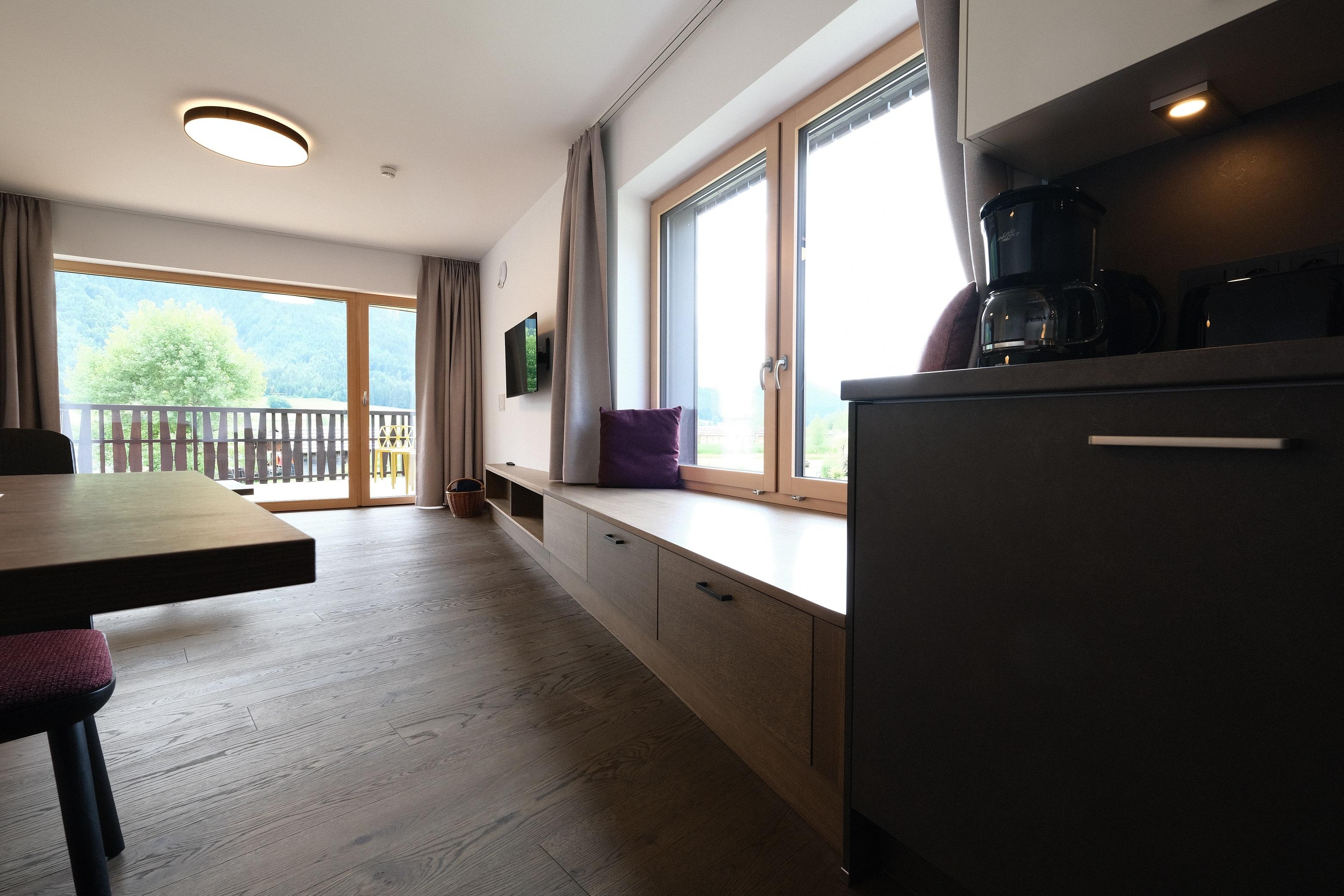 • Wohn-Esszimmer mit Aussichts-Sitzfenster und Zugang zum Panoramabalkon
