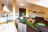 Zwei Schlafzimmer und ein geräumiger Wohnraum bieten bequem Platz für 5 bis 6 Personen. Drei Balkone bieten einen besonderen Rundum-Blick auf den See, die herrliche Landschaft und die bewaldeten Berge der Umgebung – perfekt, um die Natur in vollen Zügen zu genießen.
