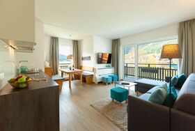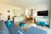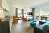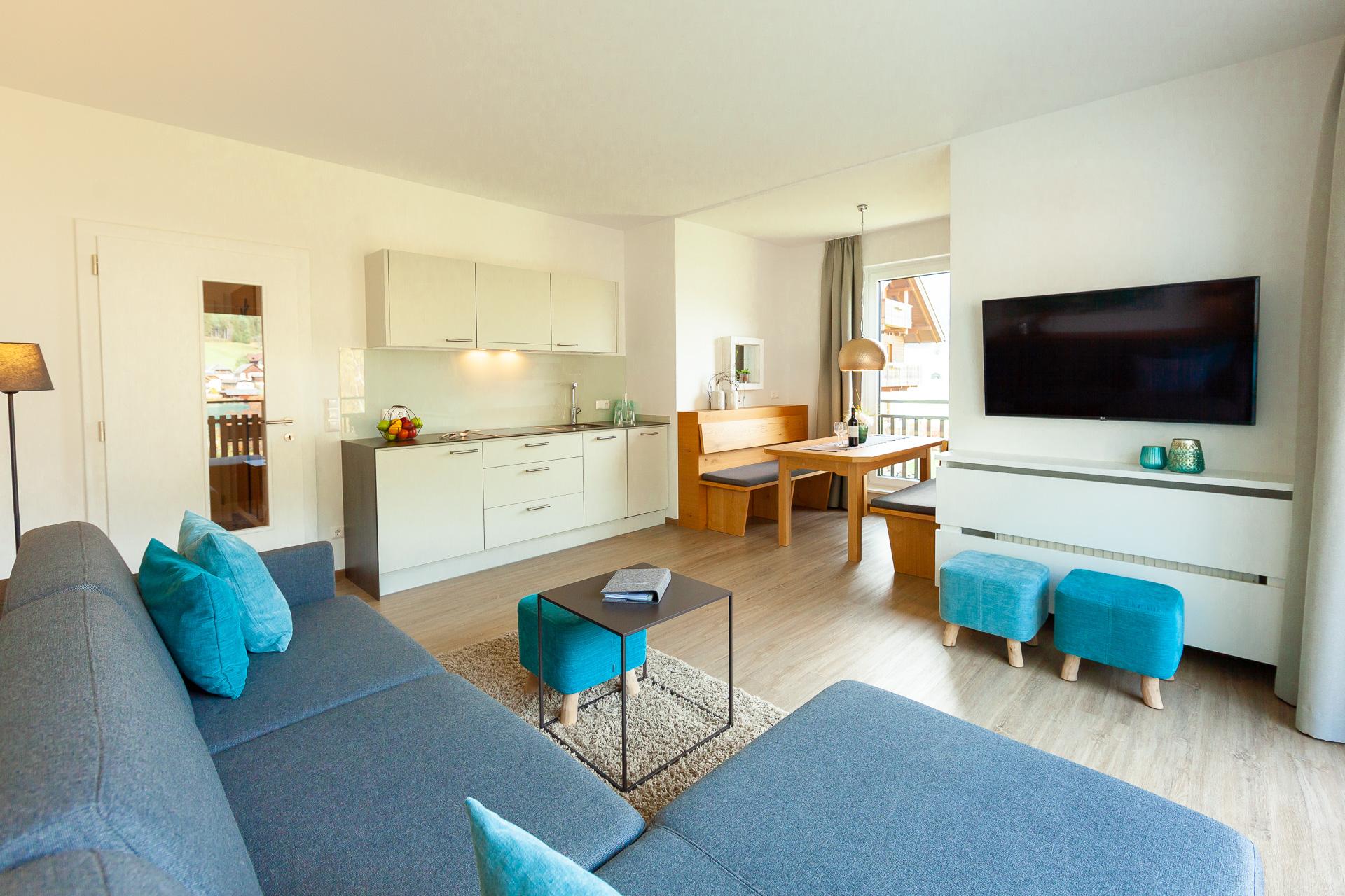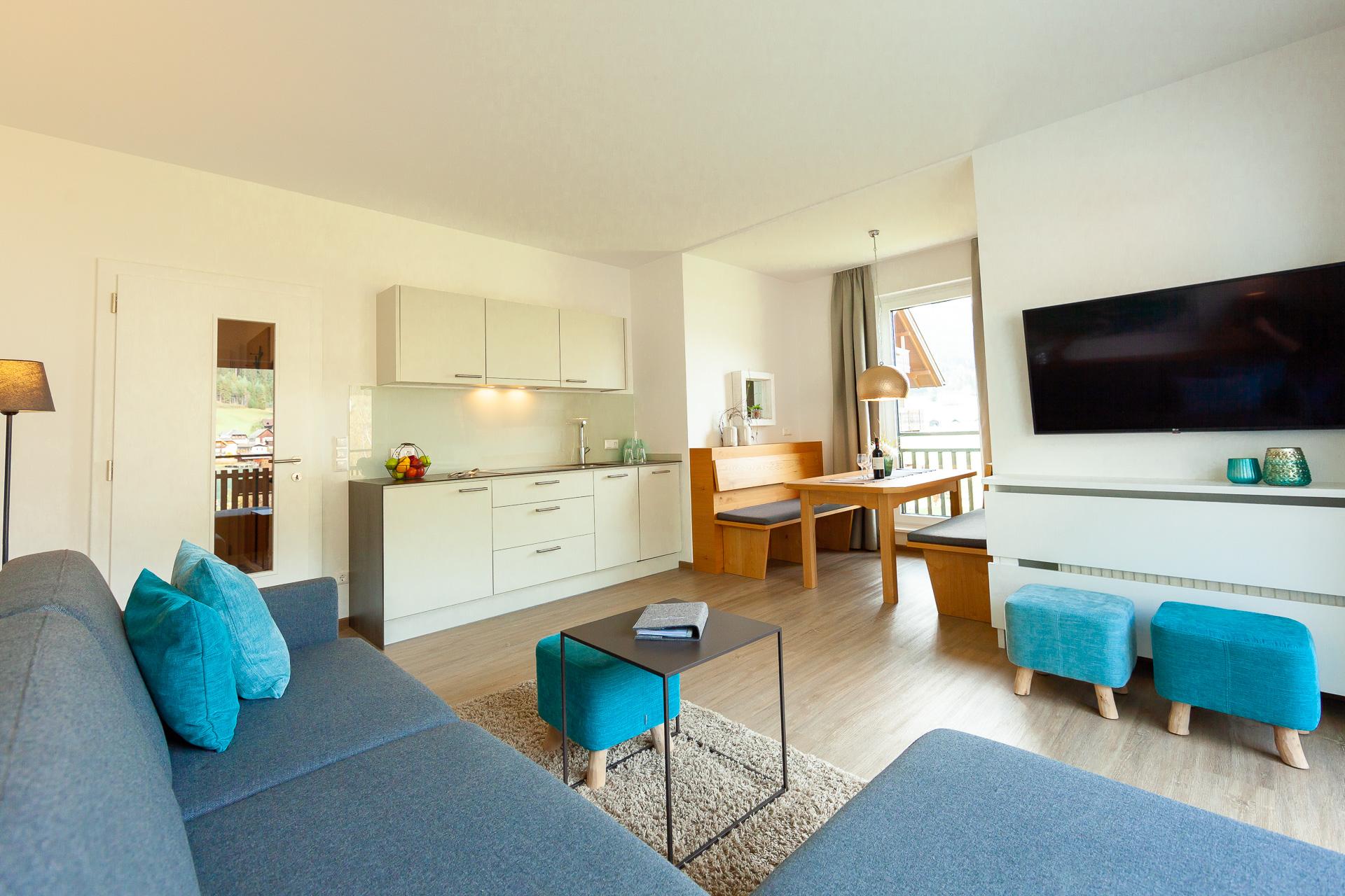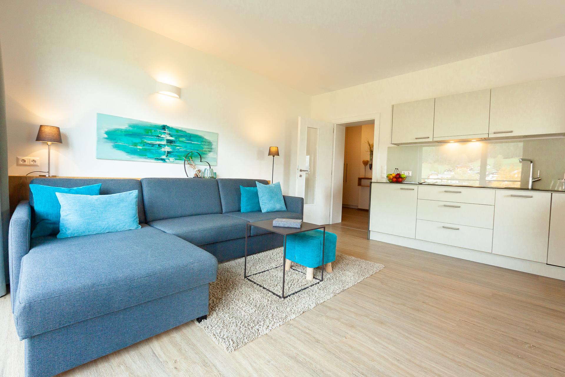 Im Schlafzimmer befindet sich neben dem Doppelbett noch zusätzlich ein bequemes Zustellbett, das einen weiteren Schlafplatz bietet. Der Wohnraum ist offen gestaltet und bietet neben der gut ausgestatteten Küche auch einen gemütlichen Essbereich. Eine große Couch mit Schlaffunktion sorgt für flexible Schlafmöglichkeiten und zusätzlichen Komfort.