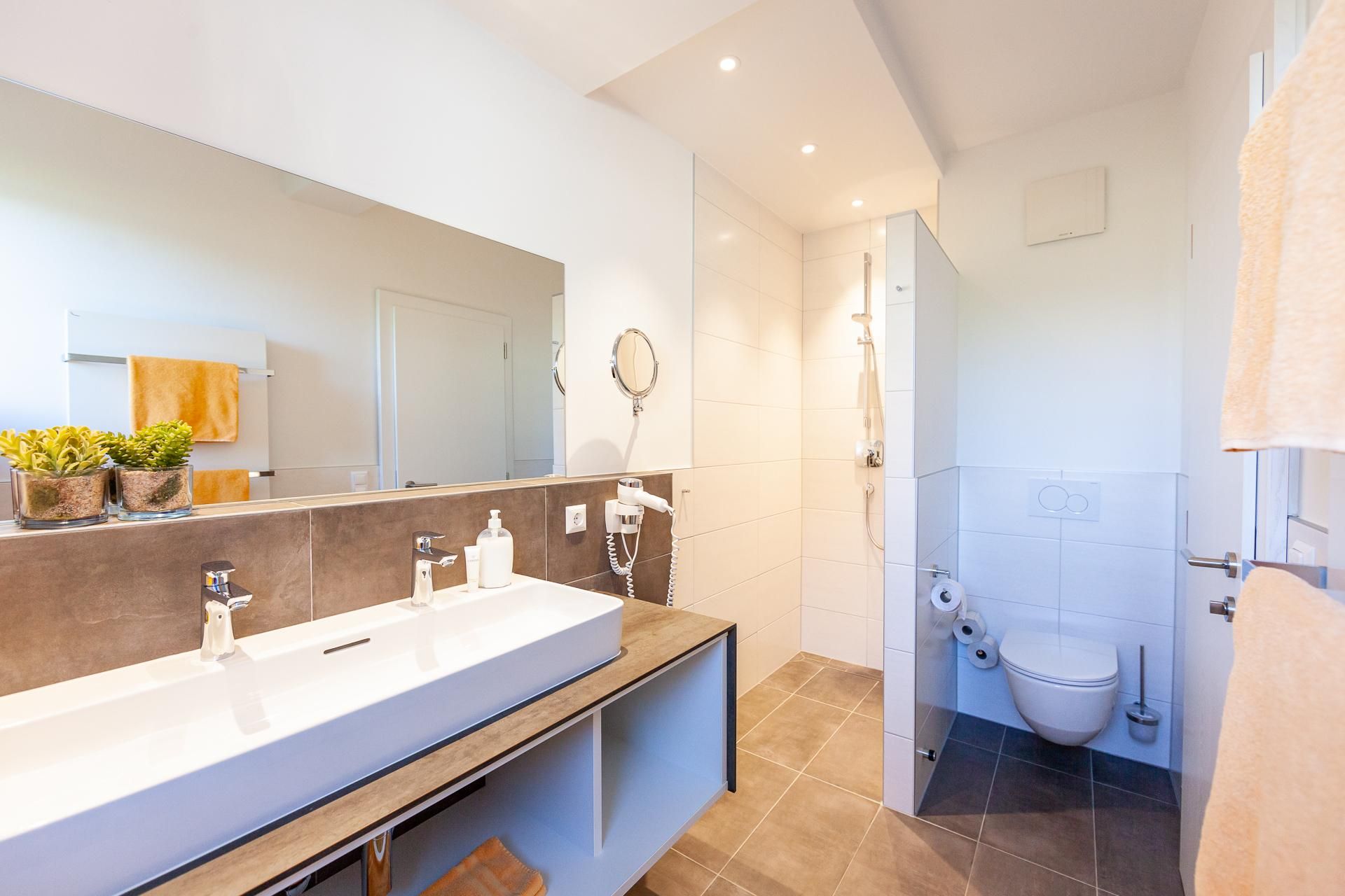 Das Bad ist über eines der Schlafzimmer erreichbar. Es gibt noch ein zweites WC mit Waschbecken, das vom Vorraum aus begehbar ist.