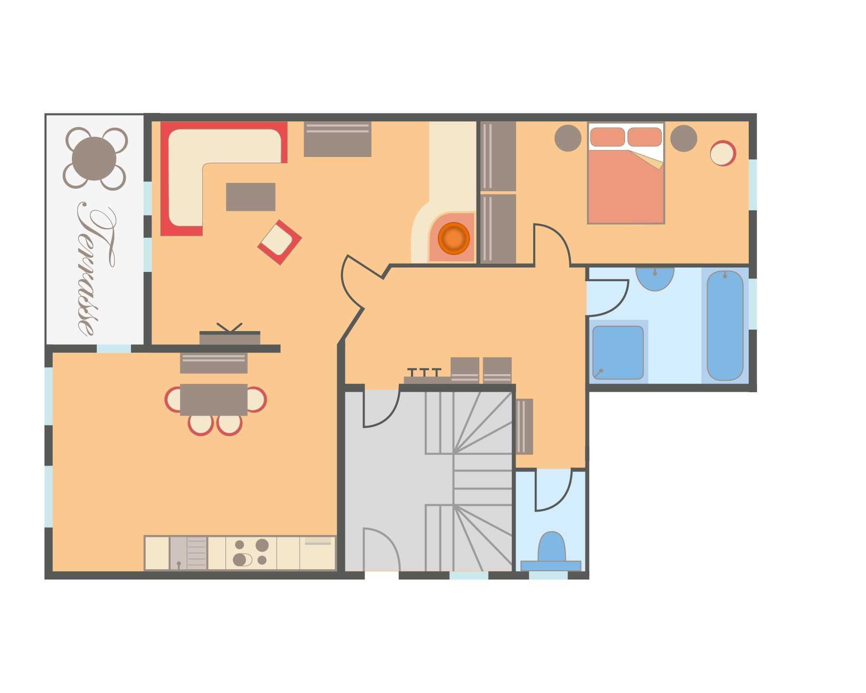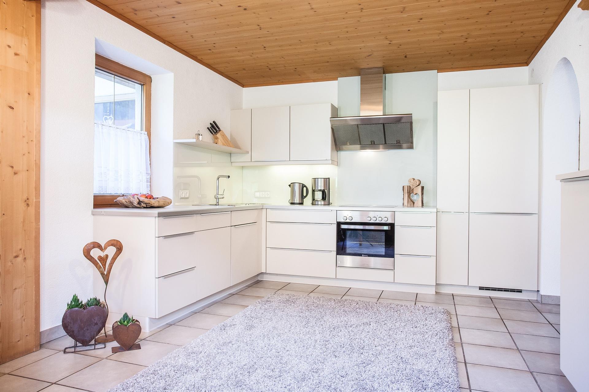 Neu renovierte Ferienwohnung für 2 Personen im alpinen Stil mit 1 Schlafzimmer, Bad mit Dusche und Badewanne und separater Toilette, einem gemütlichen Wohnraum mit Sitzgruppe und Kachelofen, komplett ausgestatteter Küche sowie Terrasse mit kleinem Garten.